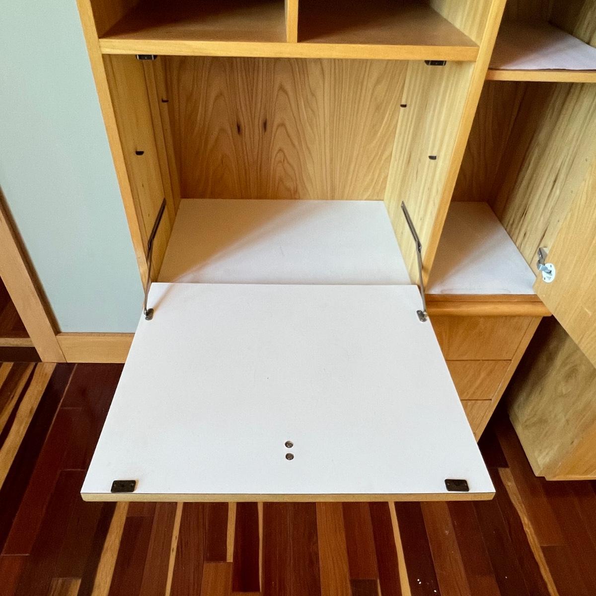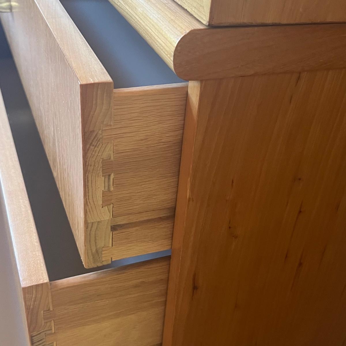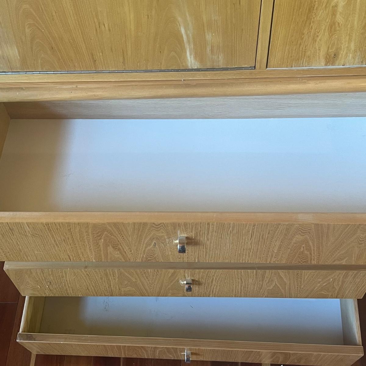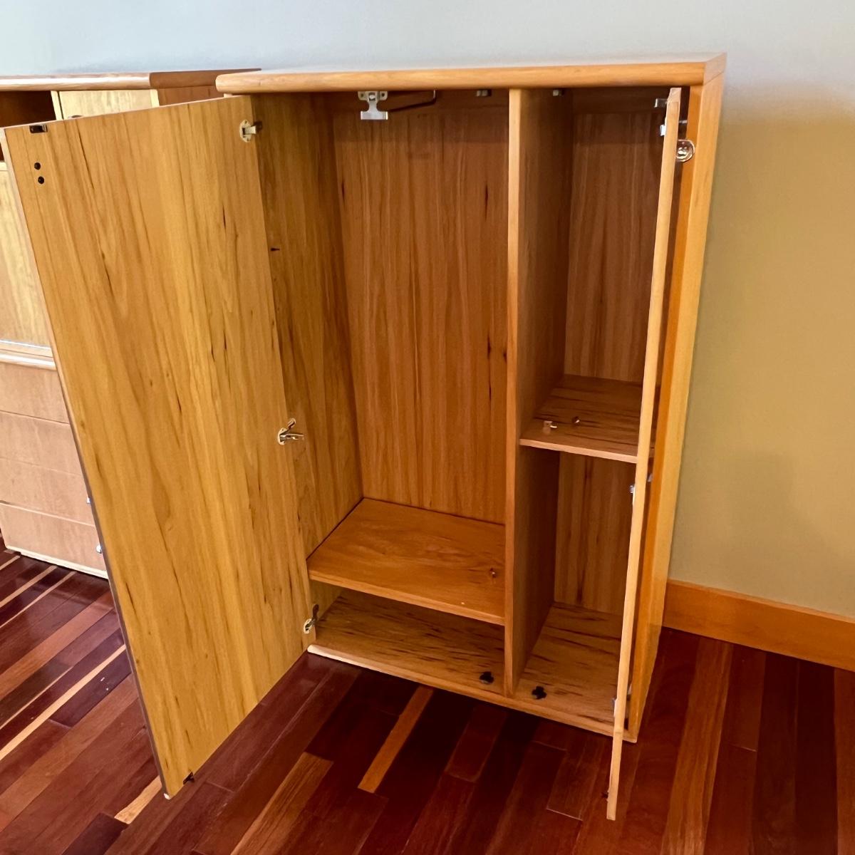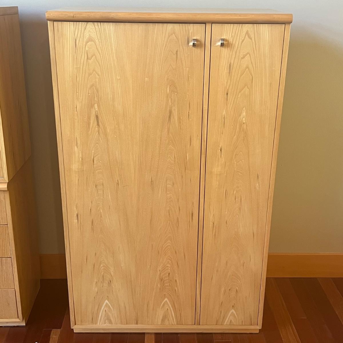 Three pieces of Founders wooden furniture includes a four drawer dresser, office unit with built in desk and a small wardrobe. The dresser and desk are currently stacked. There are a few minor nicks shown in images. Note the makers mark was found on just one unit but the other two appear to match and have identical hardware. Wardrobe measures 33” x 15” x 55.5”H.