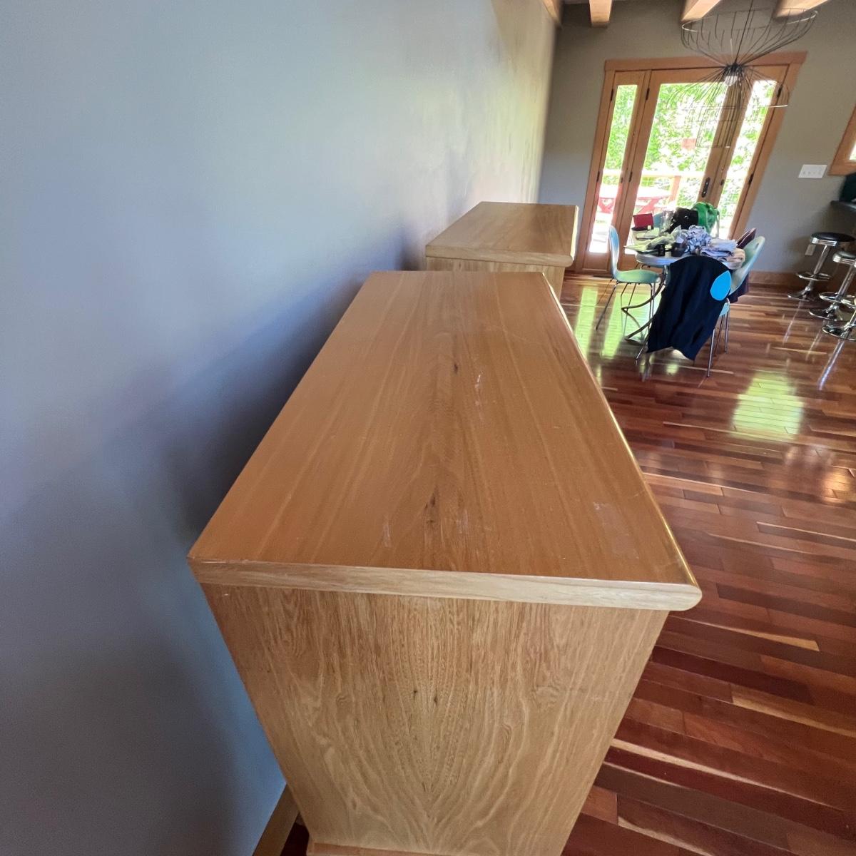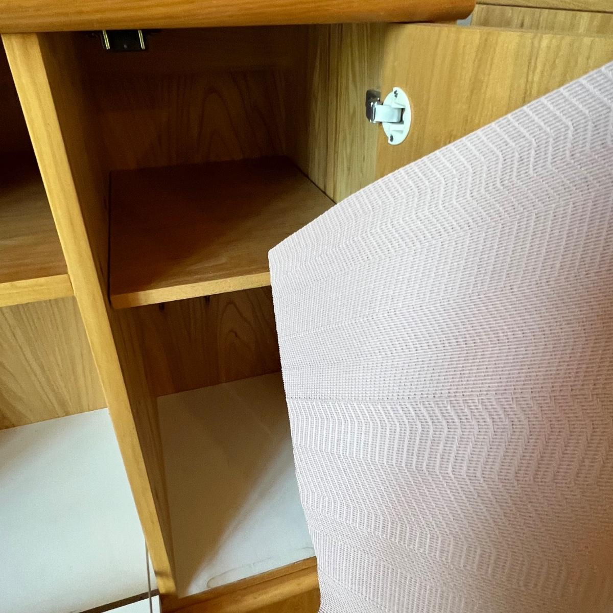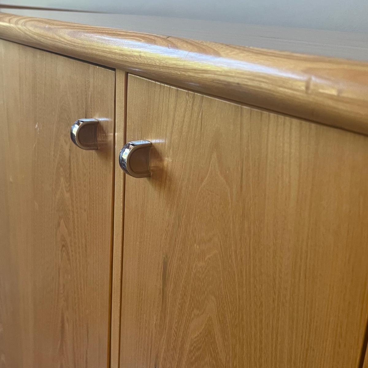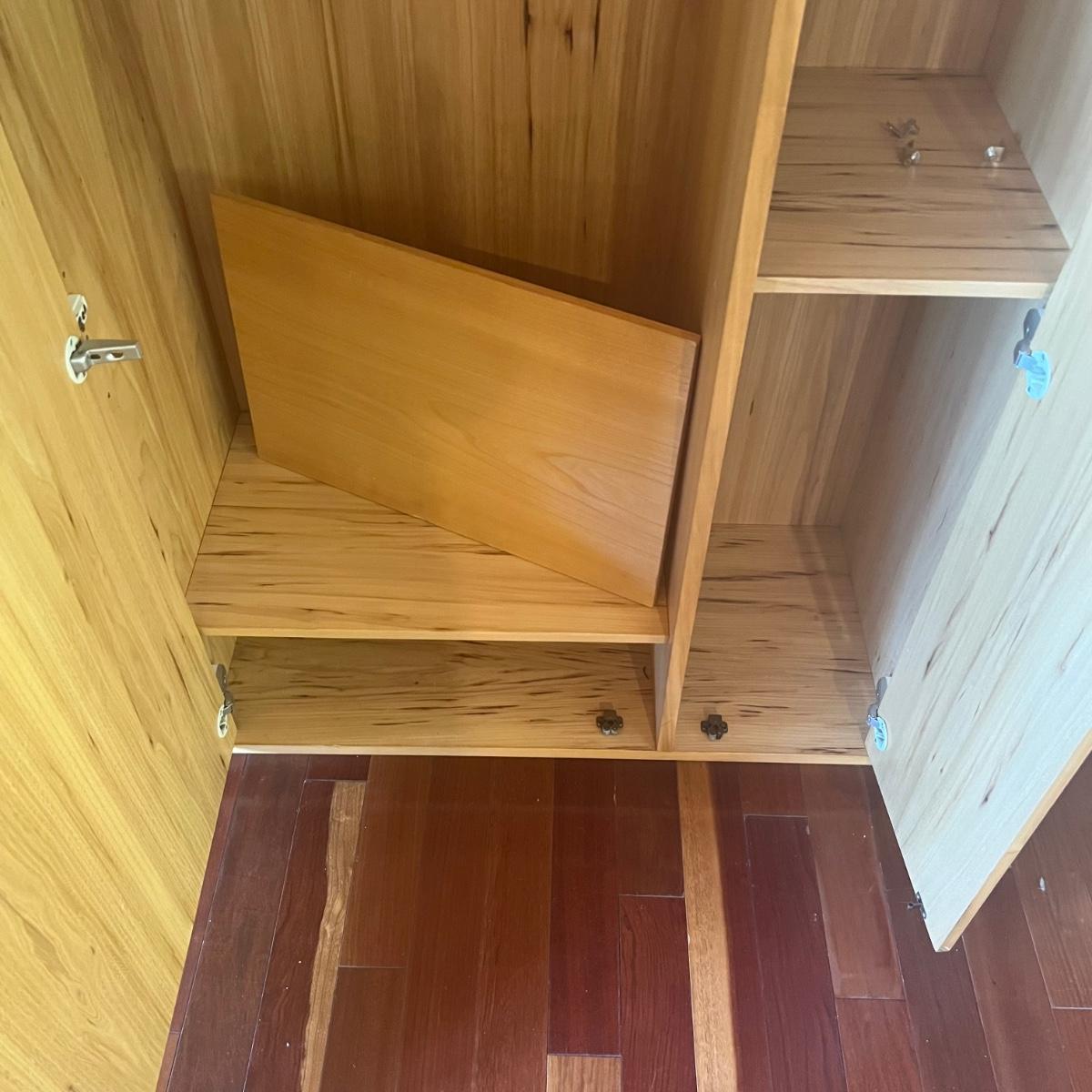 Three pieces of Founders wooden furniture includes a four drawer dresser, office unit with built in desk and a small wardrobe. The dresser and desk are currently stacked. There are a few minor nicks shown in images. Note the makers mark was found on just one unit but the other two appear to match and have identical hardware. Wardrobe measures 33” x 15” x 55.5”H.
