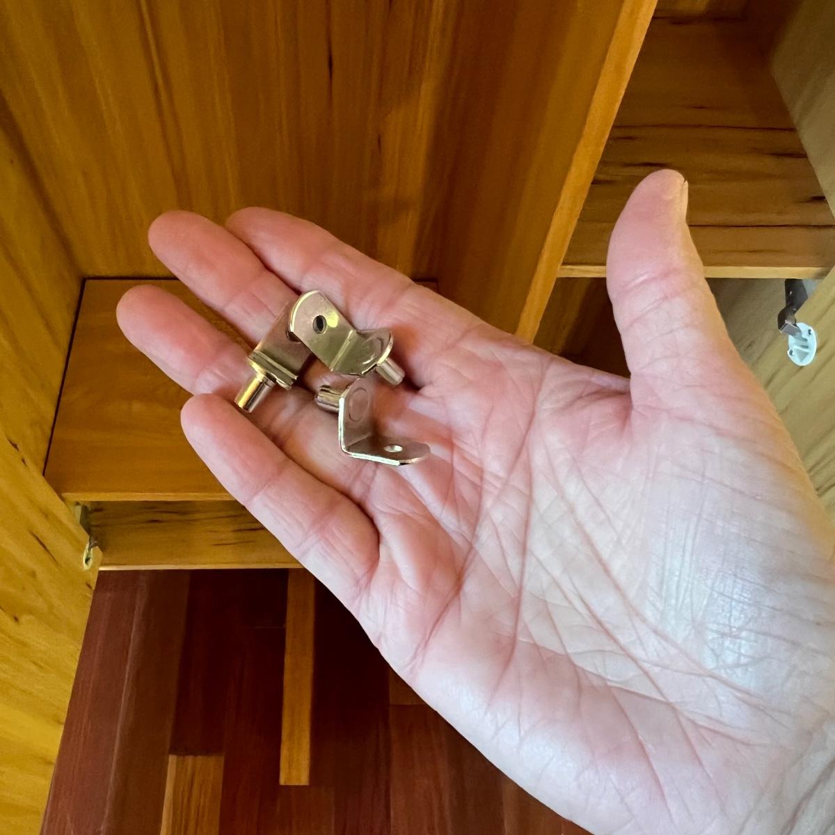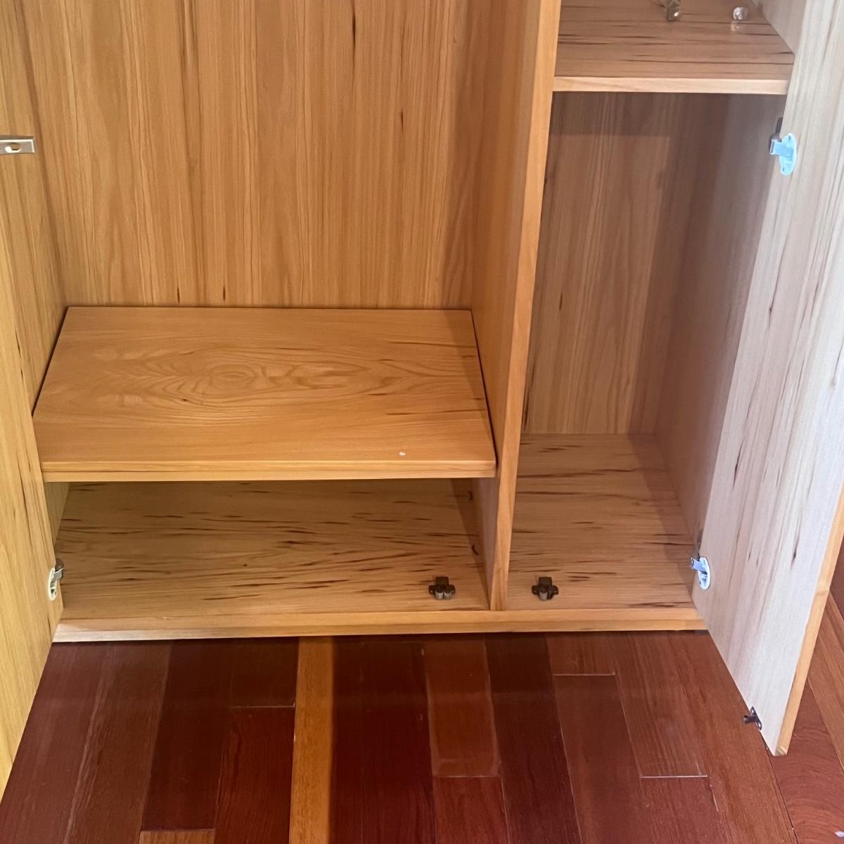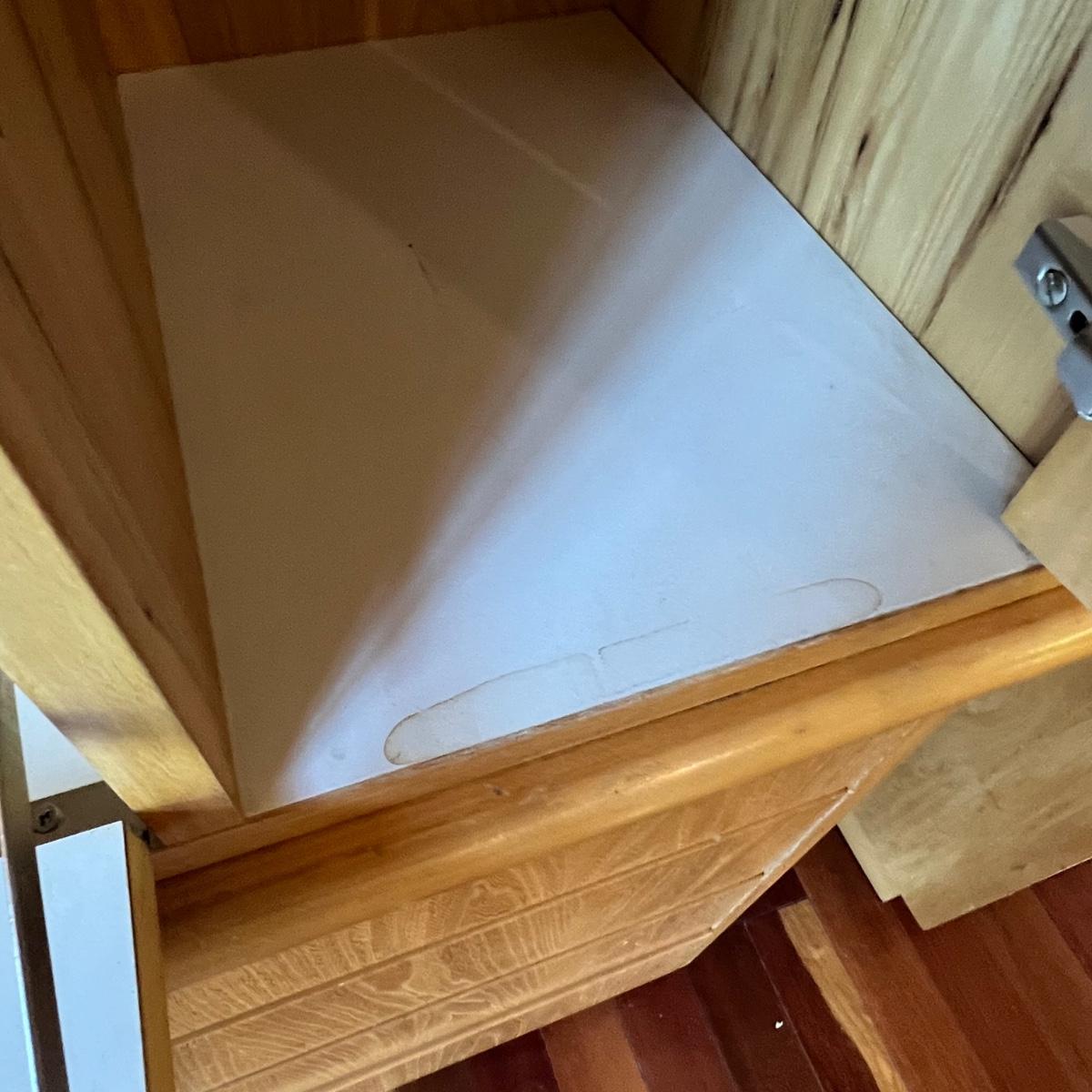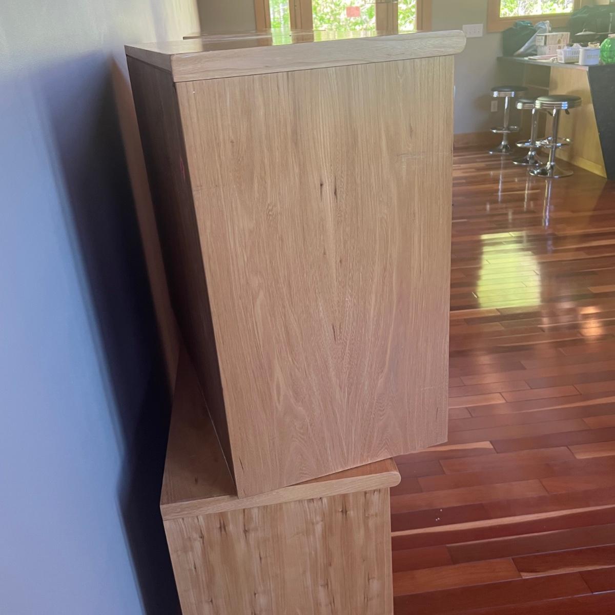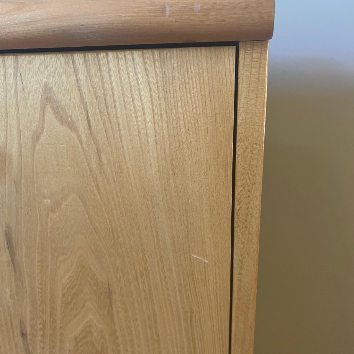 Three pieces of Founders wooden furniture includes a four drawer dresser, office unit with built in desk and a small wardrobe. The dresser and desk are currently stacked. There are a few minor nicks shown in images. Note the makers mark was found on just one unit but the other two appear to match and have identical hardware. Wardrobe measures 33” x 15” x 55.5”H.