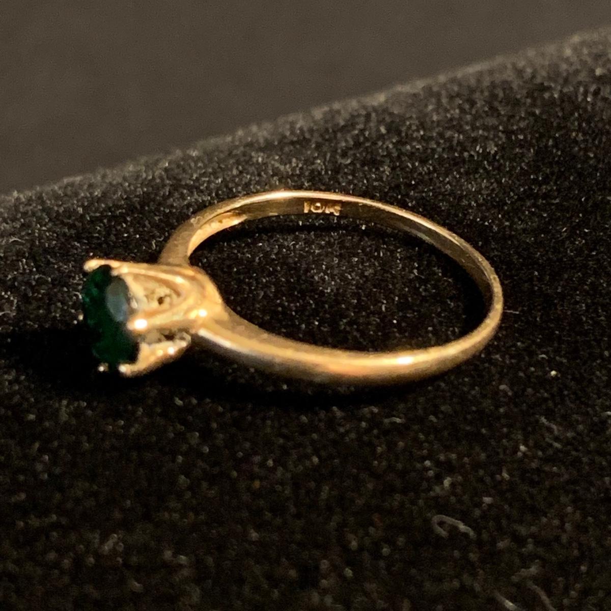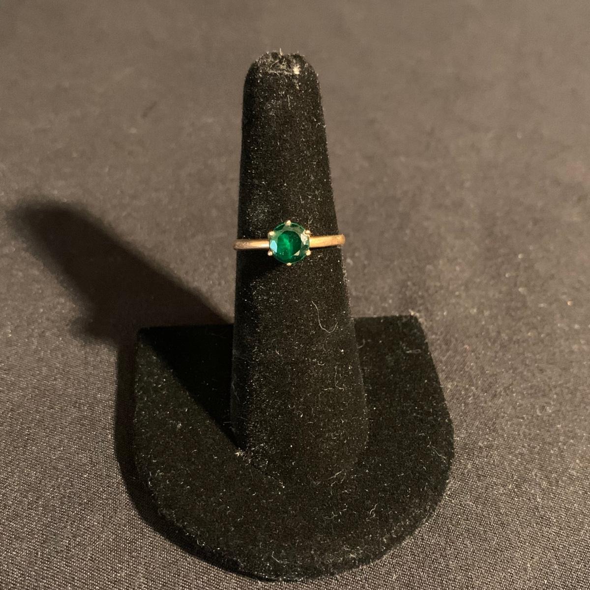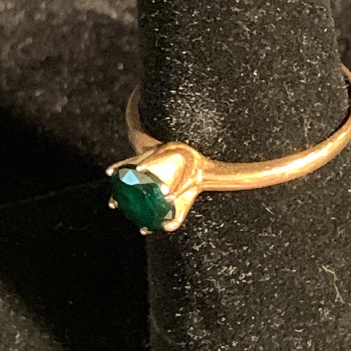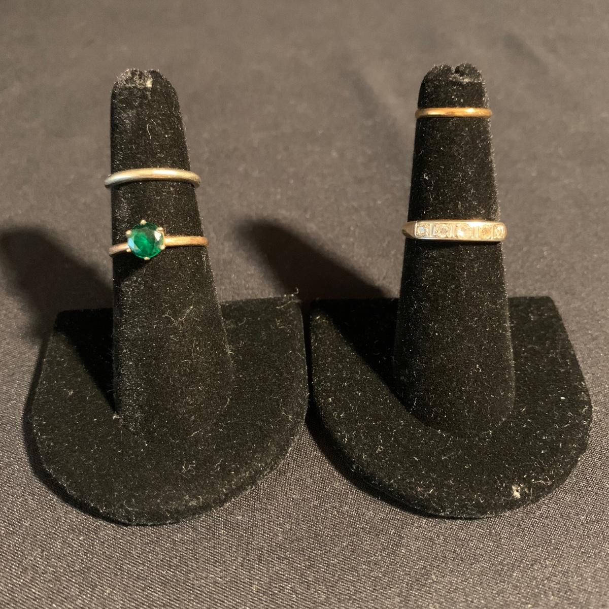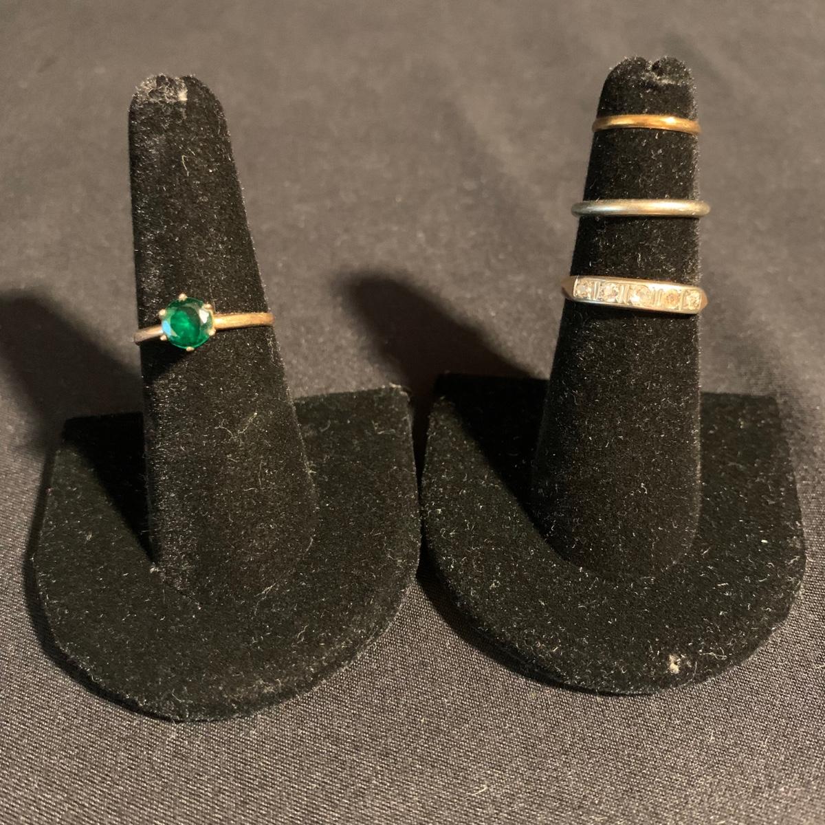 Four rings. The ring with the emerald green colored stone is marked 10K. It has some residue behind the gemstone that needs a little cleaning. The one with the five sparkly clear gemstones is marked 14K and has the initials “BR” circled. Two of these gemstones tested as diamonds. The white gold band is marked ”14K Artcarved”. The baby ring is marked “BDA 10K”. Shipping available.
