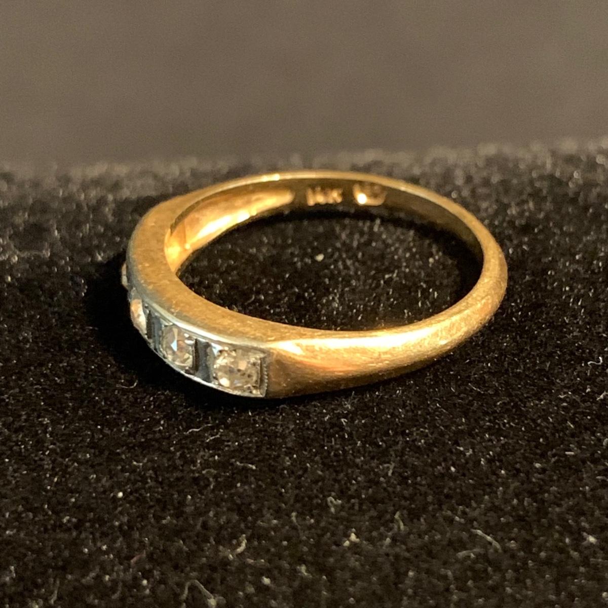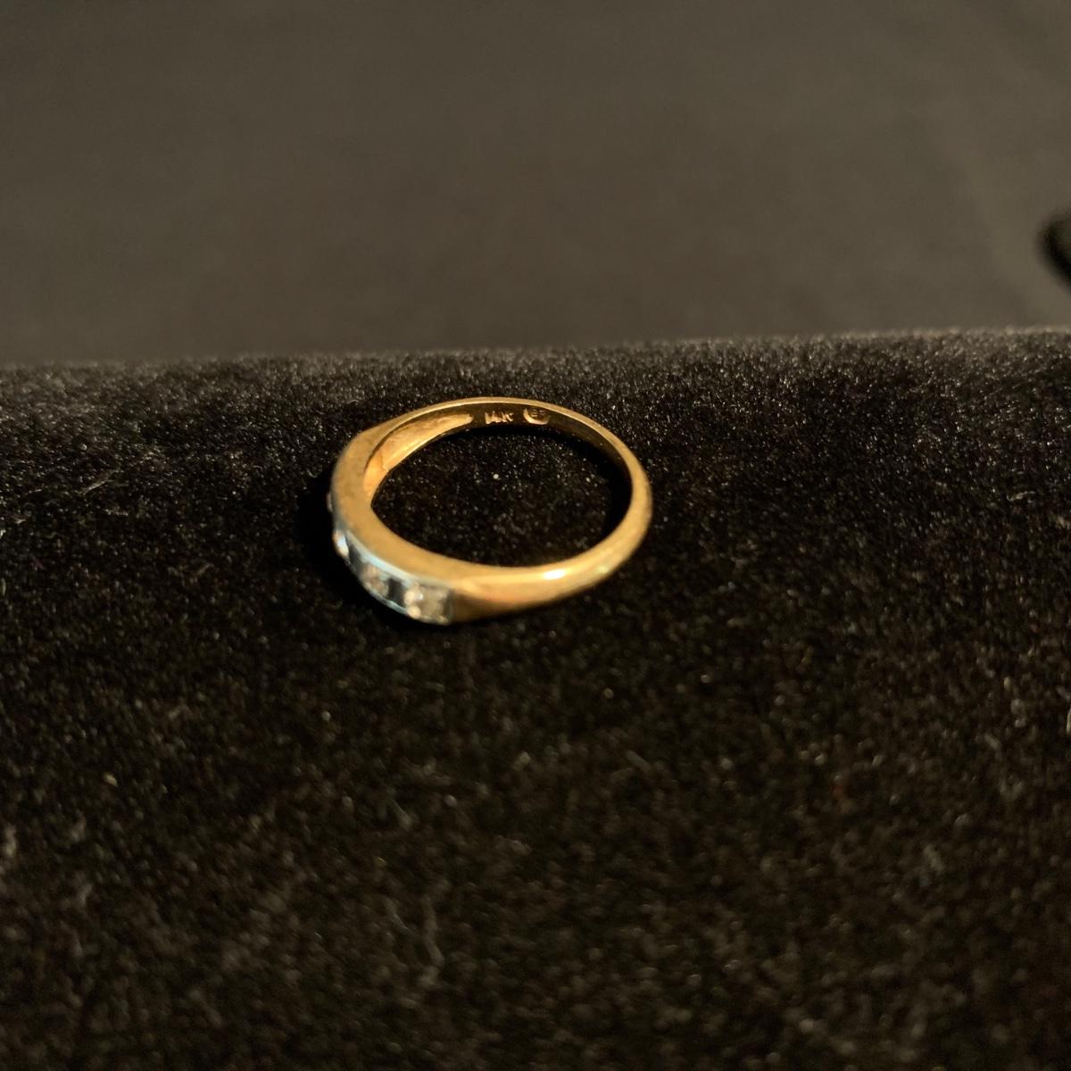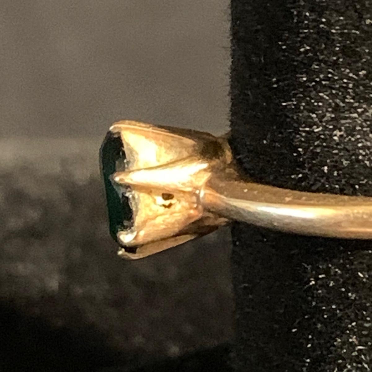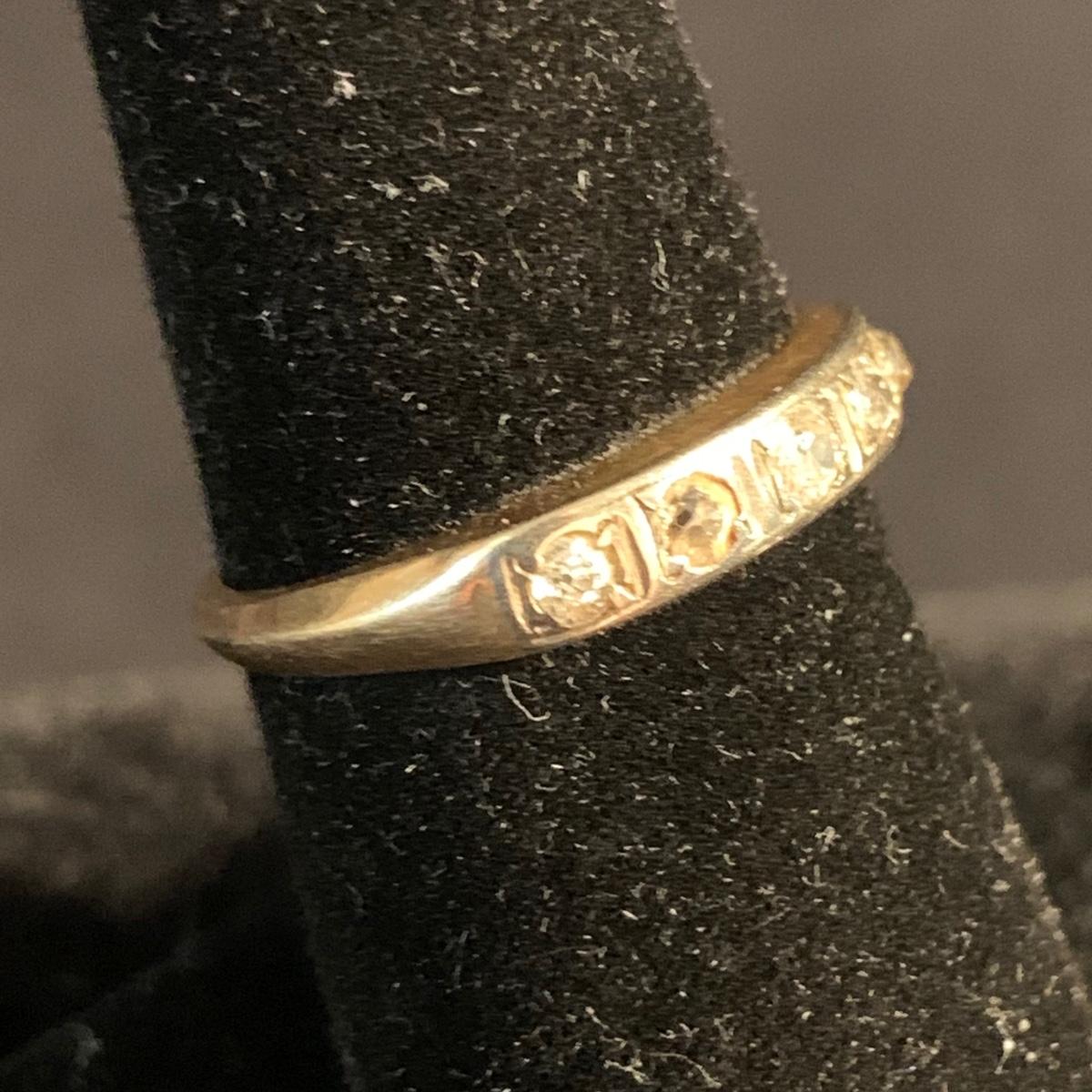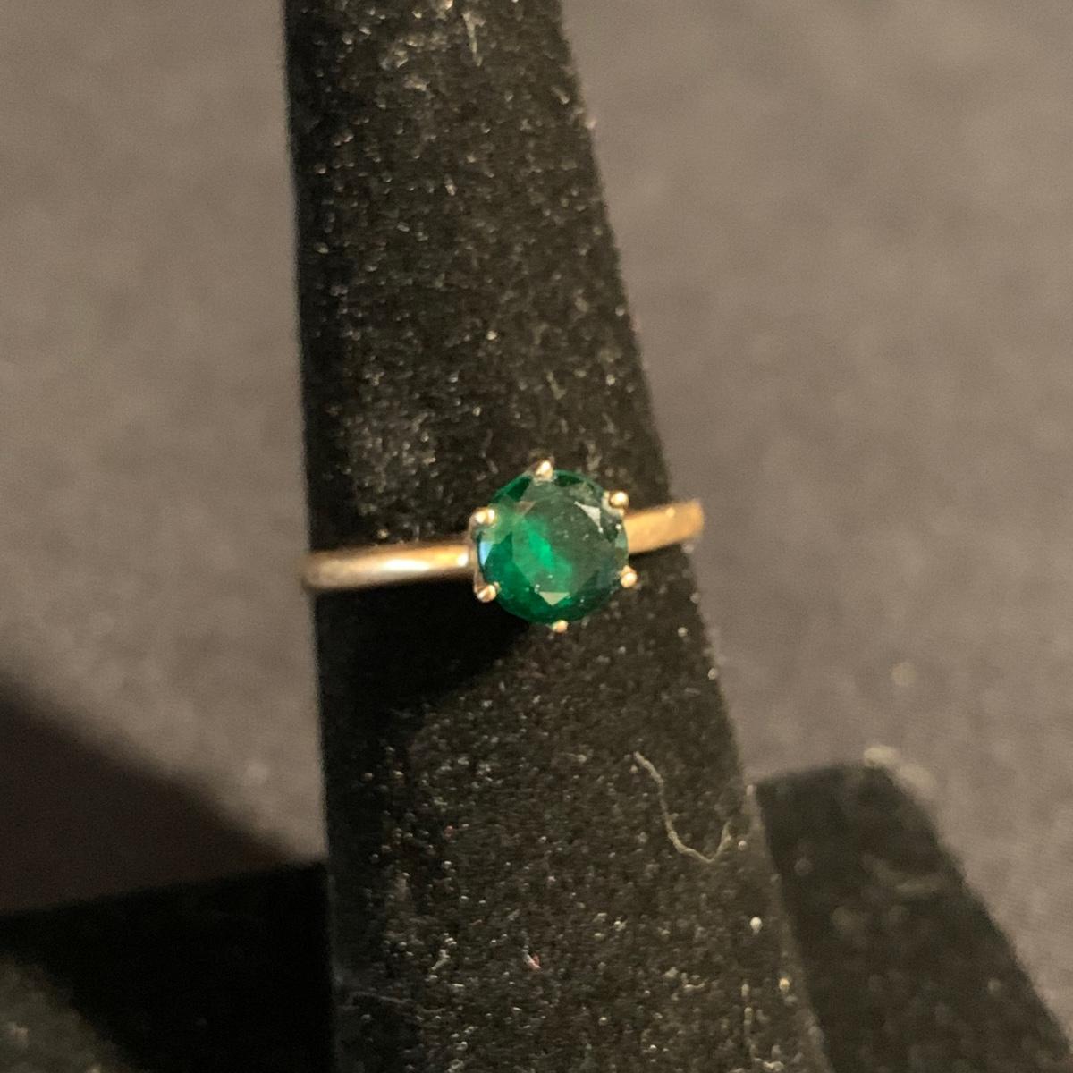 Four rings. The ring with the emerald green colored stone is marked 10K. It has some residue behind the gemstone that needs a little cleaning. The one with the five sparkly clear gemstones is marked 14K and has the initials “BR” circled. Two of these gemstones tested as diamonds. The white gold band is marked ”14K Artcarved”. The baby ring is marked “BDA 10K”. Shipping available.