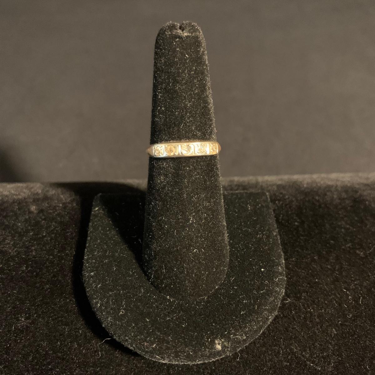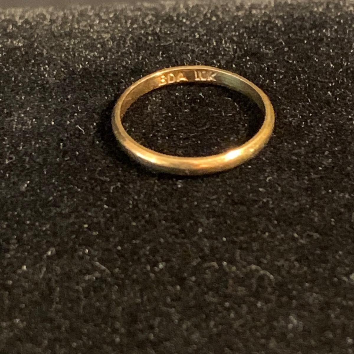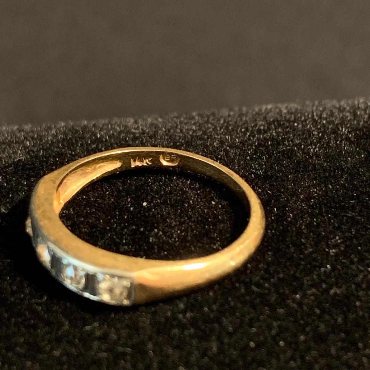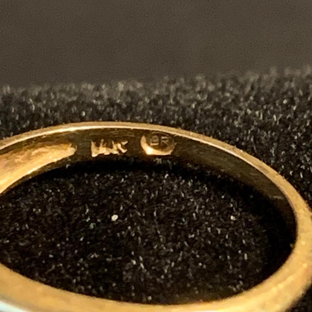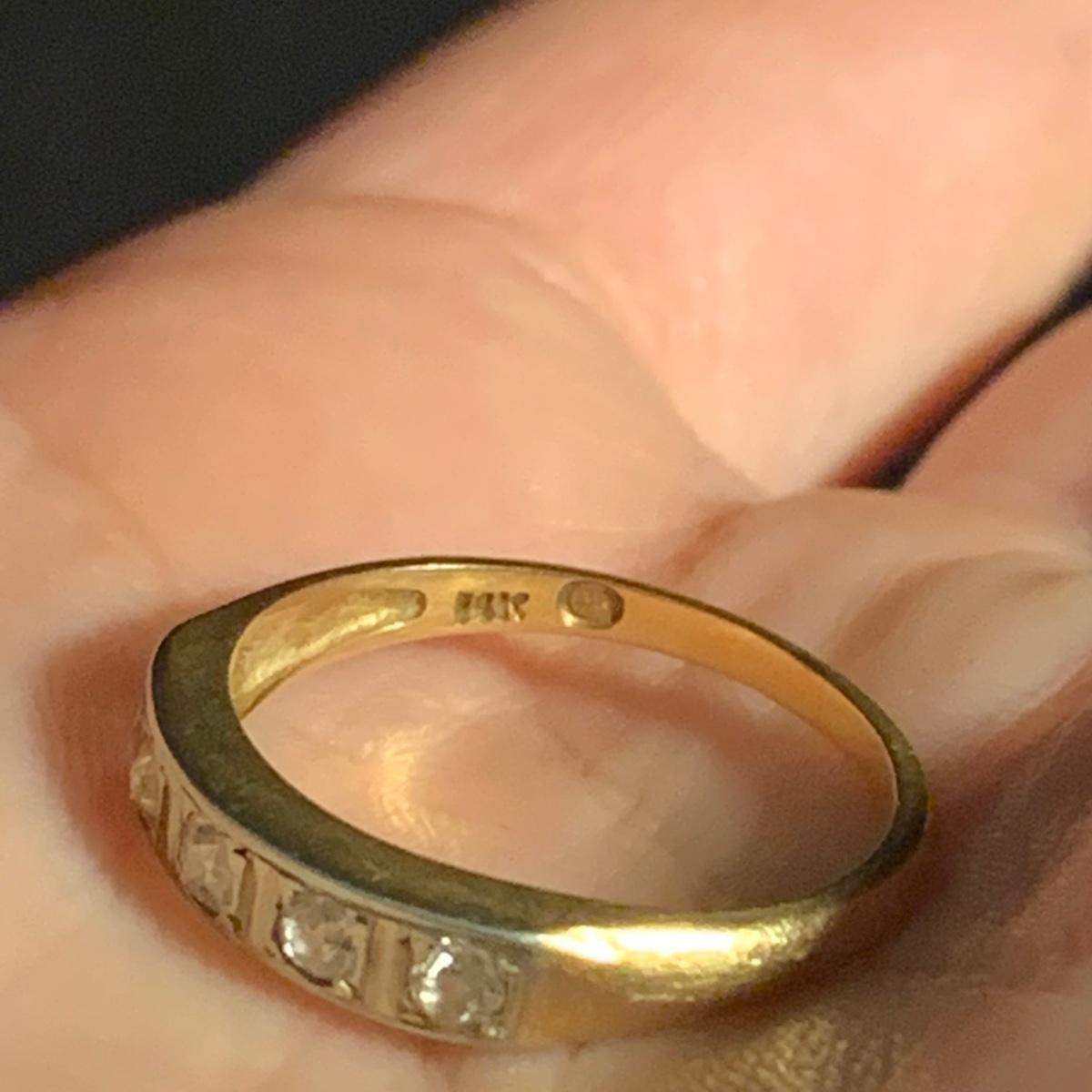 Four rings. The ring with the emerald green colored stone is marked 10K. It has some residue behind the gemstone that needs a little cleaning. The one with the five sparkly clear gemstones is marked 14K and has the initials “BR” circled. Two of these gemstones tested as diamonds. The white gold band is marked ”14K Artcarved”. The baby ring is marked “BDA 10K”. Shipping available.