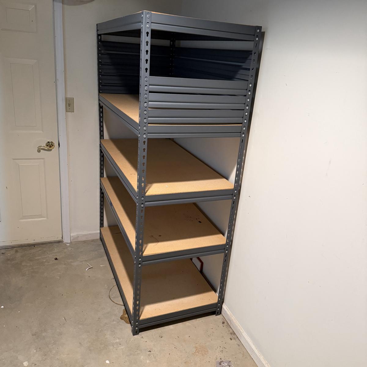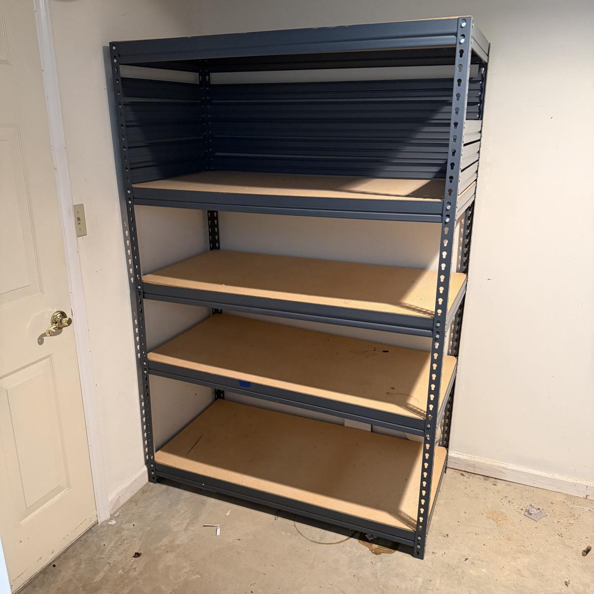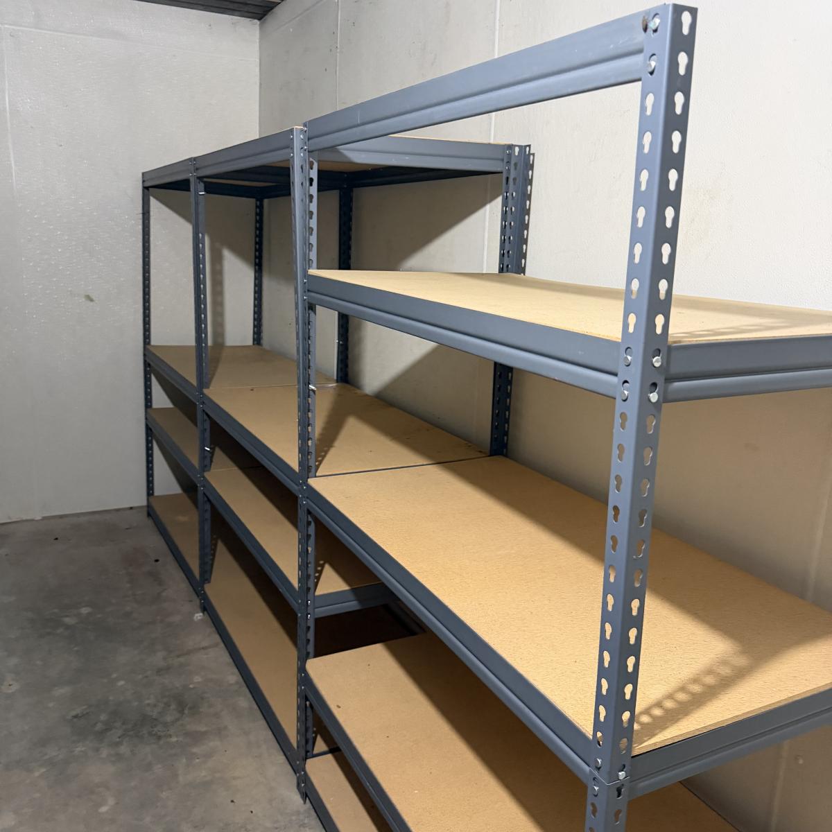 Lot includes four 24” x 48” x 72”H metal shelving units with pressed wood shelves. Three of the units are bolted together and will need to be taken apart by winning bidder.