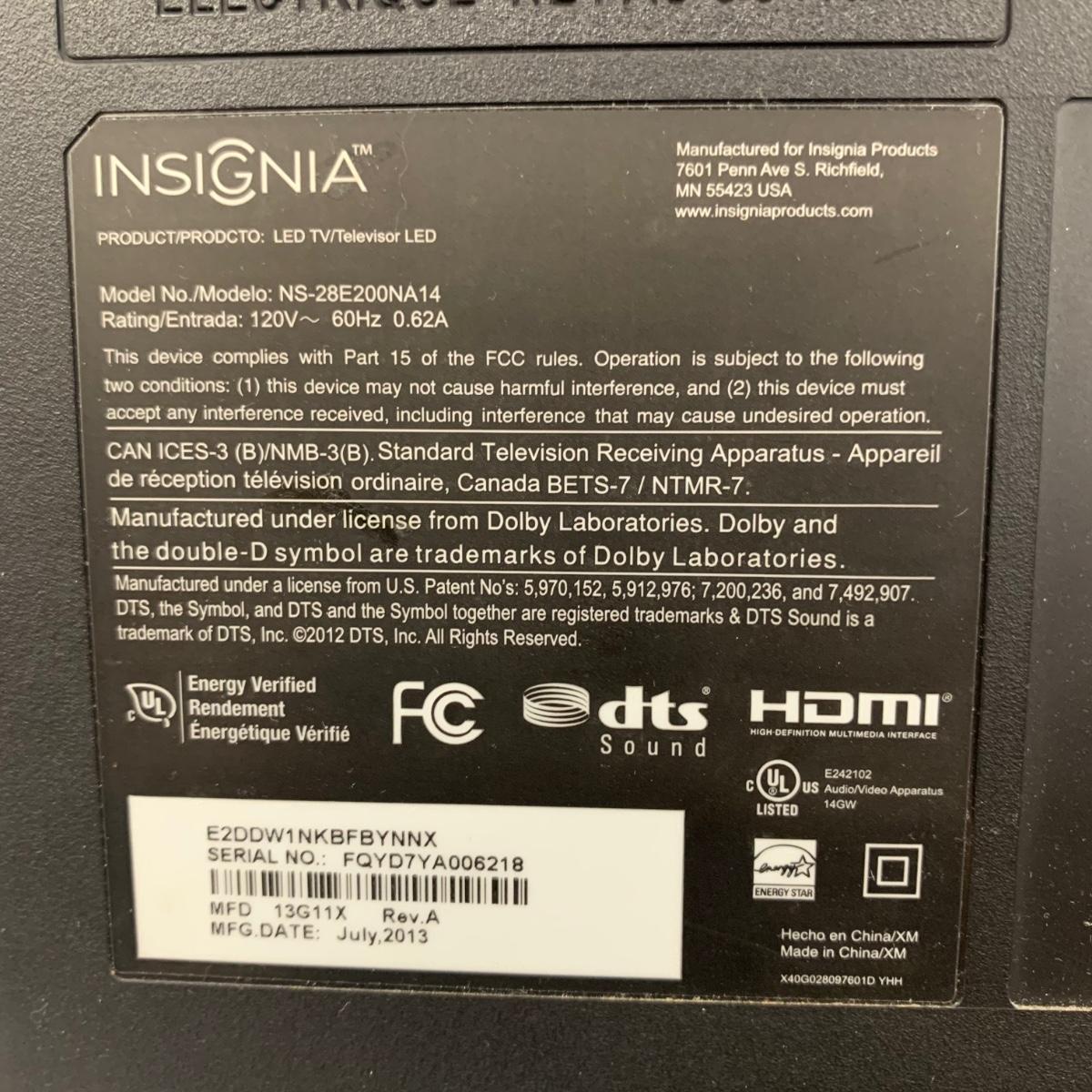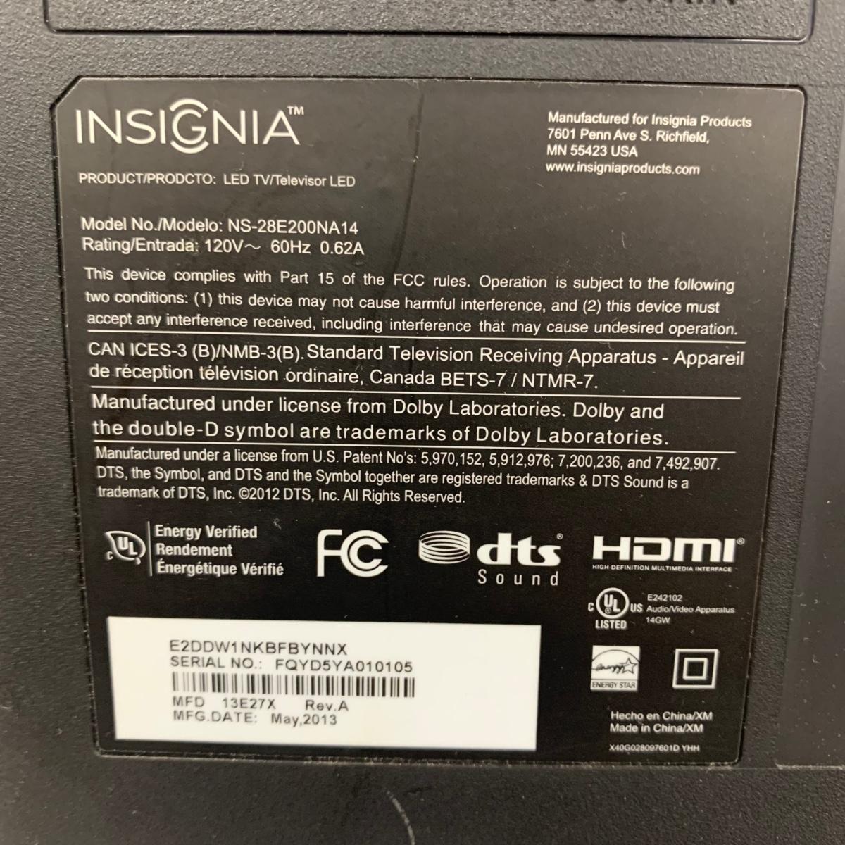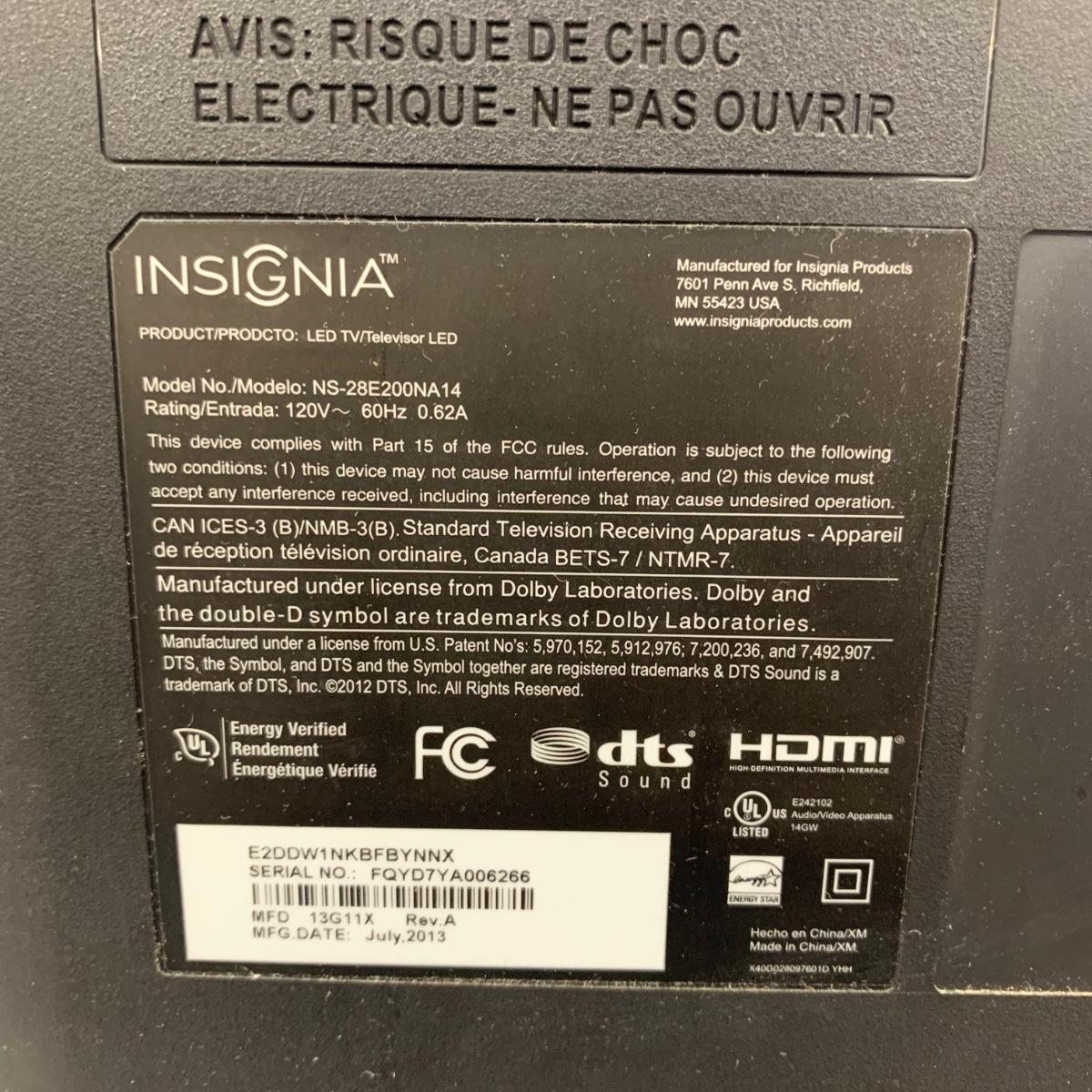 This lot includes four 27” screen Insignia brand LED TVs, Model No. NS-28E200NA14. Each TV comes with a power cord. All have mounts, but some appear to have broken pieces. We cannot verify that all mount parts needed are included. TV screens are quite dirty and need a thorough cleaning. Local pickup only.