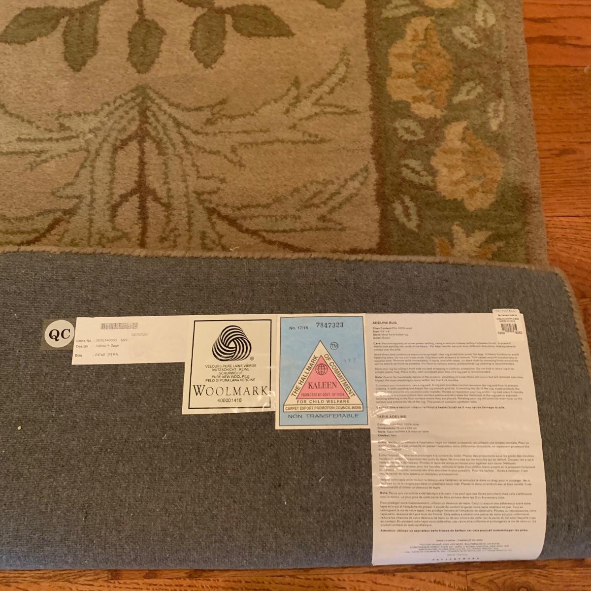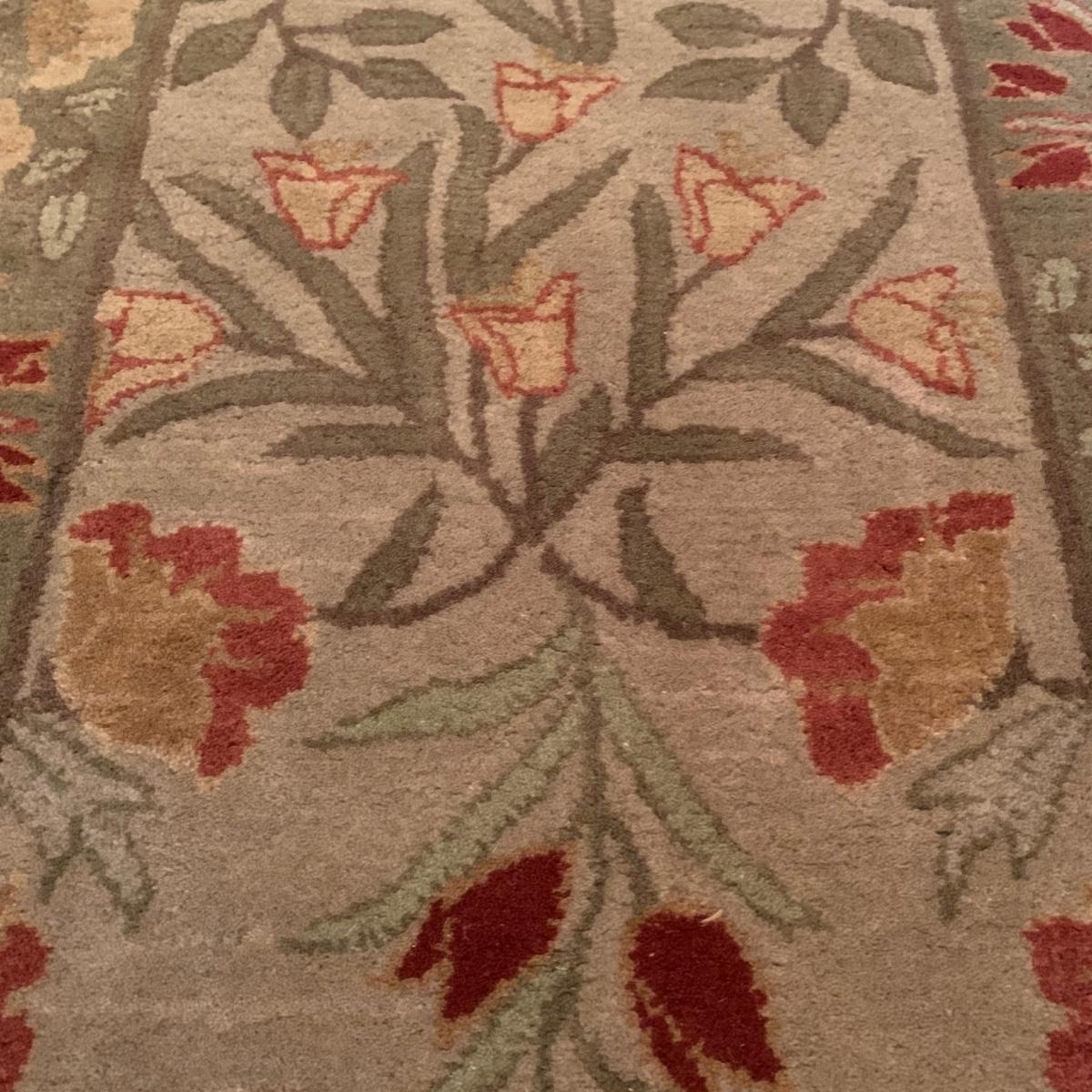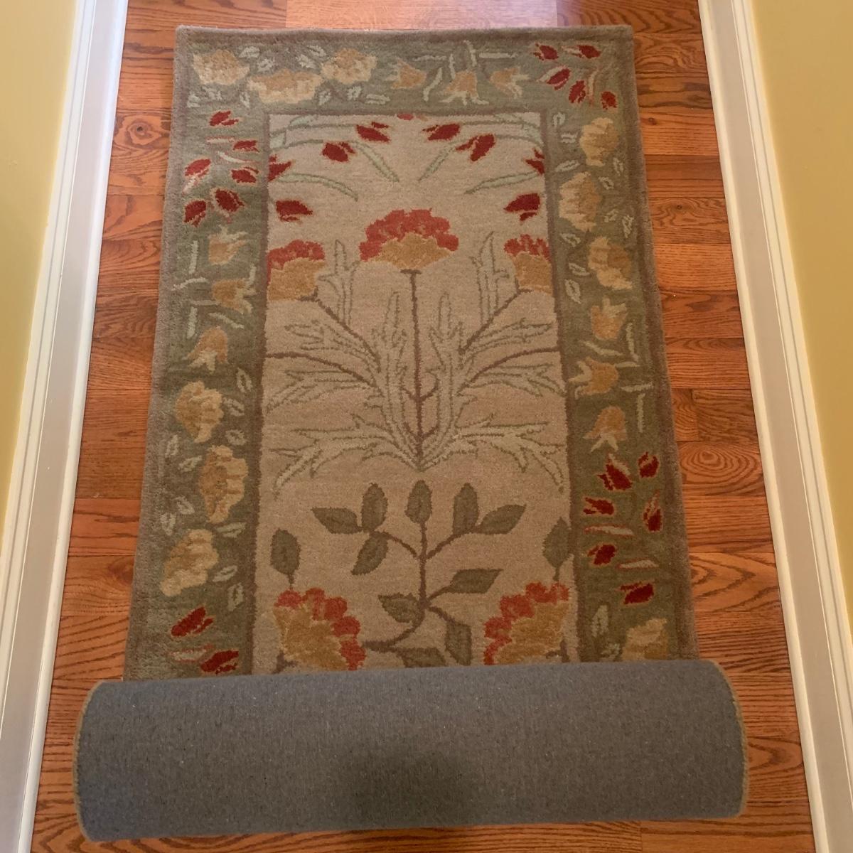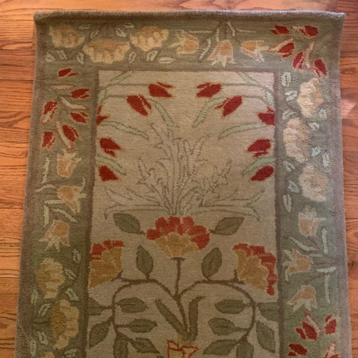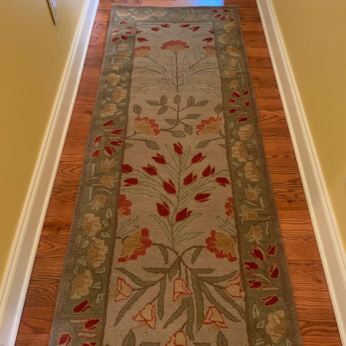 Four unopened 2.5' x 9' Adeline hand tufted wool runner rugs by Woolmark. All rugs are the same design and feature floral patterns with sage green, ruby, taupe, and auburn colors, Please note that one rug was opened for photos. These match a larger area rug also found in this auction. Local pickup only.