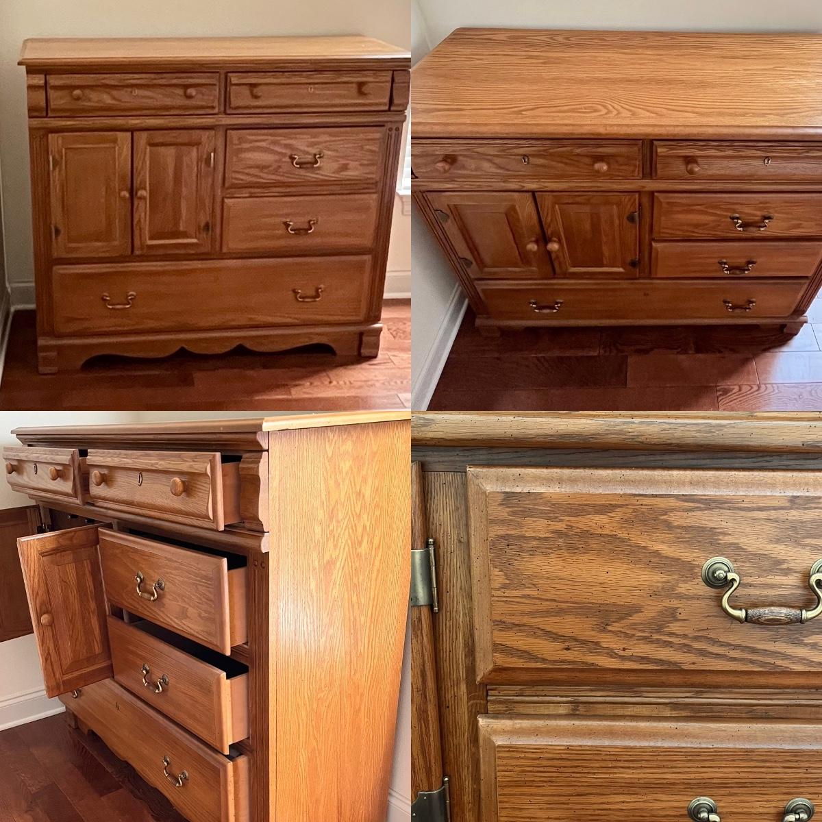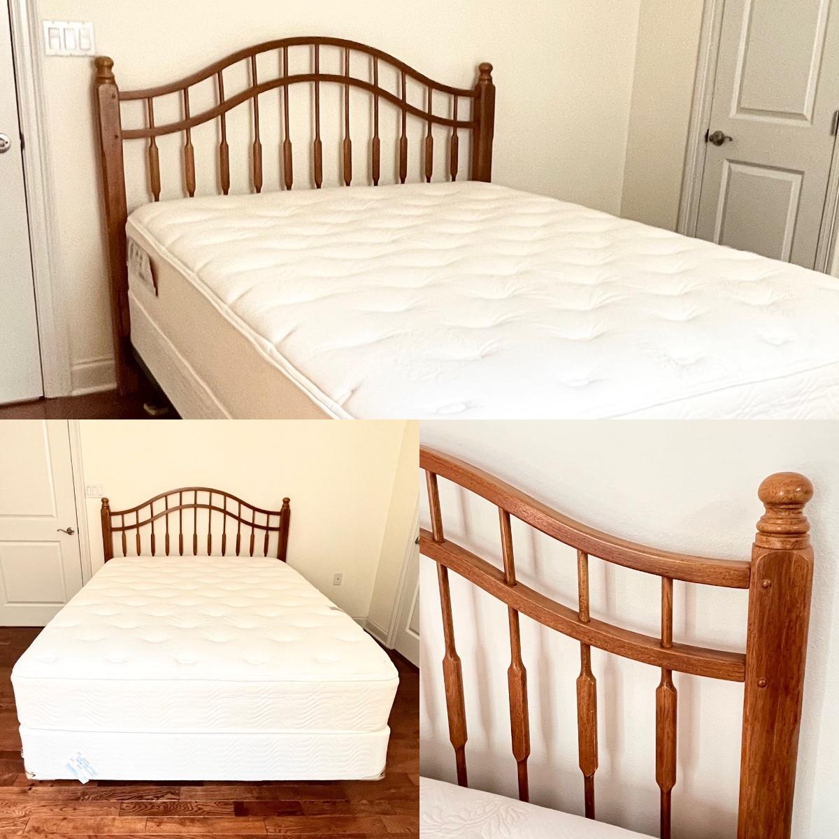 This is a matching set ~ lighting has affected some of the photos ~ Includes = Queen headboard 50.5” H x 62” W x 3” D ~ Chest 42” H x 48” W x 18” D ~ (2) Nightstands 22.5” H x 26” W x 16” D ~ Also includes SIMMONS Beautyrest Mattress & Boxspring ~ Mattress has been by disinfected, deodorized & sanitized ~ No brand name found on furniture