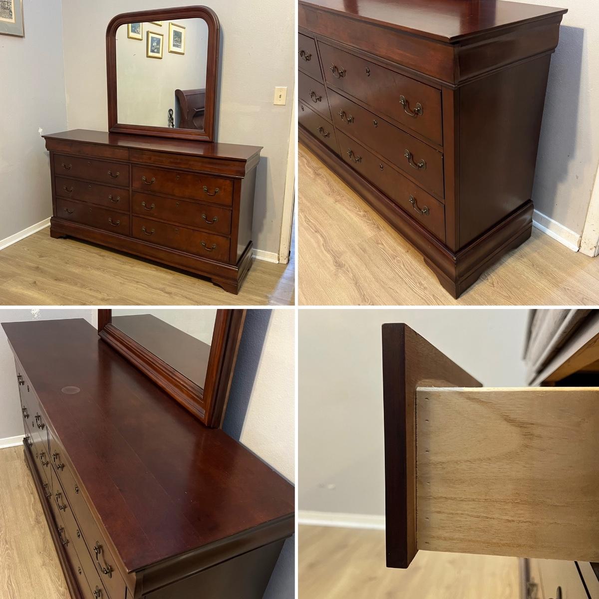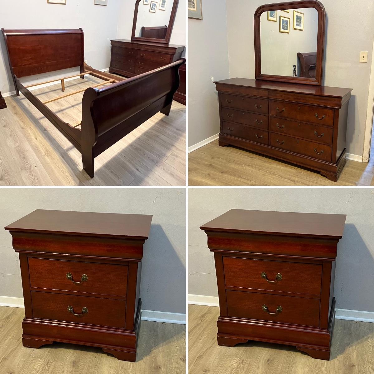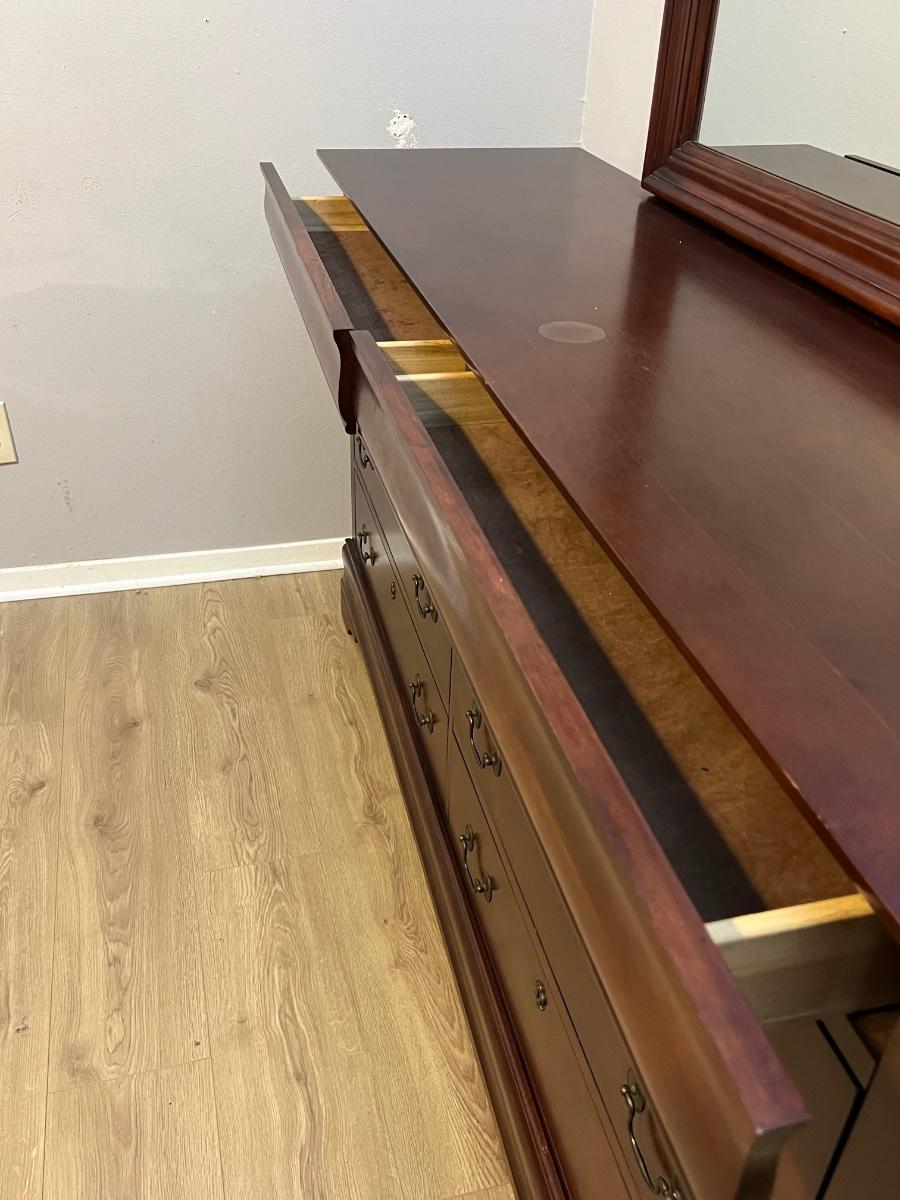 Includes: 1 queen size bed, (2) 3 drawer nightstands, (1) 8 drawer mirrored dresser ~ All drawers slide easy ~ No brand found ~ Headboard = 47” H ~ Dresser = 36” H x 66” W x 18” D ~ Mirror = 38” H x 37” W ~ Nightstands = 27” H x 28” W x 17” D ~ Notice in the picture of the Dresser that there is a ring. Pictures are part of the items descriptions.