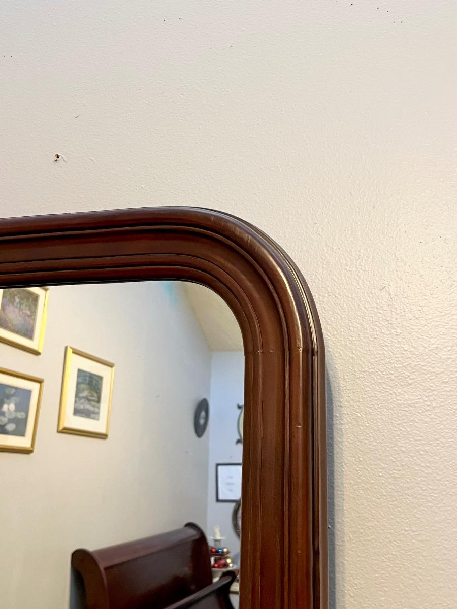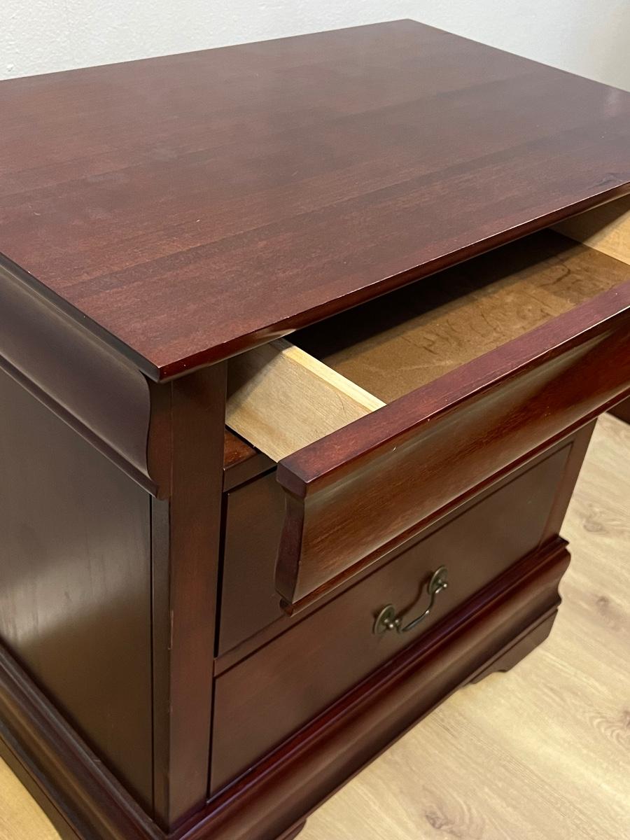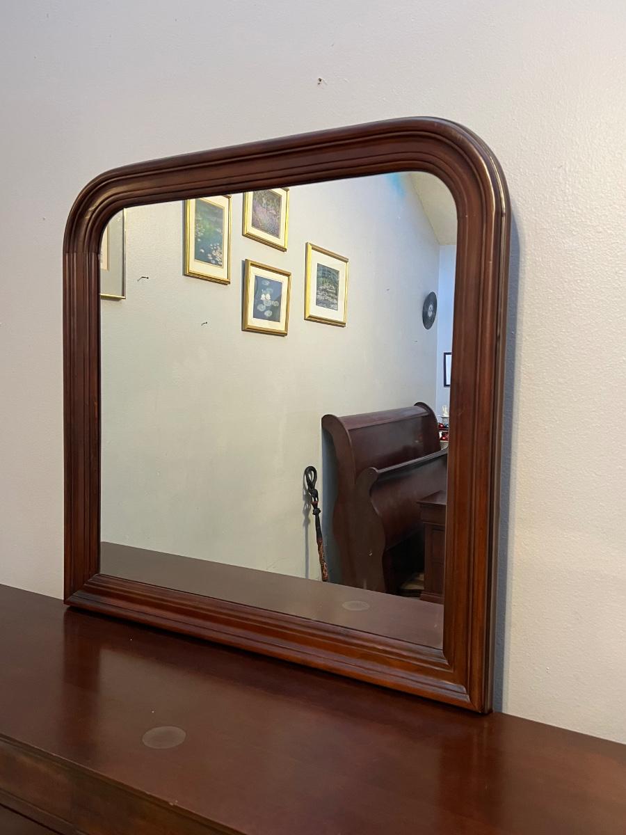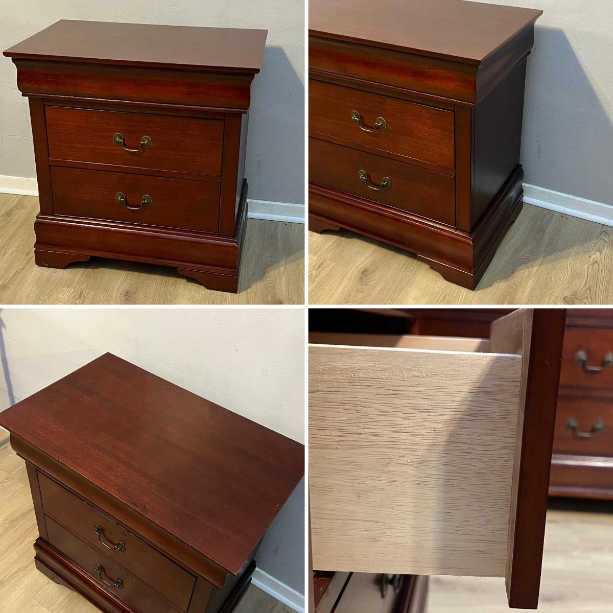 Includes: 1 queen size bed, (2) 3 drawer nightstands, (1) 8 drawer mirrored dresser ~ All drawers slide easy ~ No brand found ~ Headboard = 47” H ~ Dresser = 36” H x 66” W x 18” D ~ Mirror = 38” H x 37” W ~ Nightstands = 27” H x 28” W x 17” D ~ Notice in the picture of the Dresser that there is a ring. Pictures are part of the items descriptions.