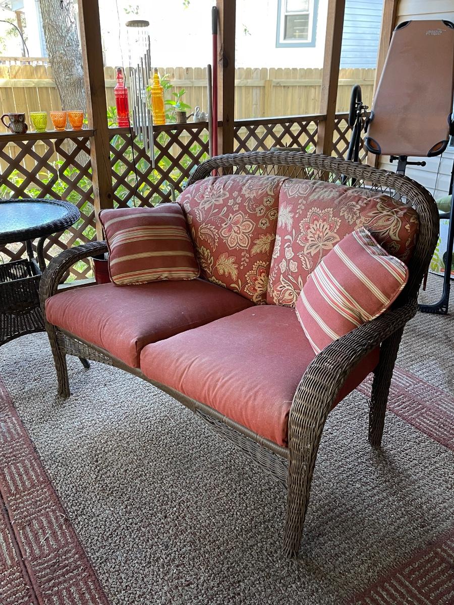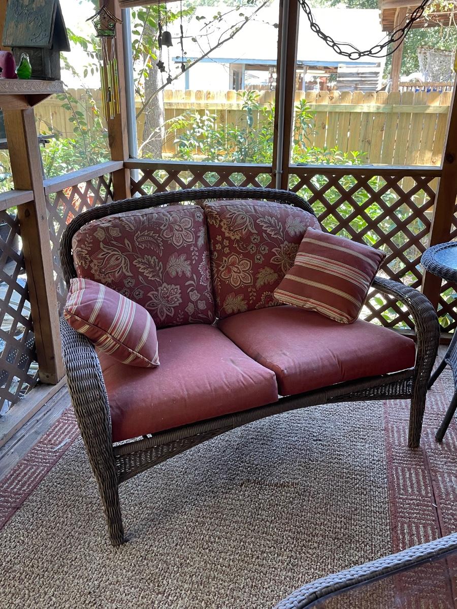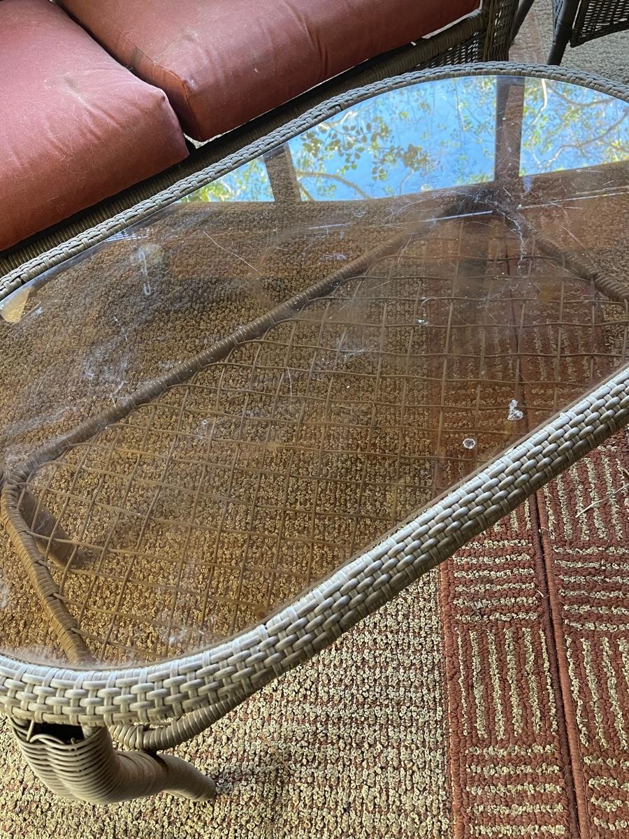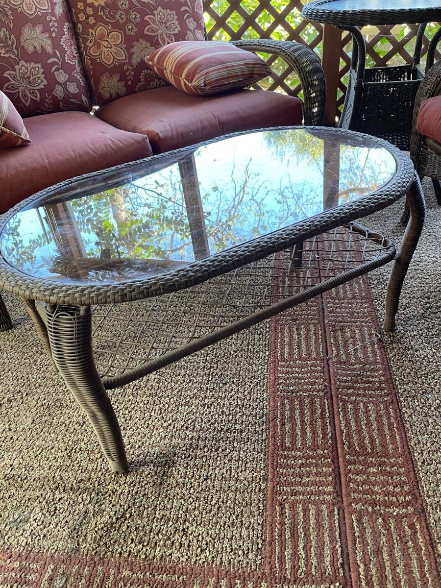 Porch Kept ~ No major damage ~ Minor surface rust ~ all cushions will need to be replaced due to pet hair and wear. Could be just pressure washed. Love seats are 53 “ Wide. Coffee table is 18” H x 39” W x 23” D and glass has surface scratches (see photo ) comes with a 26” Round table that measures 28” High.