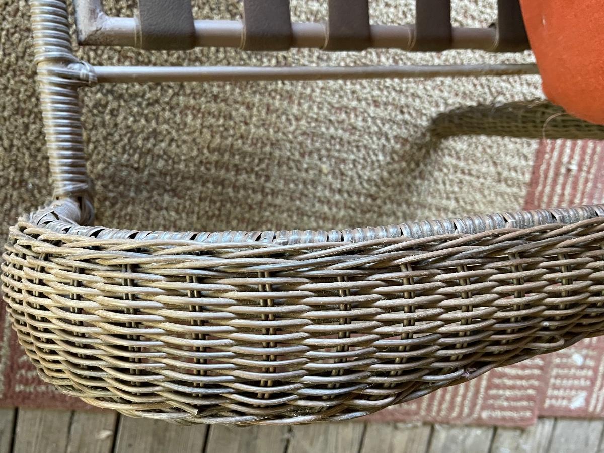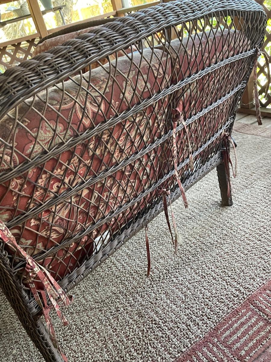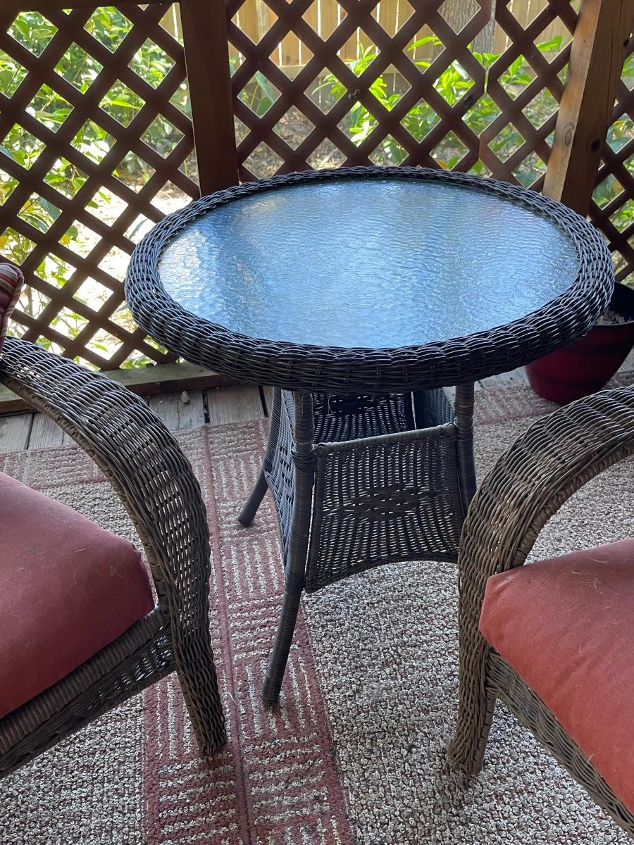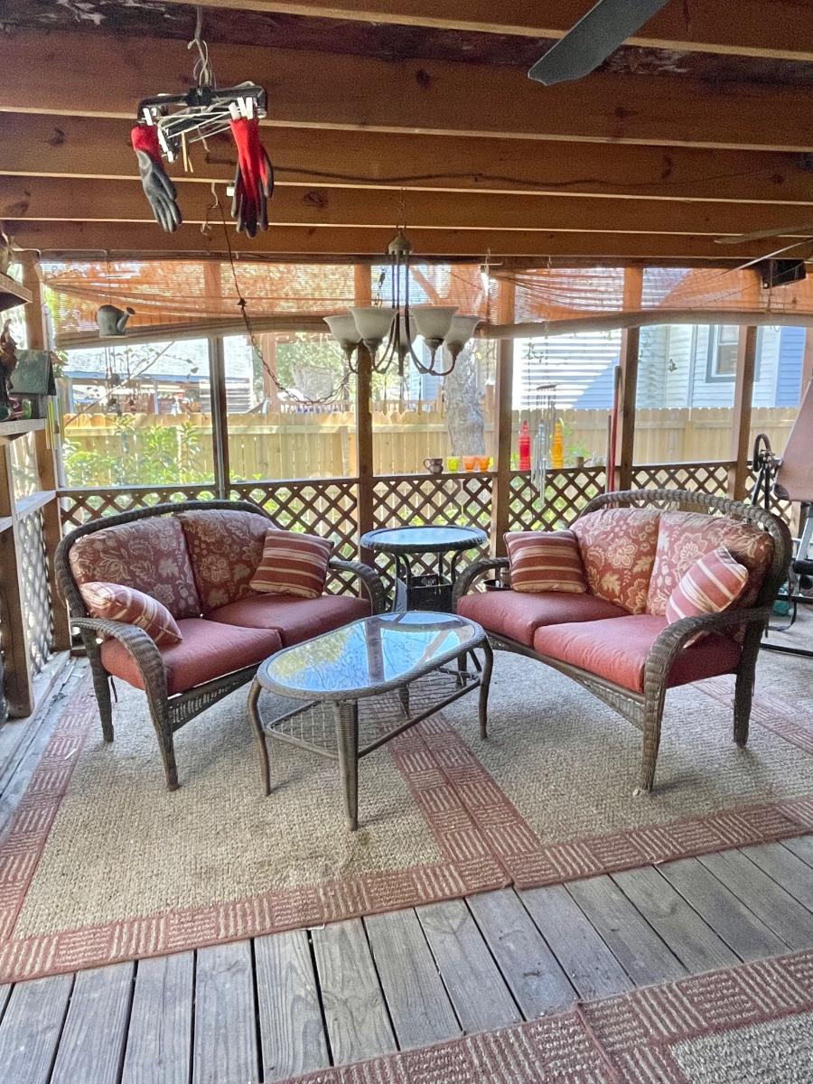 Porch Kept ~ No major damage ~ Minor surface rust ~ all cushions will need to be replaced due to pet hair and wear. Could be just pressure washed. Love seats are 53 “ Wide. Coffee table is 18” H x 39” W x 23” D and glass has surface scratches (see photo ) comes with a 26” Round table that measures 28” High.