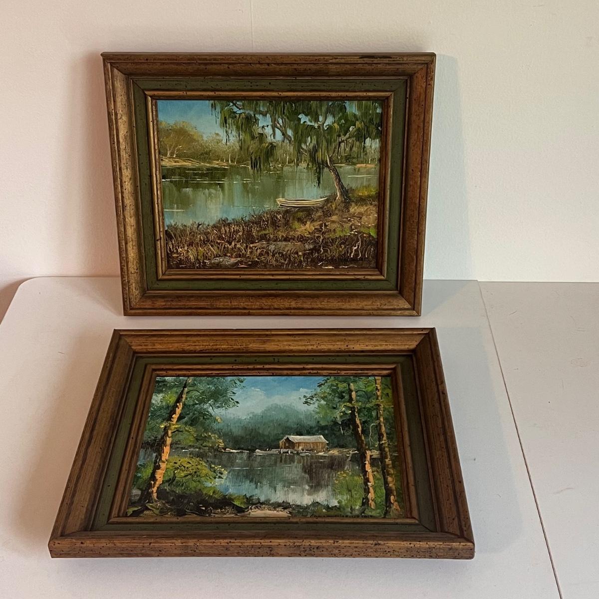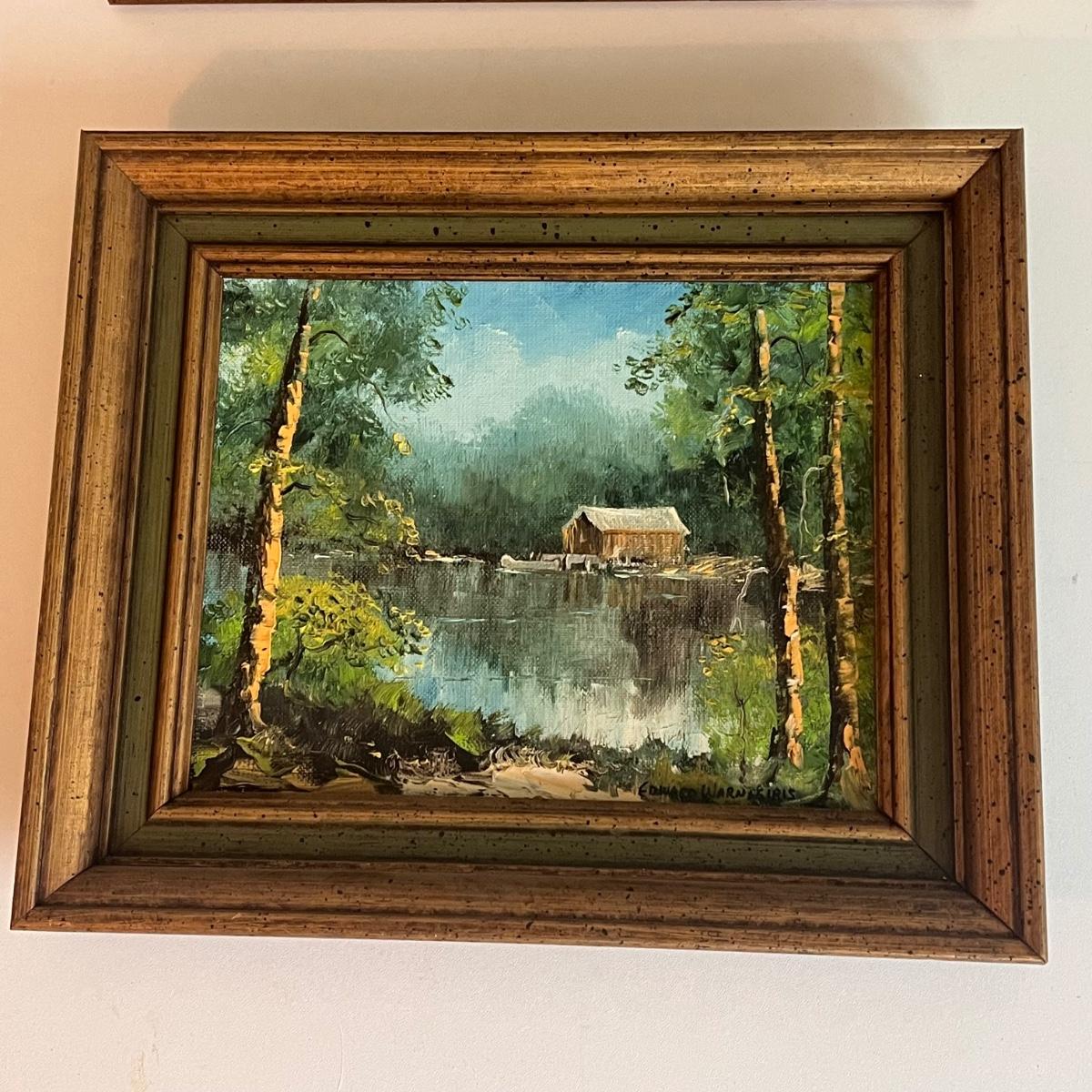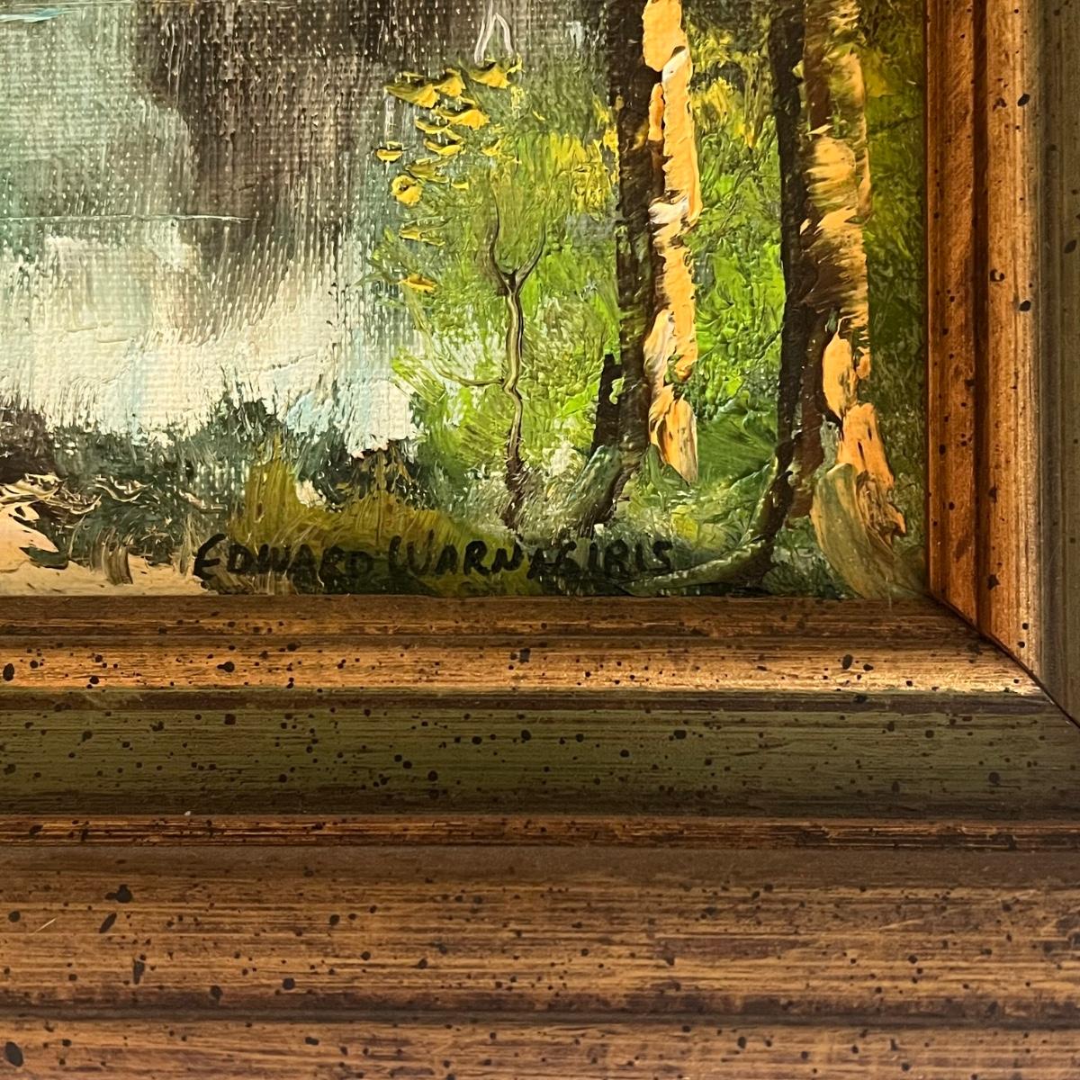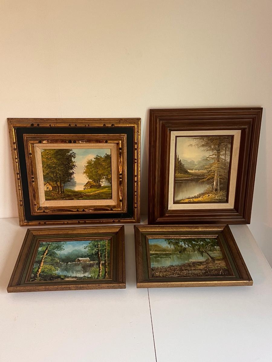 This lot includes four nature landscape paintings in wooden frames. The smaller pieces are signed with Edward Warnagiris and the larger two have an illegible signature. The two larger pieces measure 15” x 17.5”H and the smaller two measure 13.5” x 11.5”H. Shipping available. Shipping can be costly. We suggest contacting our preferred local shipping provider, Postage Express, with dimensions and getting an estimate before bidding: (828) 670-5501 or shipping@postageexpressnc.com.
