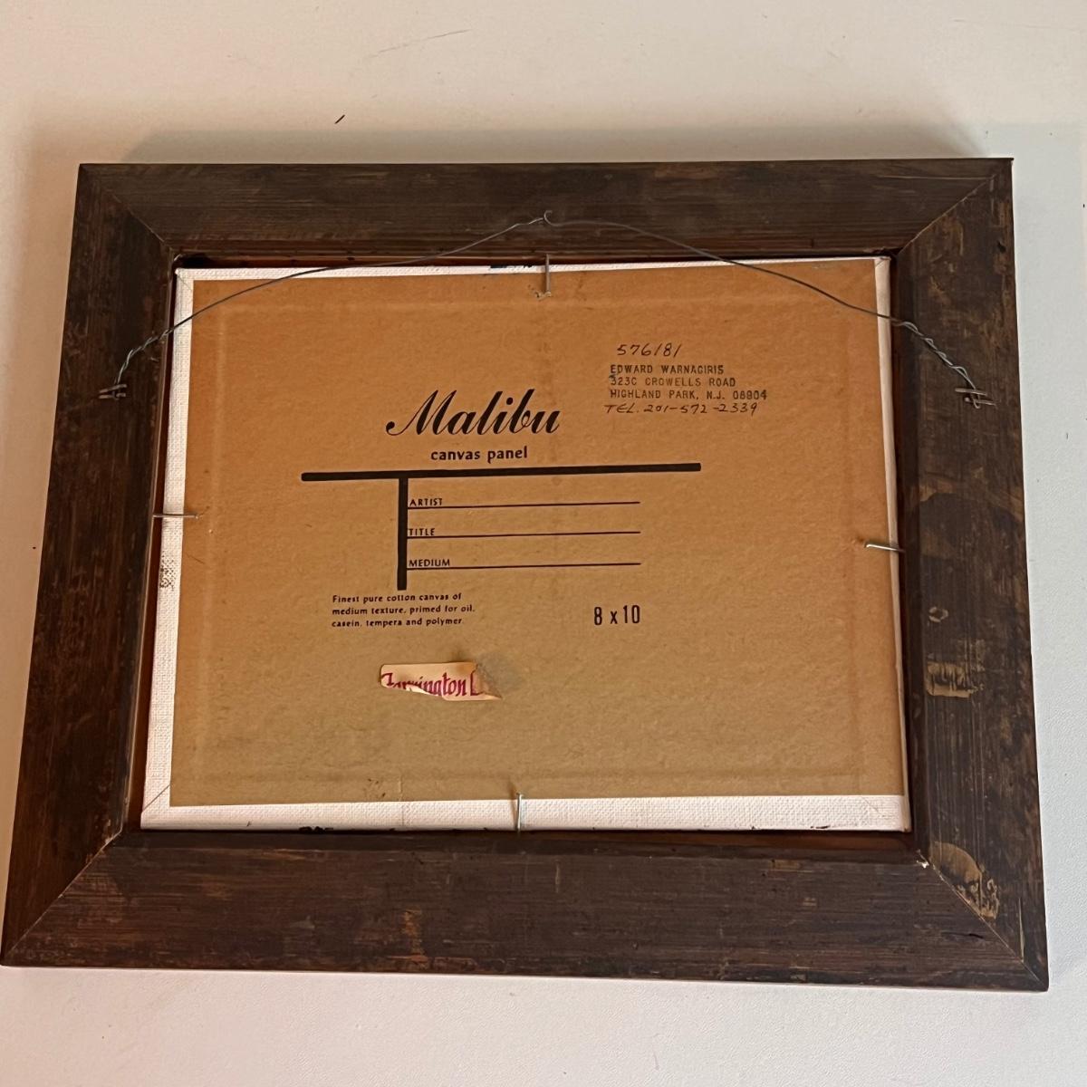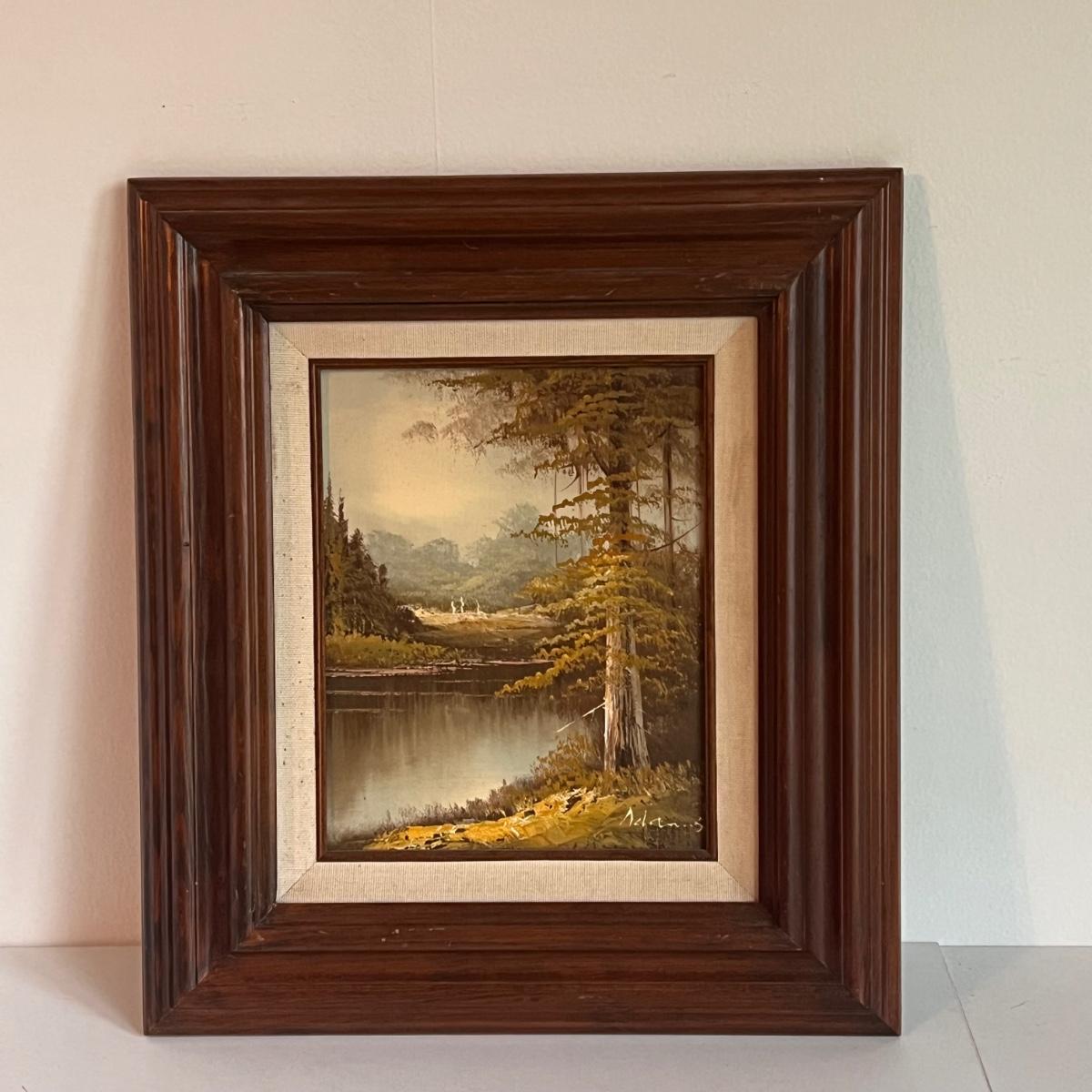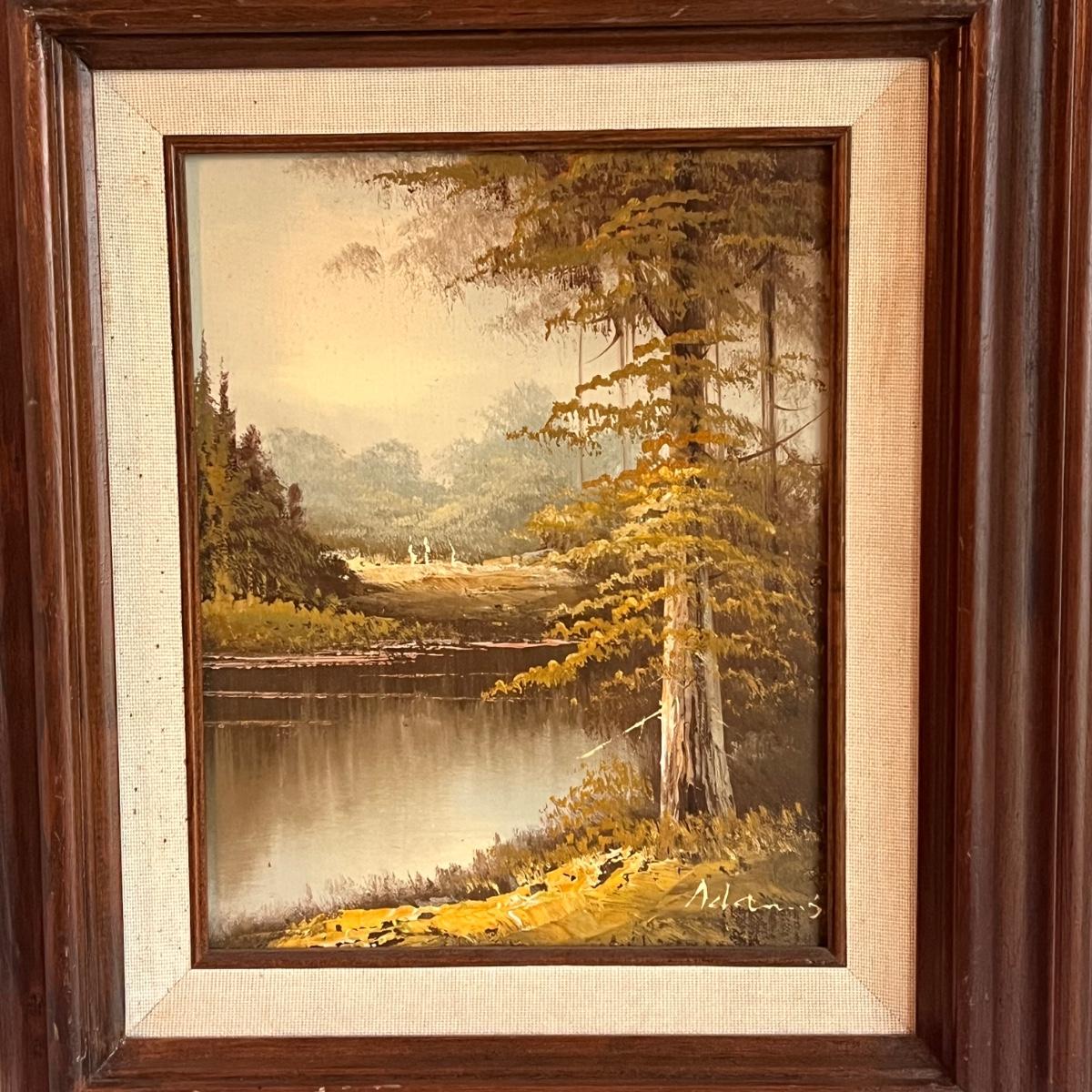 This lot includes four nature landscape paintings in wooden frames. The smaller pieces are signed with Edward Warnagiris and the larger two have an illegible signature. The two larger pieces measure 15” x 17.5”H and the smaller two measure 13.5” x 11.5”H. Shipping available. Shipping can be costly. We suggest contacting our preferred local shipping provider, Postage Express, with dimensions and getting an estimate before bidding: (828) 670-5501 or shipping@postageexpressnc.com.