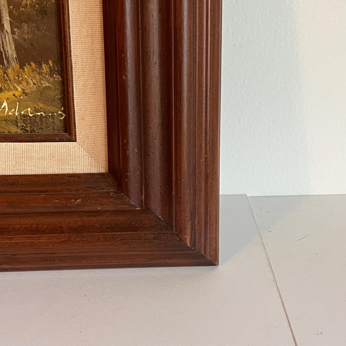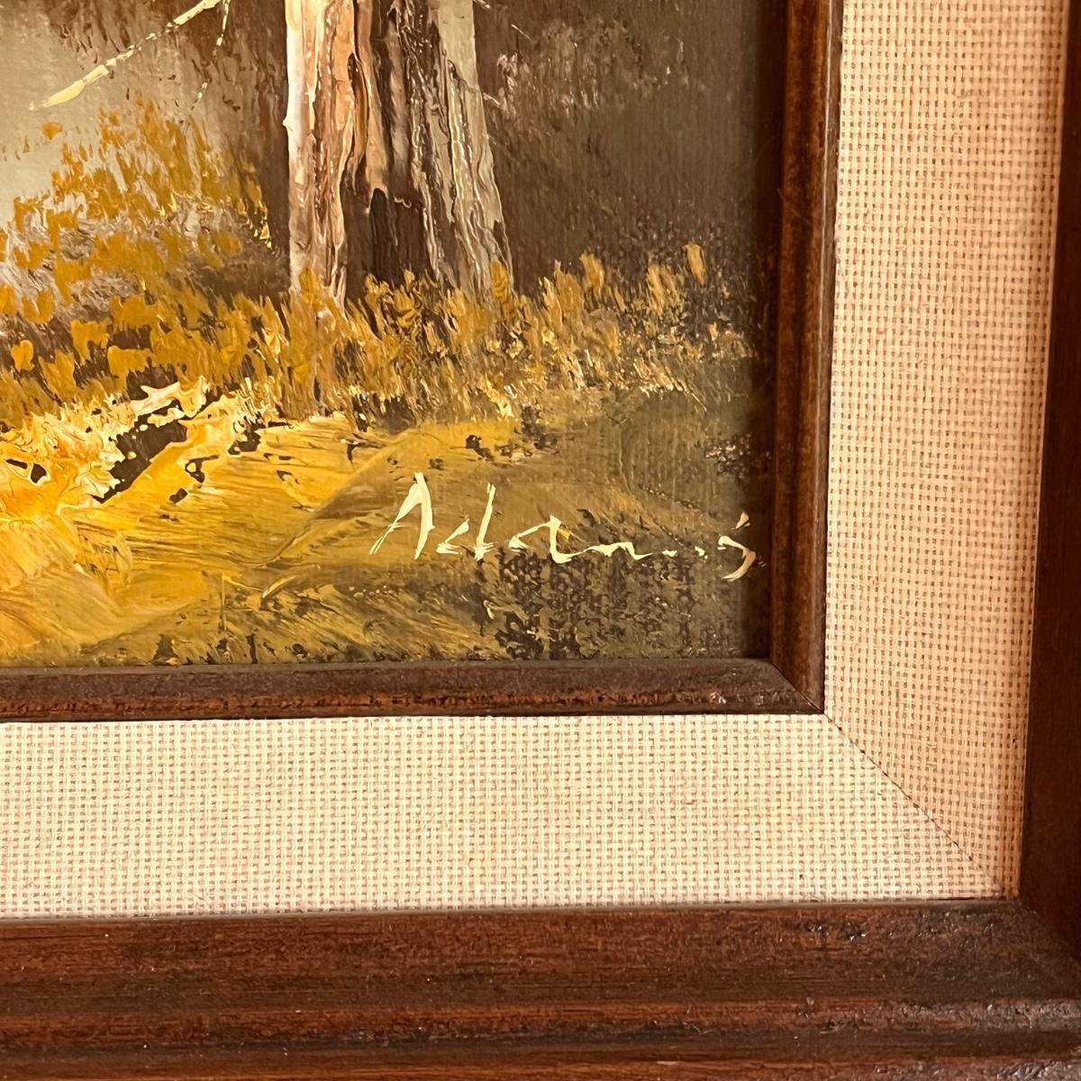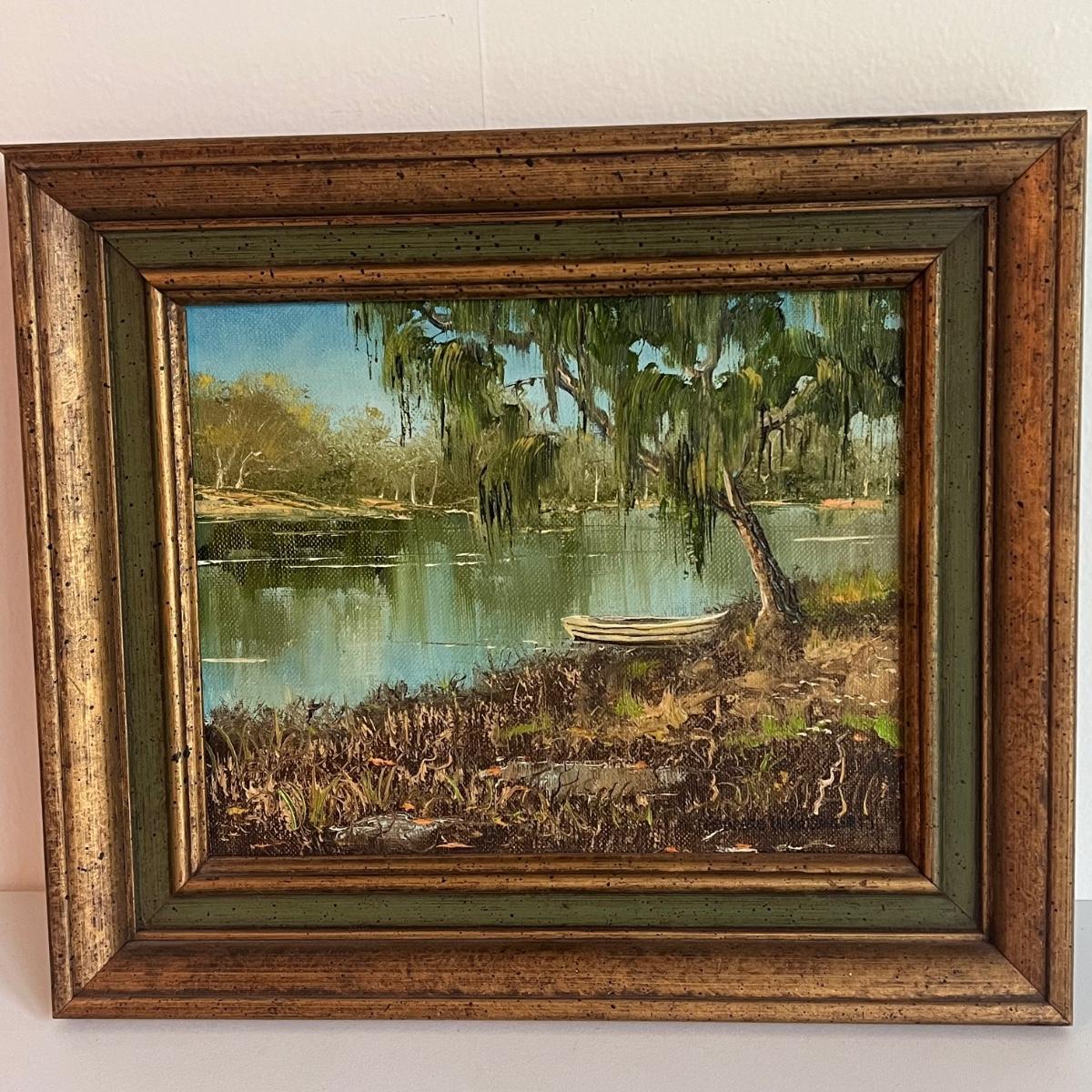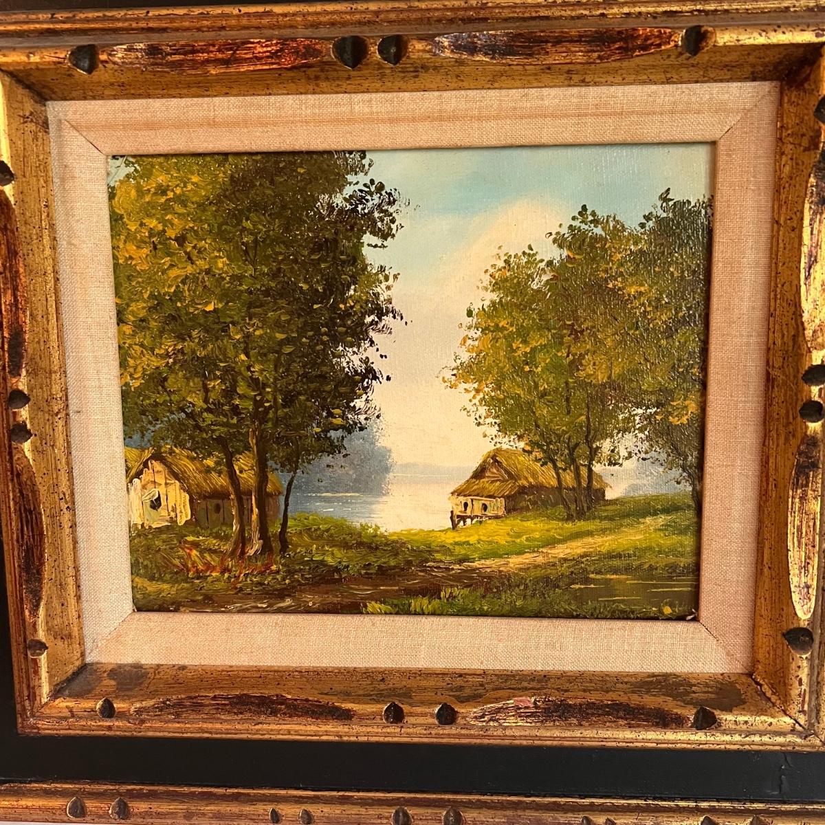 This lot includes four nature landscape paintings in wooden frames. The smaller pieces are signed with Edward Warnagiris and the larger two have an illegible signature. The two larger pieces measure 15” x 17.5”H and the smaller two measure 13.5” x 11.5”H. Shipping available. Shipping can be costly. We suggest contacting our preferred local shipping provider, Postage Express, with dimensions and getting an estimate before bidding: (828) 670-5501 or shipping@postageexpressnc.com.