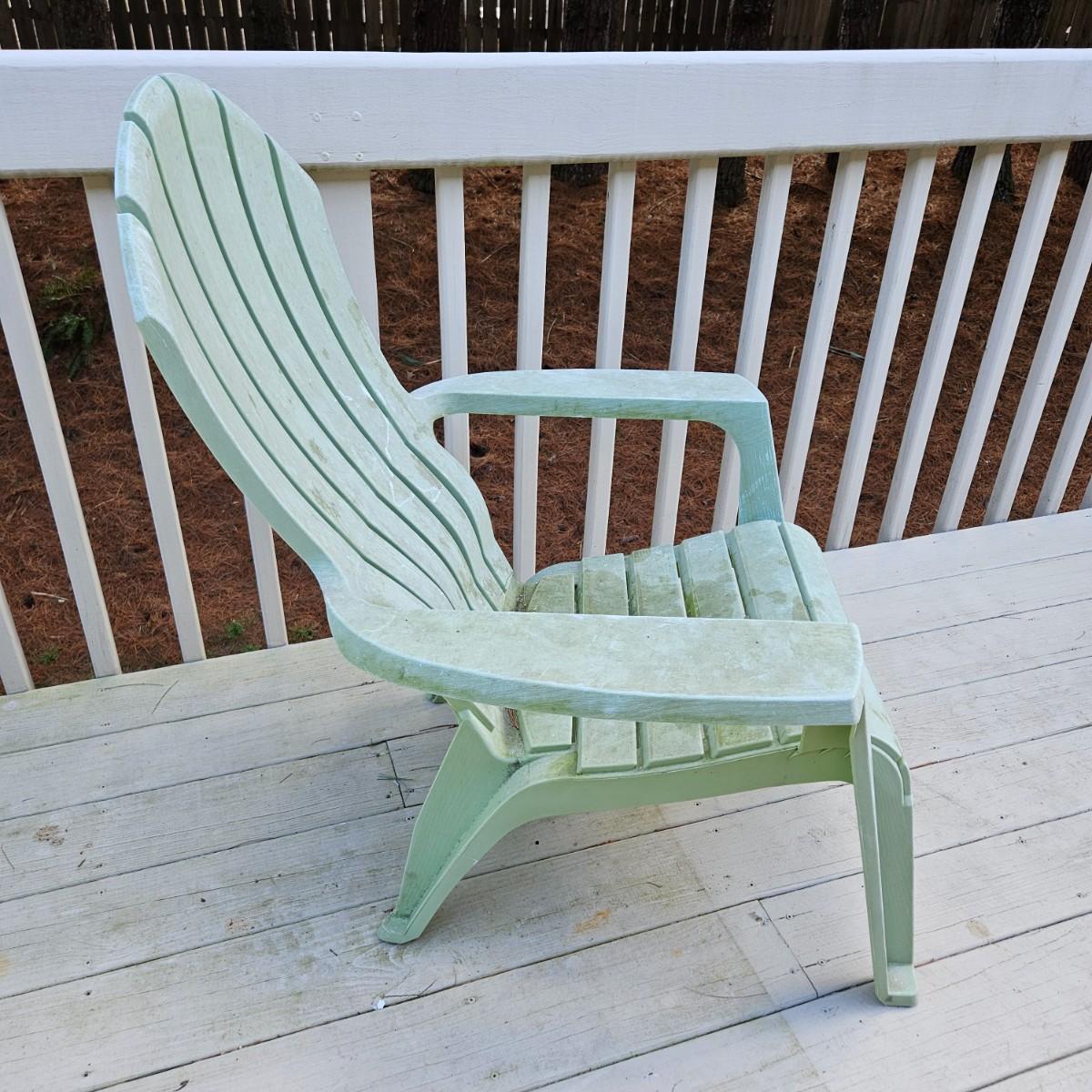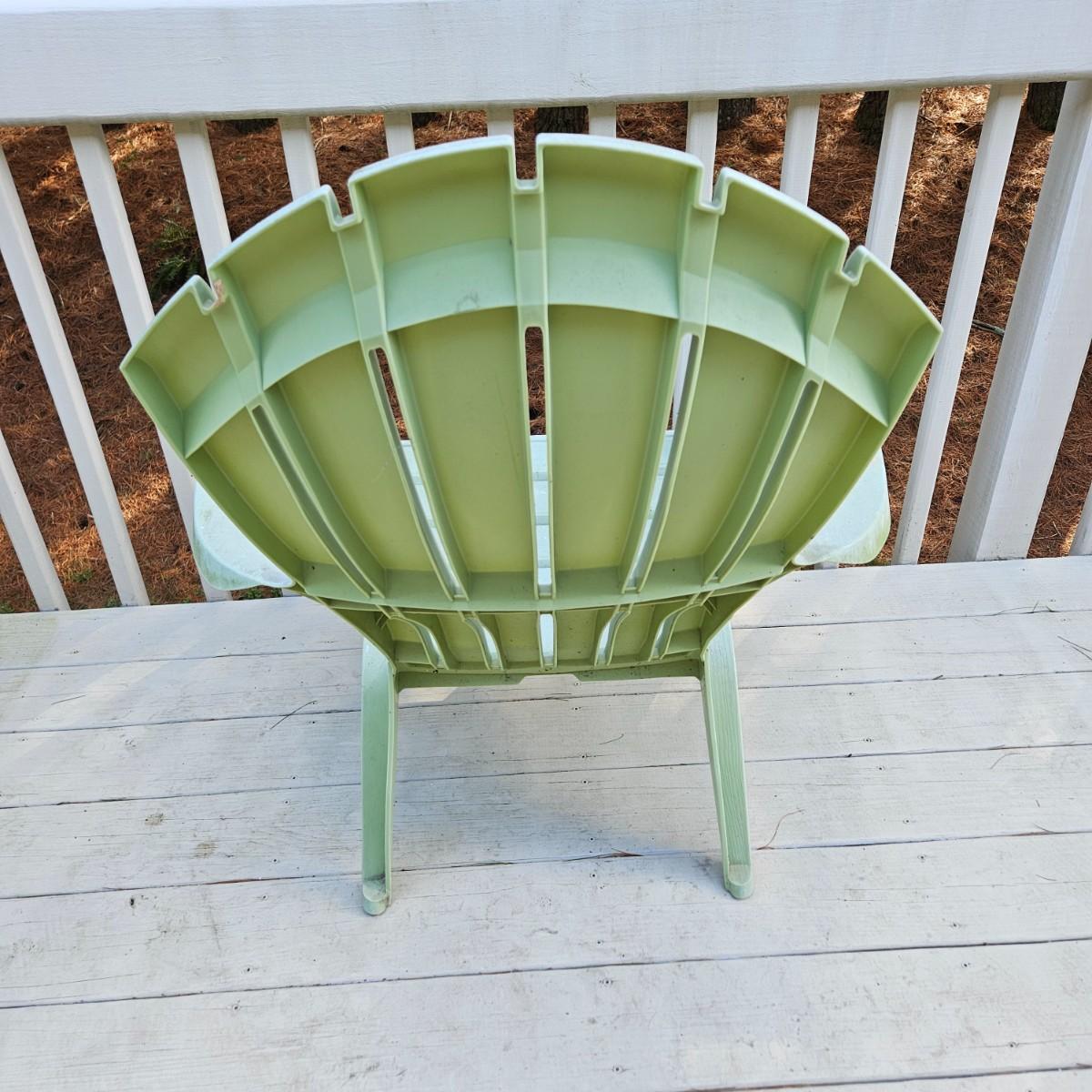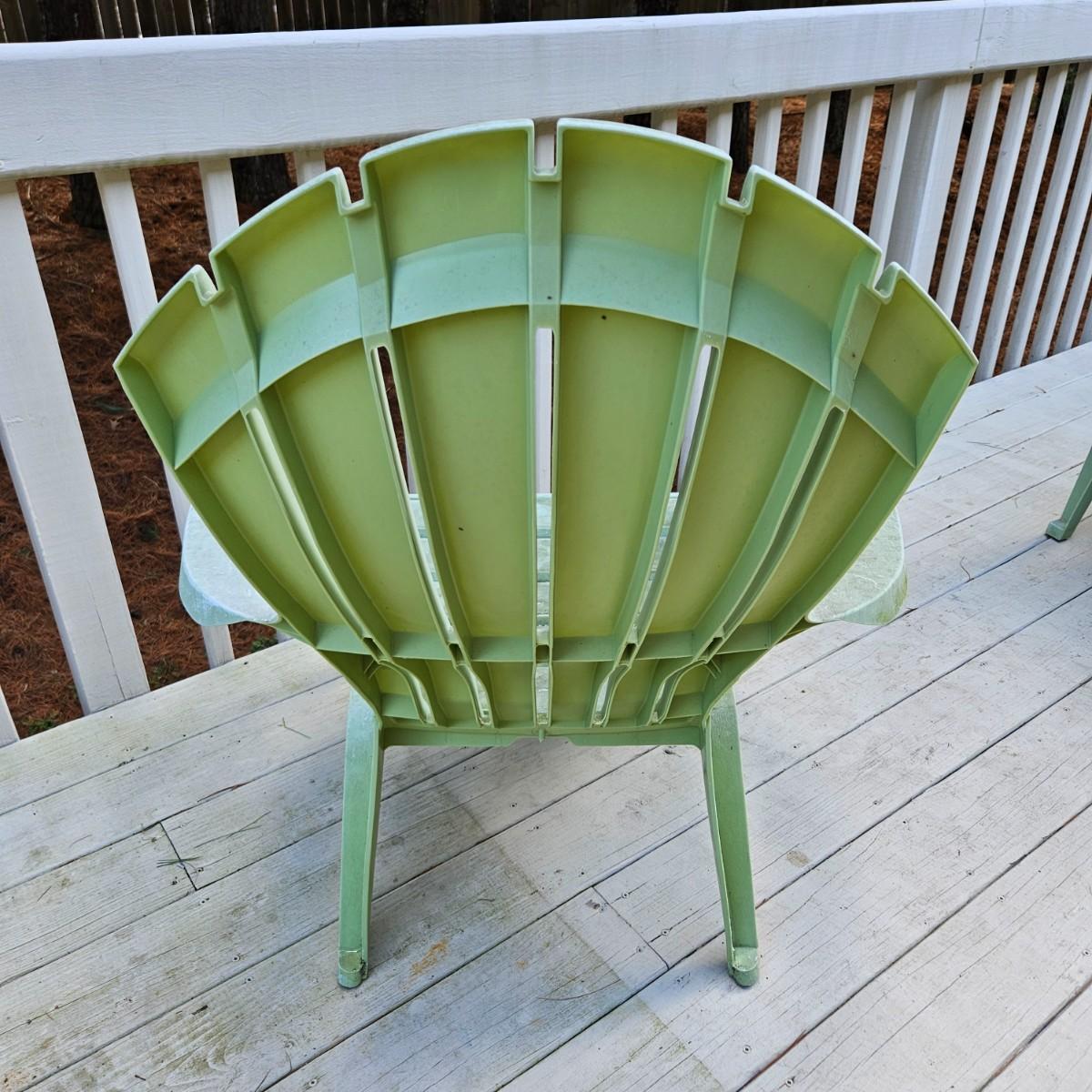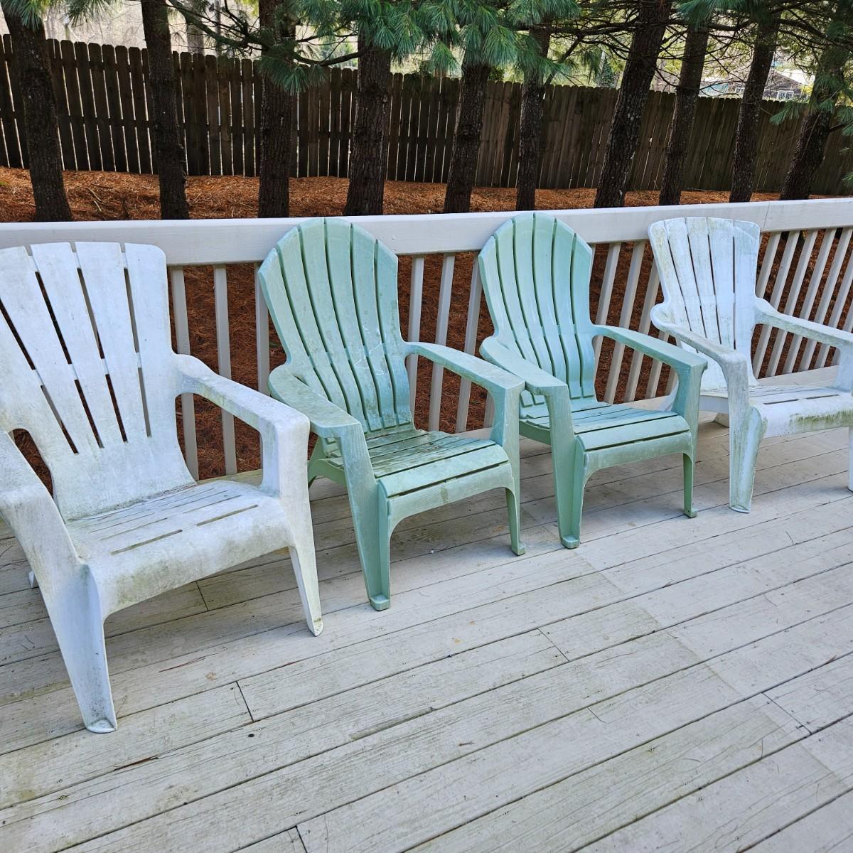 Four plastic Adirondack chairs, the green ones measure approximately 29.5" x 29.5" x 37" with a seat height of 15". The white ones measure approximately 30" x 30" x 35" with a seat height of 15.5". All four chairs could use a good cleaning and are a bit sun faded, but not brittle. Local pickup only