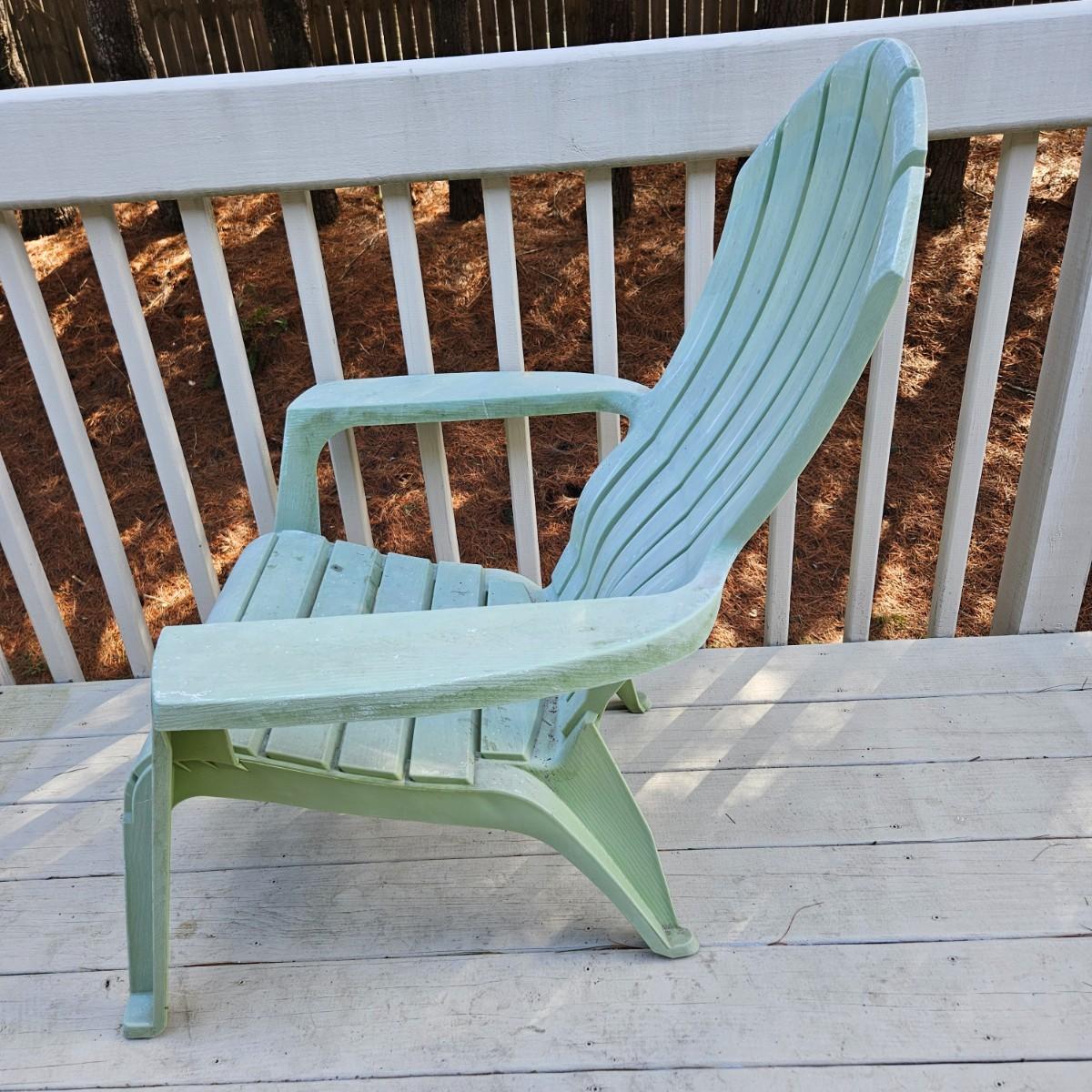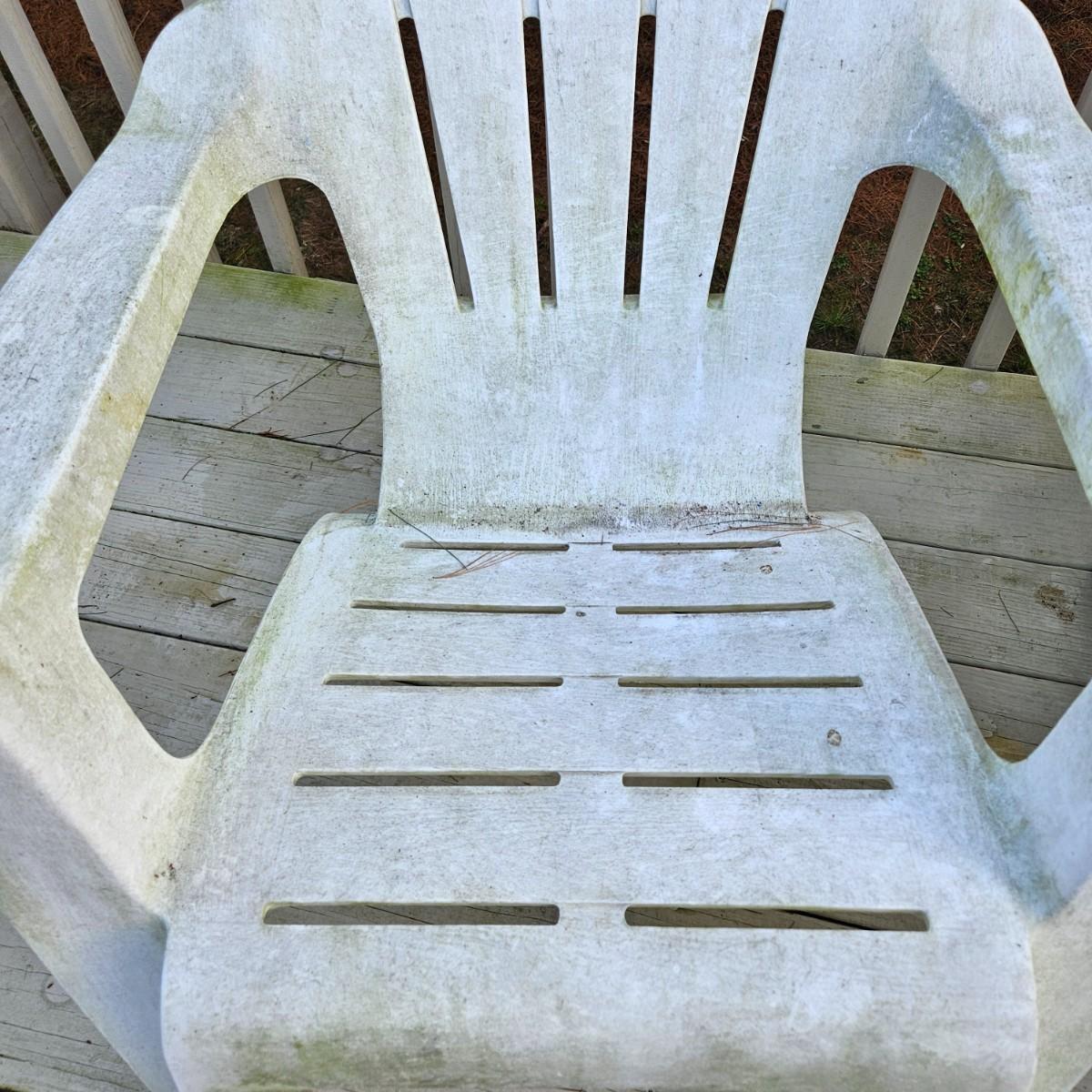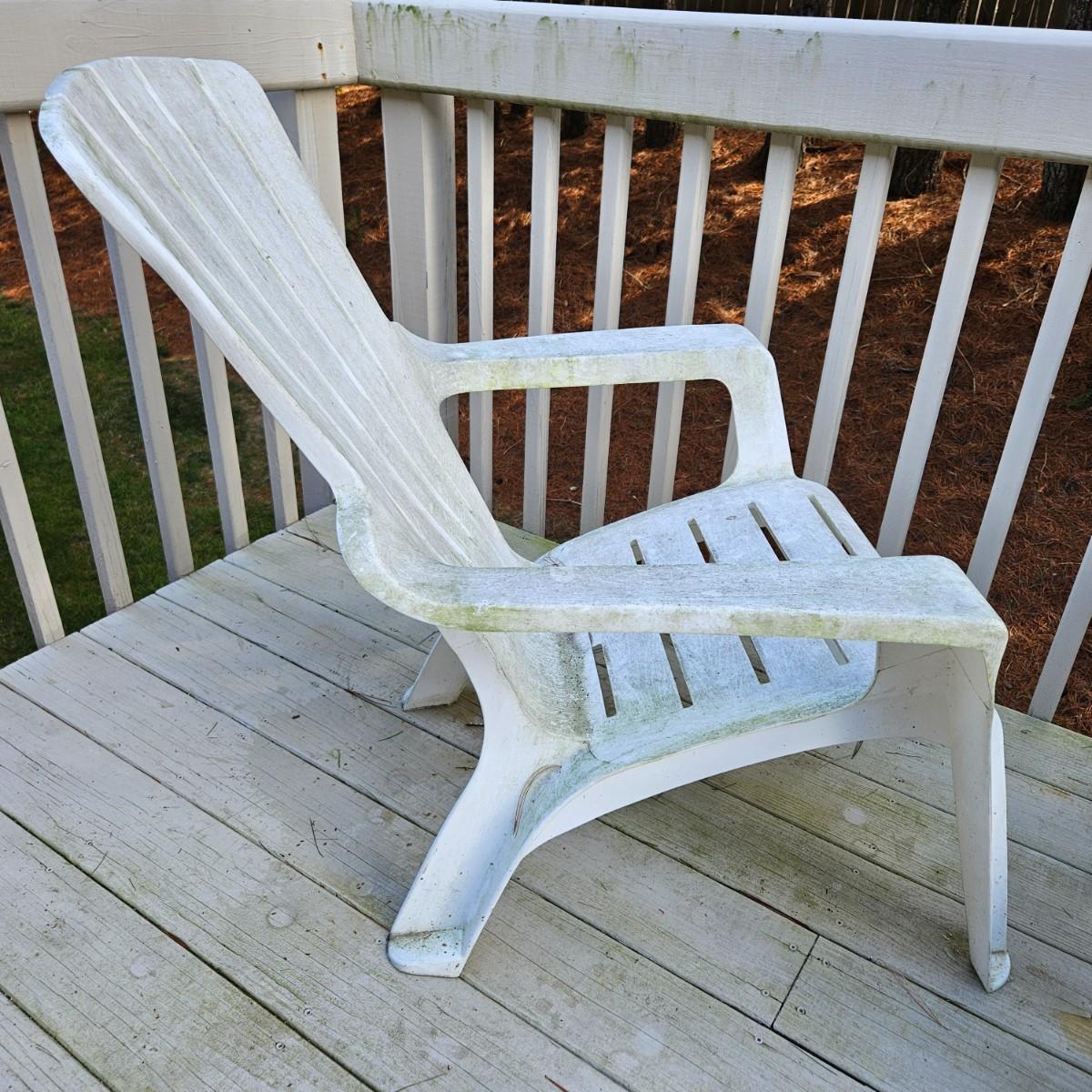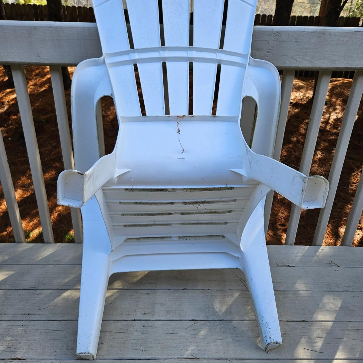 Four plastic Adirondack chairs, the green ones measure approximately 29.5" x 29.5" x 37" with a seat height of 15". The white ones measure approximately 30" x 30" x 35" with a seat height of 15.5". All four chairs could use a good cleaning and are a bit sun faded, but not brittle. Local pickup only