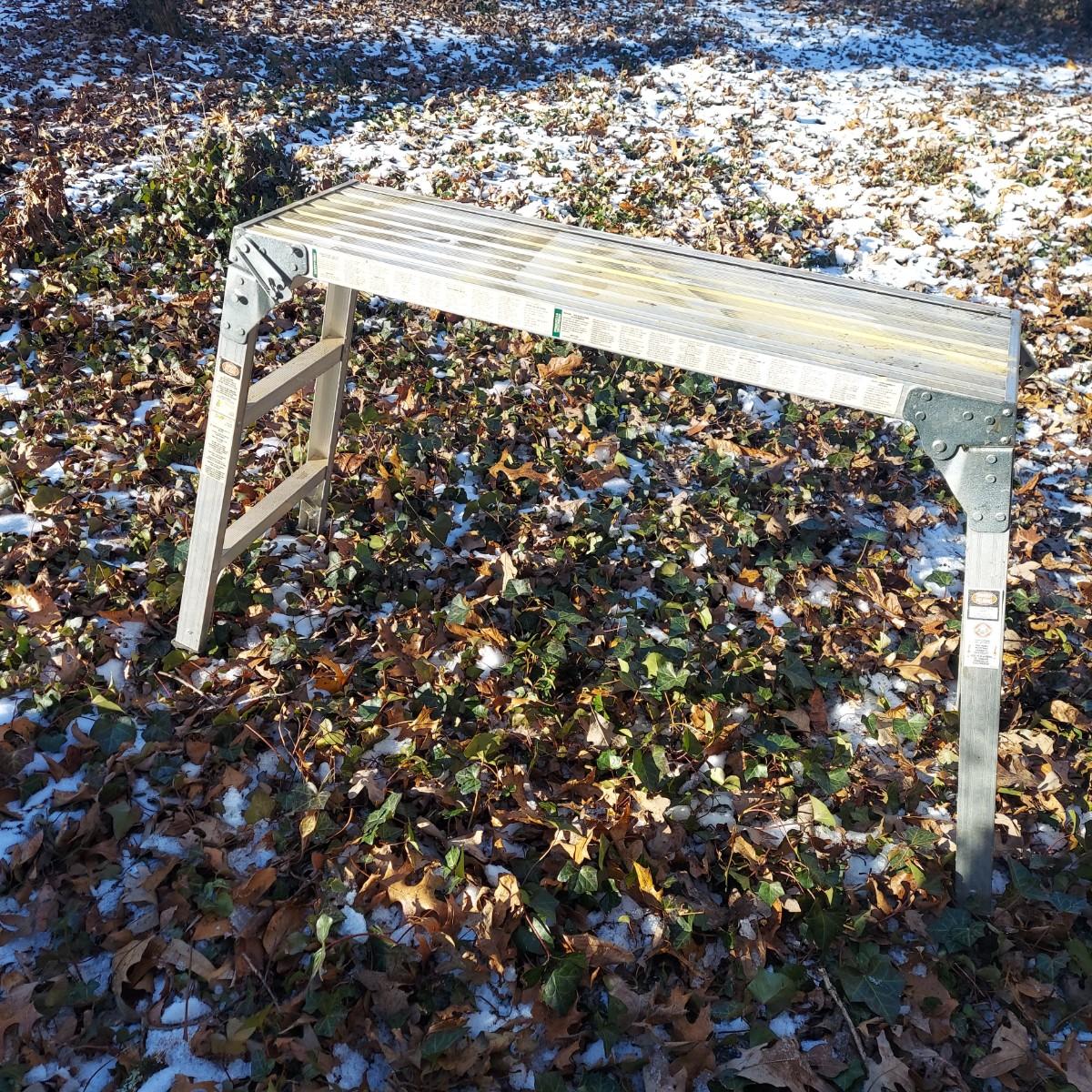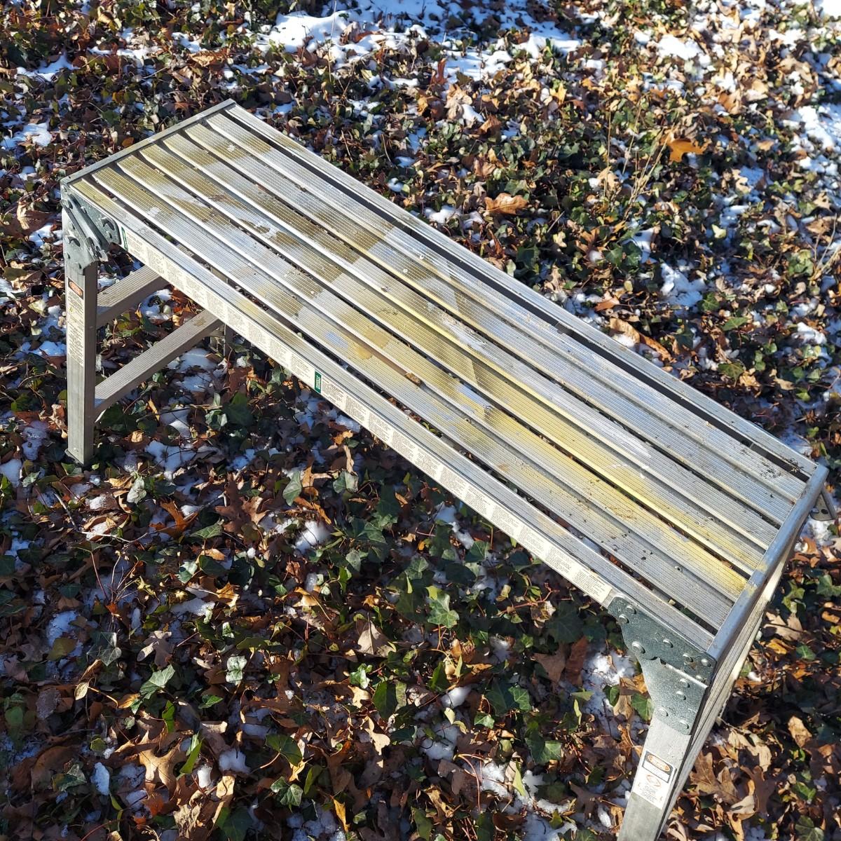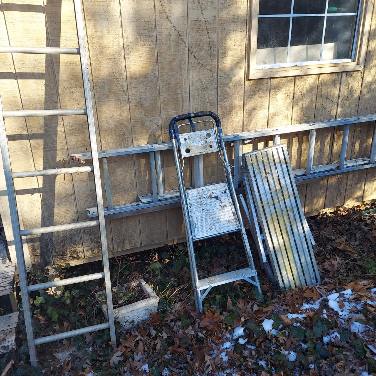 Lot includes two aluminum ladders, one step ladder and one work platform. All items are in used condition. The standard ladder is 8’ and the extension ladder is 13’ while collapsed. The work platform measures 40’ x 12’ x 31’H when open. Please see photos for details. Local Pickup Only.