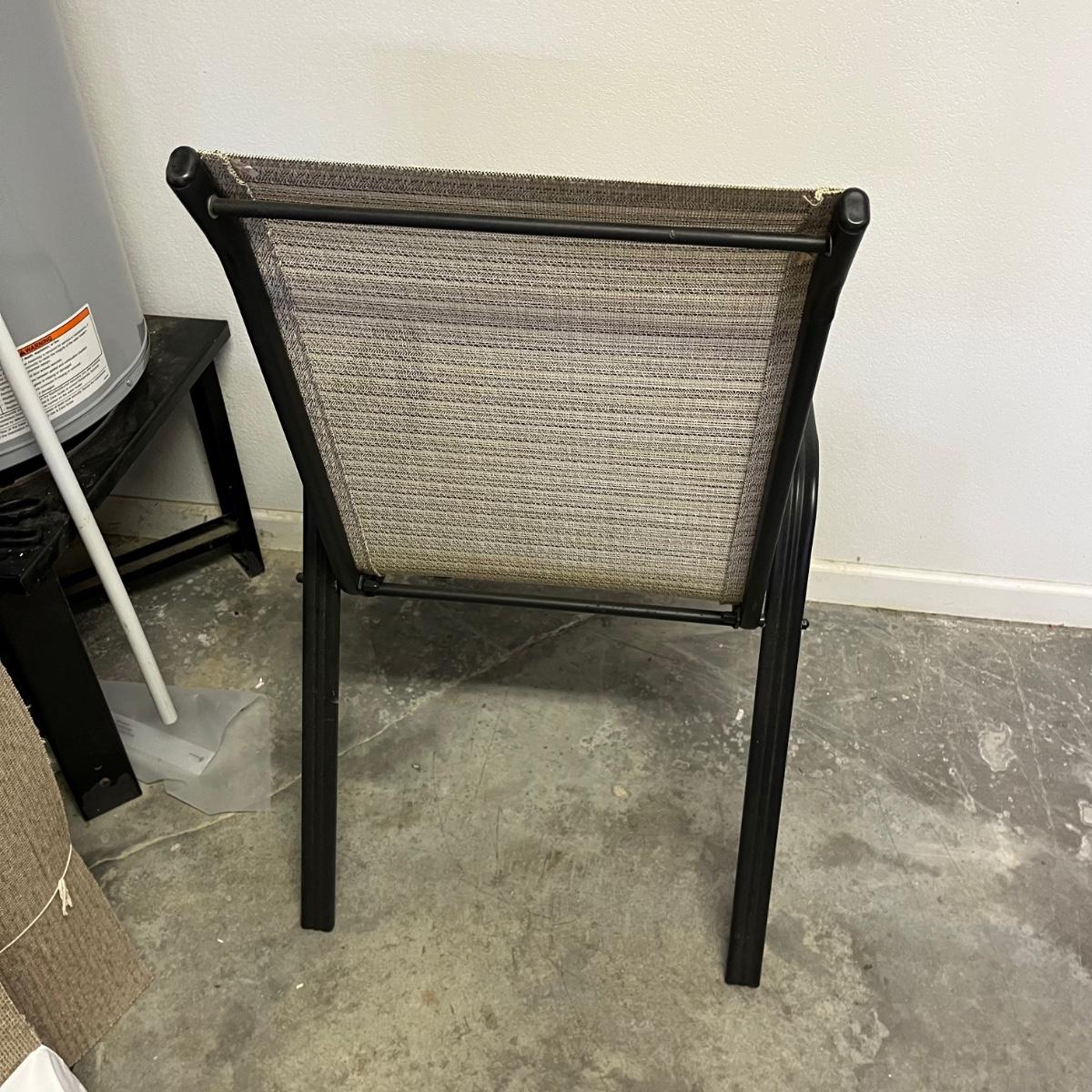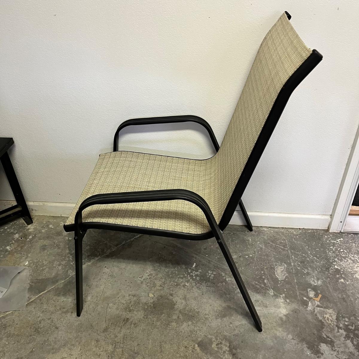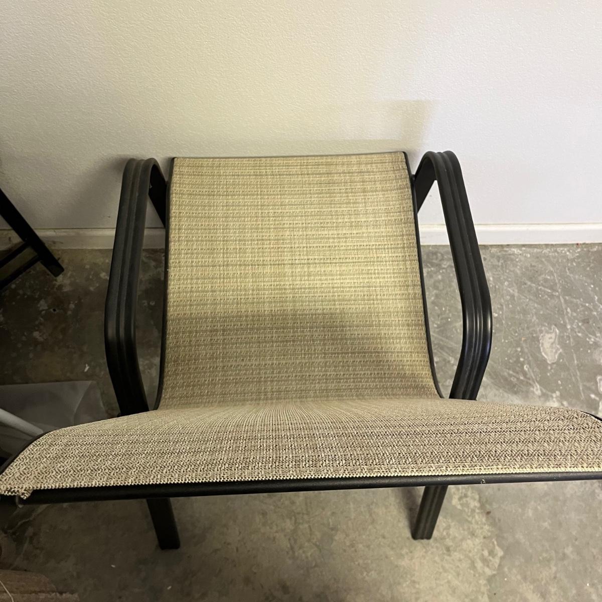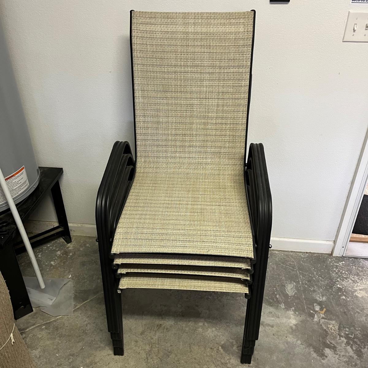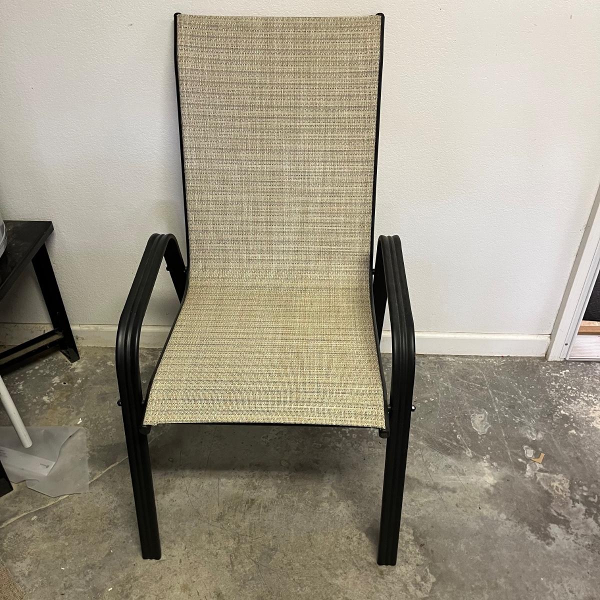 These four aluminum framed sling chairs have outdoor weatherproof fabric. Chairs measure 22” x 28” x 39” with a seat height of 17”.