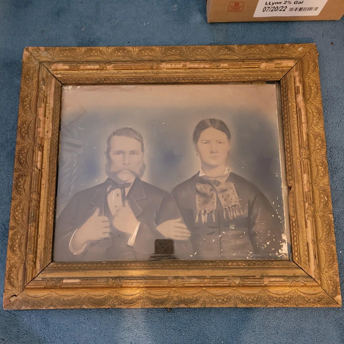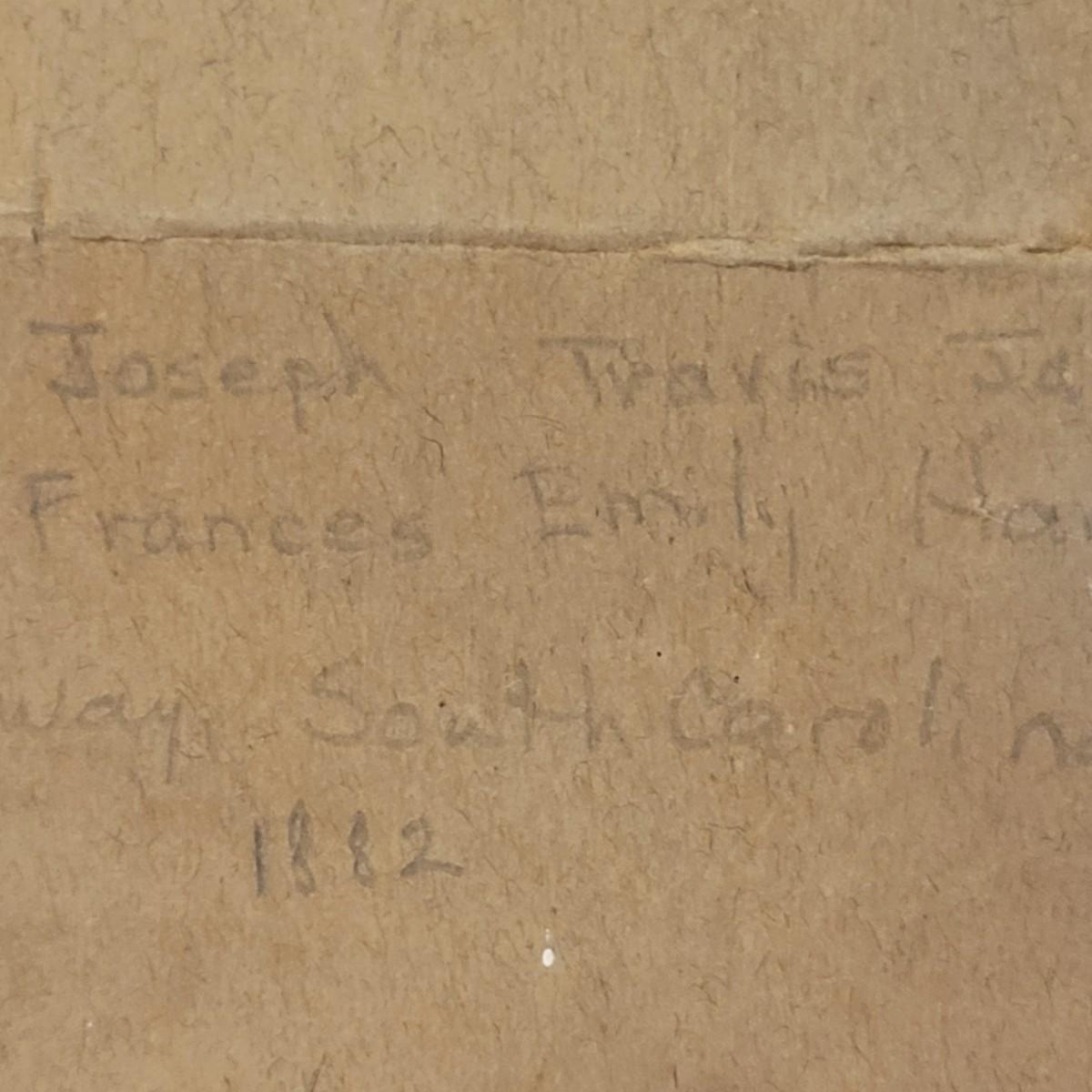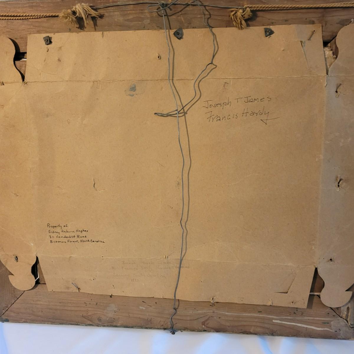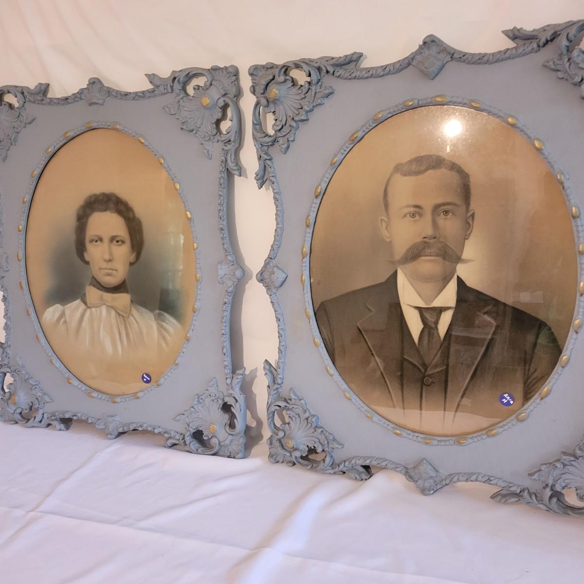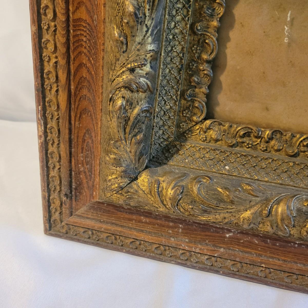 A collection of 4 antique frames and photographs. Two pieces are in matching wooden, hand carved frames that are in good condition with no notable damage. The larger vertical piece is also in good condition, although the original wood backing is disintegrating, but the wooden frame shows no notable damage. This piece measures approximately 26" x 30" x 3". The final piece is in fair condition as the frame and photograph shows some damage. The wooden frame has some missing plaster and there is some gapping in the corners. The photograph shows some damage in its bottom right corner. Notes on the back indicate it was taken in 1882. Please note that these appear to be photographs with some hand-drawing/editing, but we cannot verify the medium. Shipping available. Shipping Art can be costly please call UPS store at 828-252-6930 for quote.