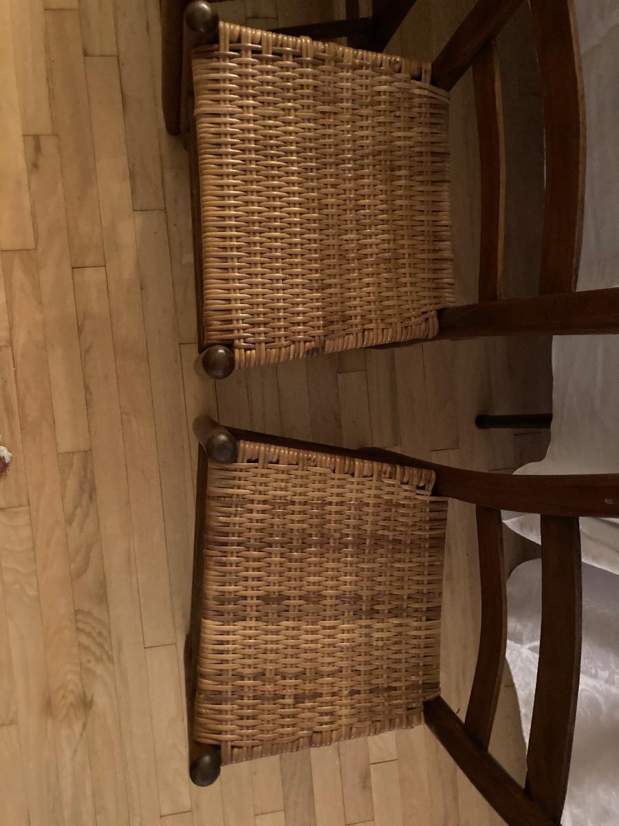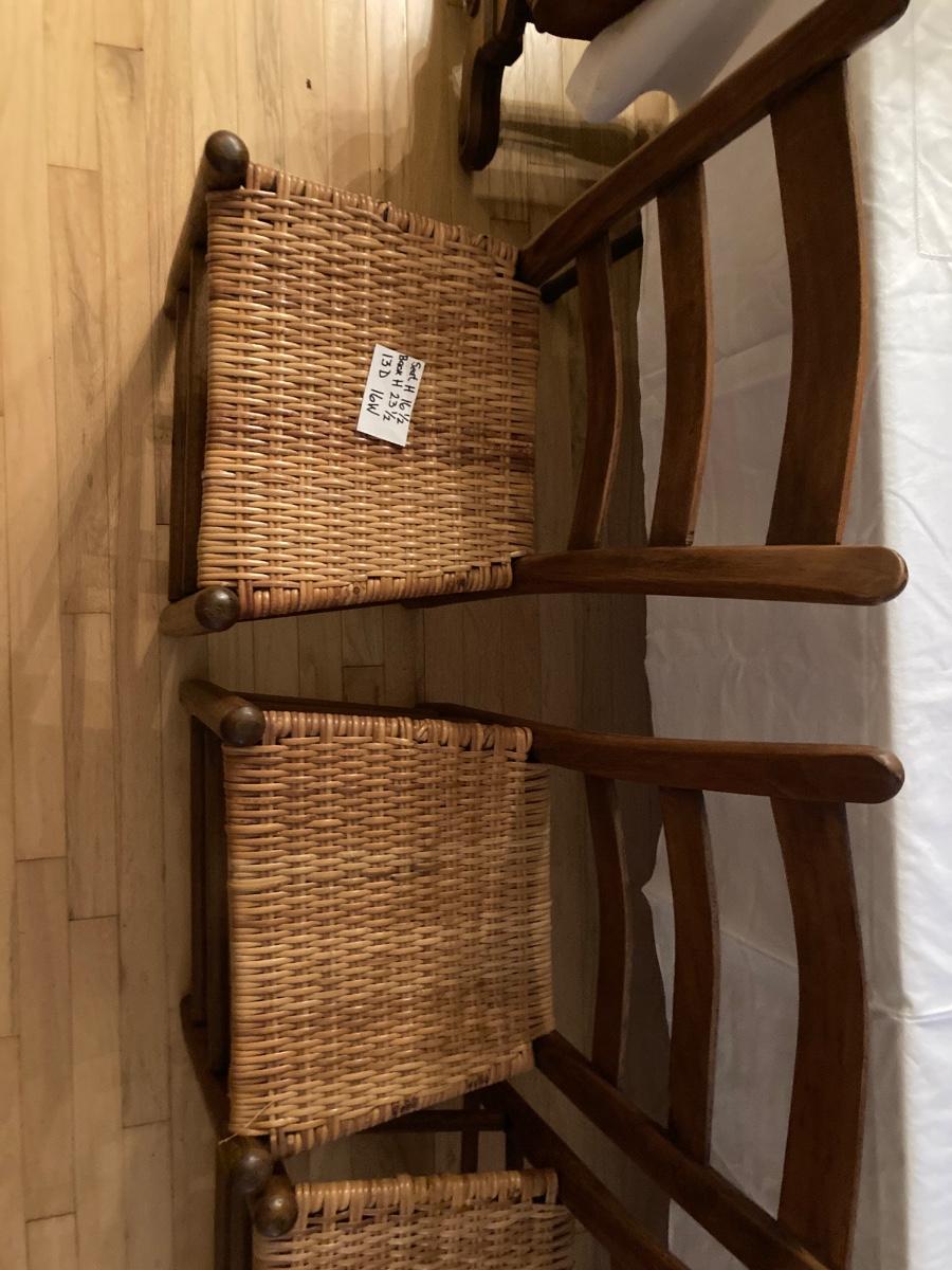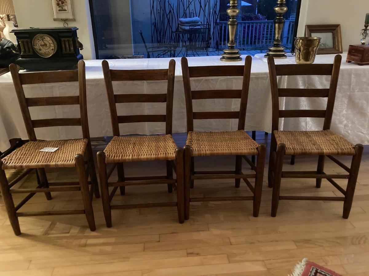 Four antique ladder back mission chairs with woven seat Possibly maple wood 13 d X 16 w X 16 1/2 seat h, 23 1/2 back h VG condition