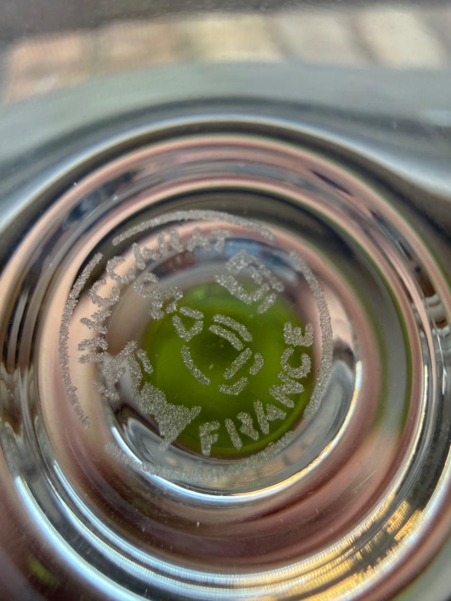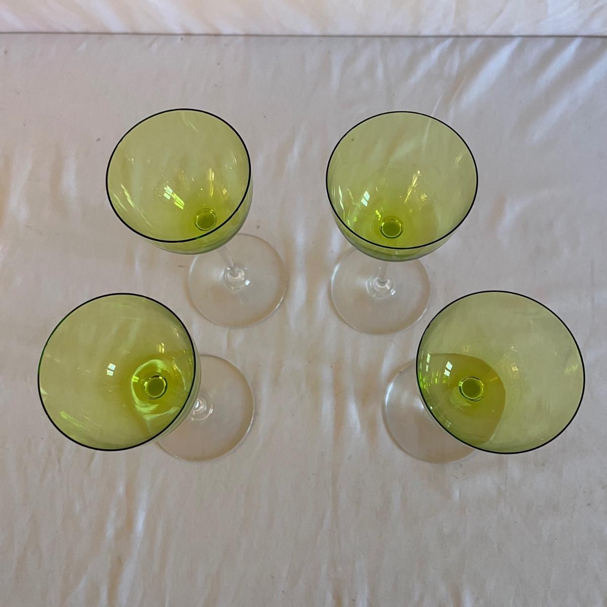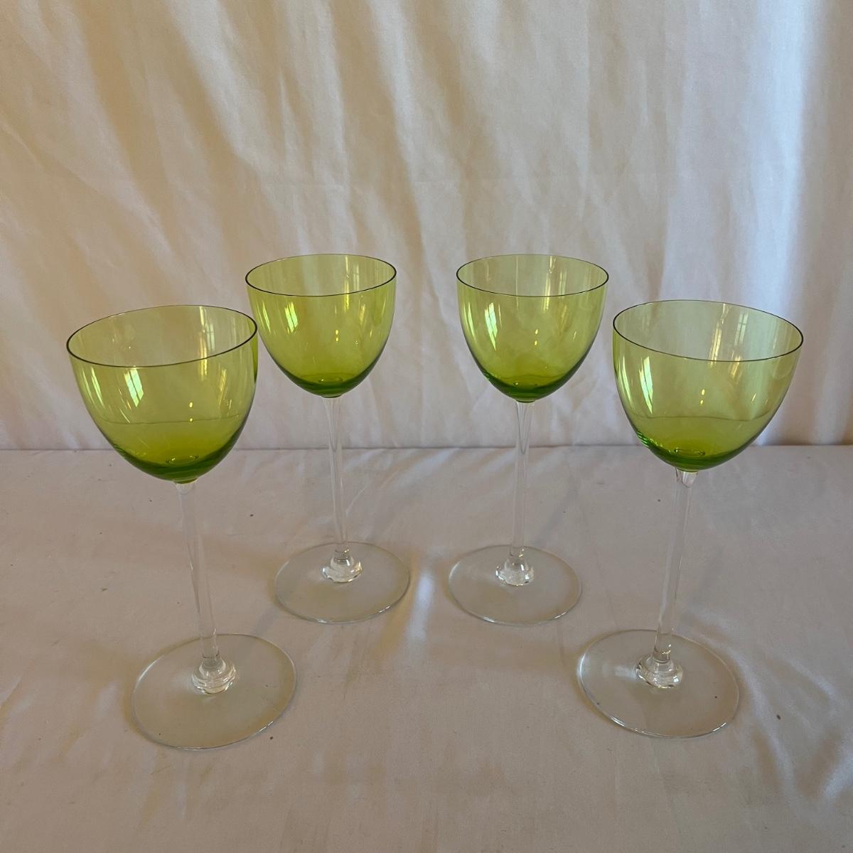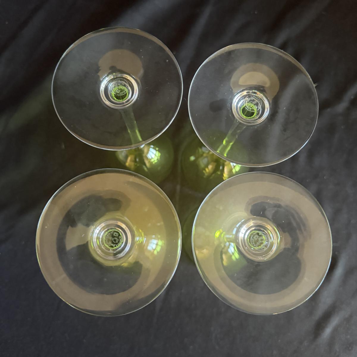 These four Baccarat Rhine wine glasses have a chartreuse bowl with clear stem and base. Glasses measure 3”D x 7.5”H.