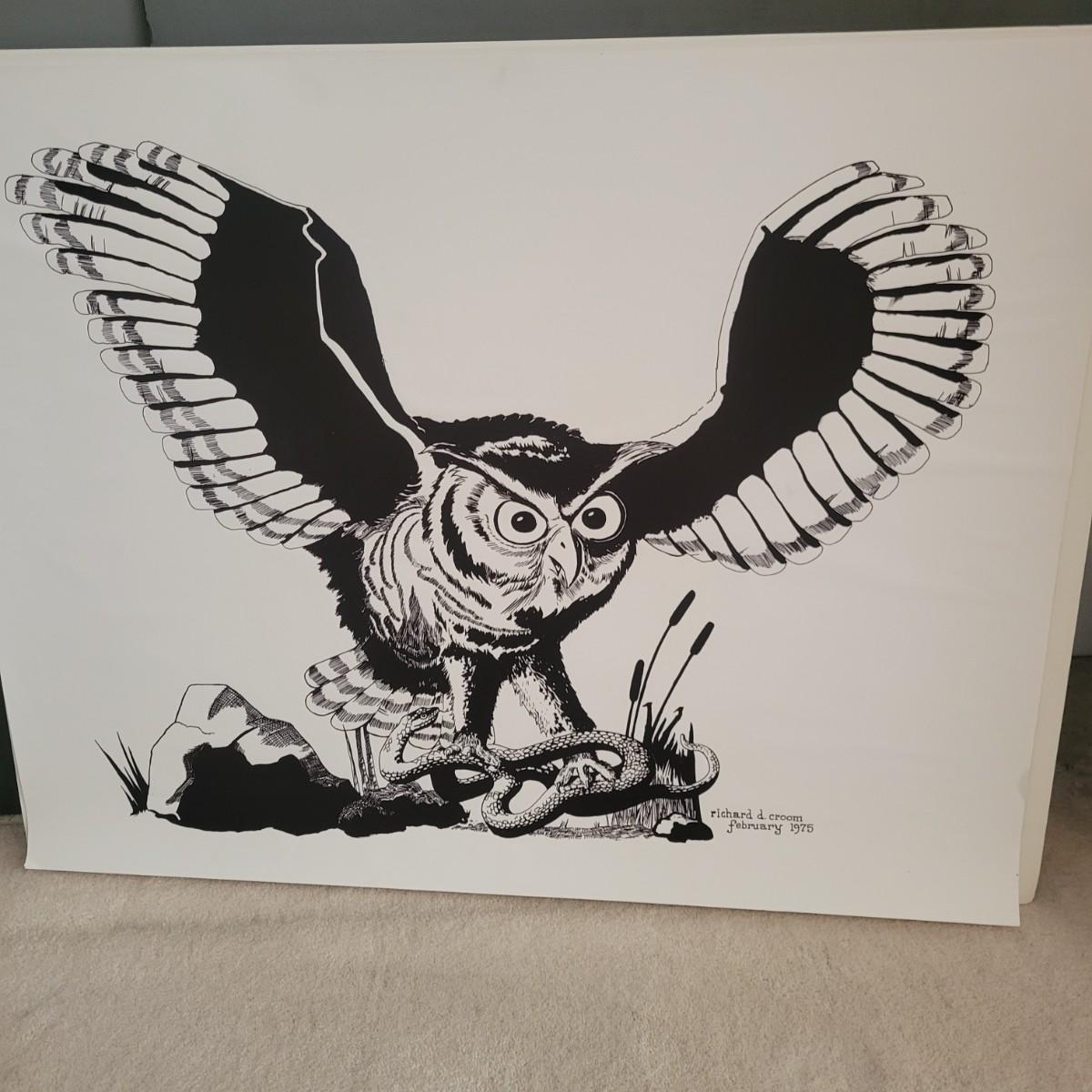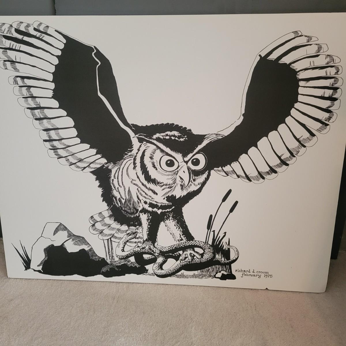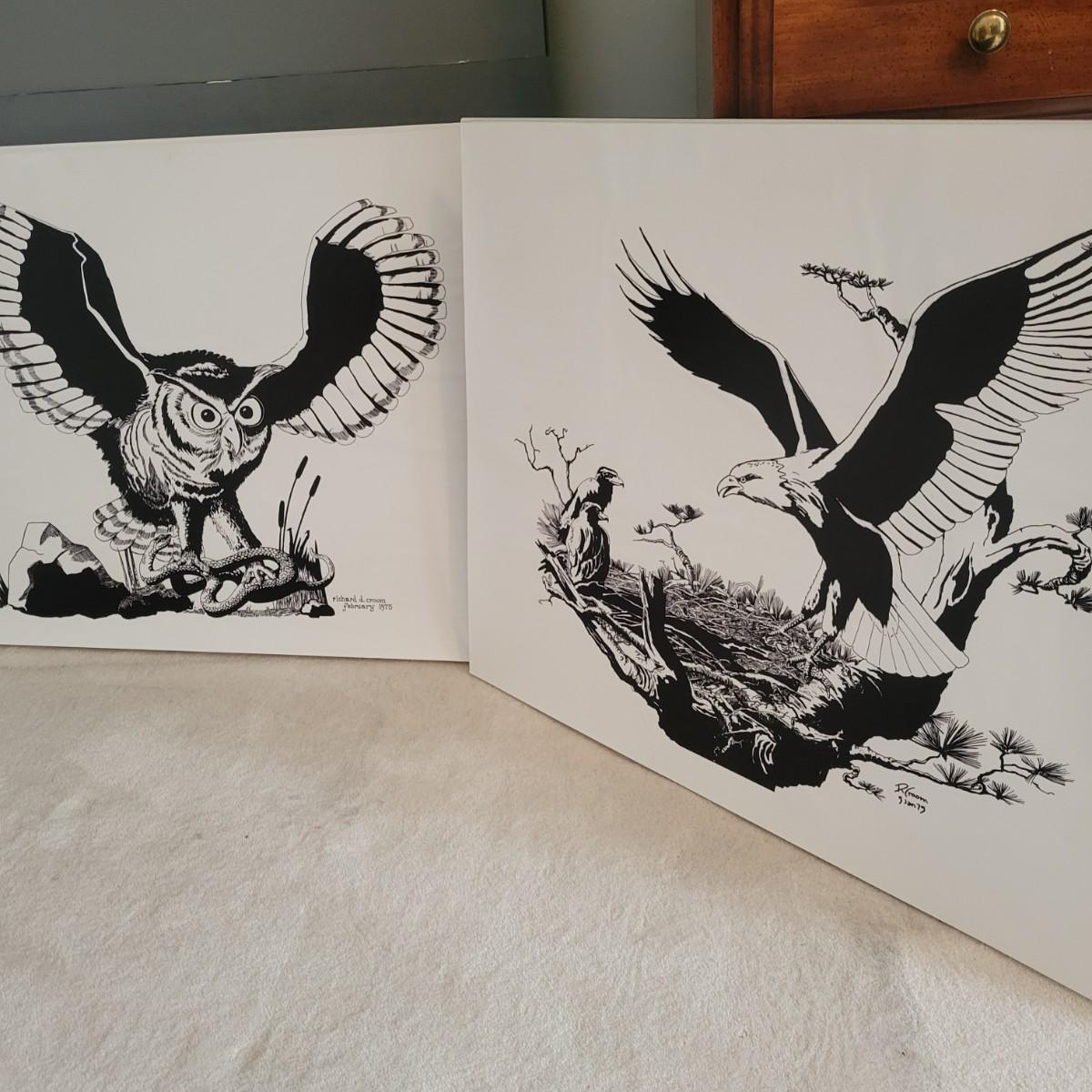 An assortment of four bird prints in good condition. Originally painted by Richard D Croom, these prints are black and white pieces of an eagle and owl. There are two copies of each print. Two are mounted to thin poster board and two are mounted on black foam core. Each piece measures approximately 28" x 22". Shipping available. Shipping can be costly. We suggest calling our local UPS with dimensions and getting an estimate before bidding: (828) 252-6930