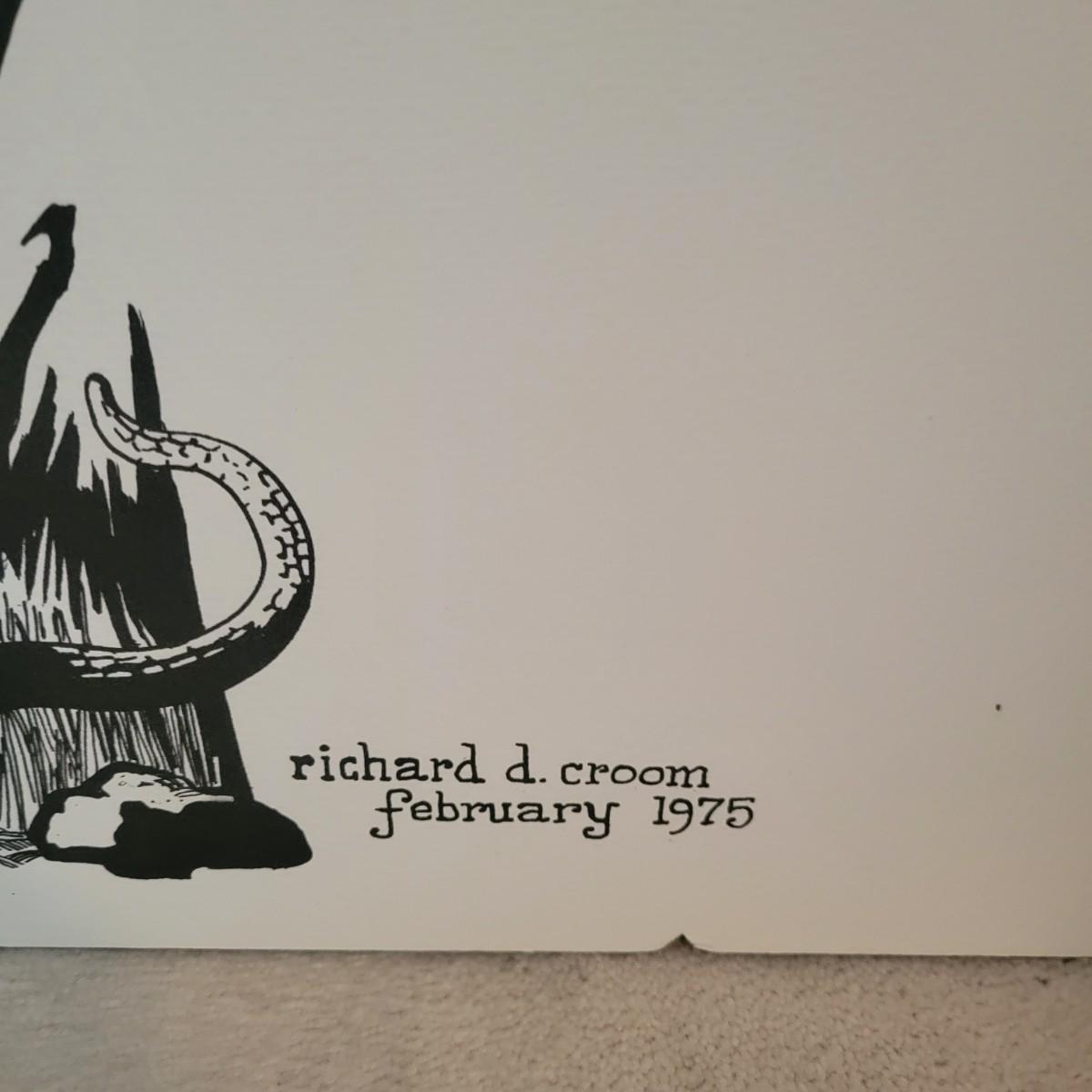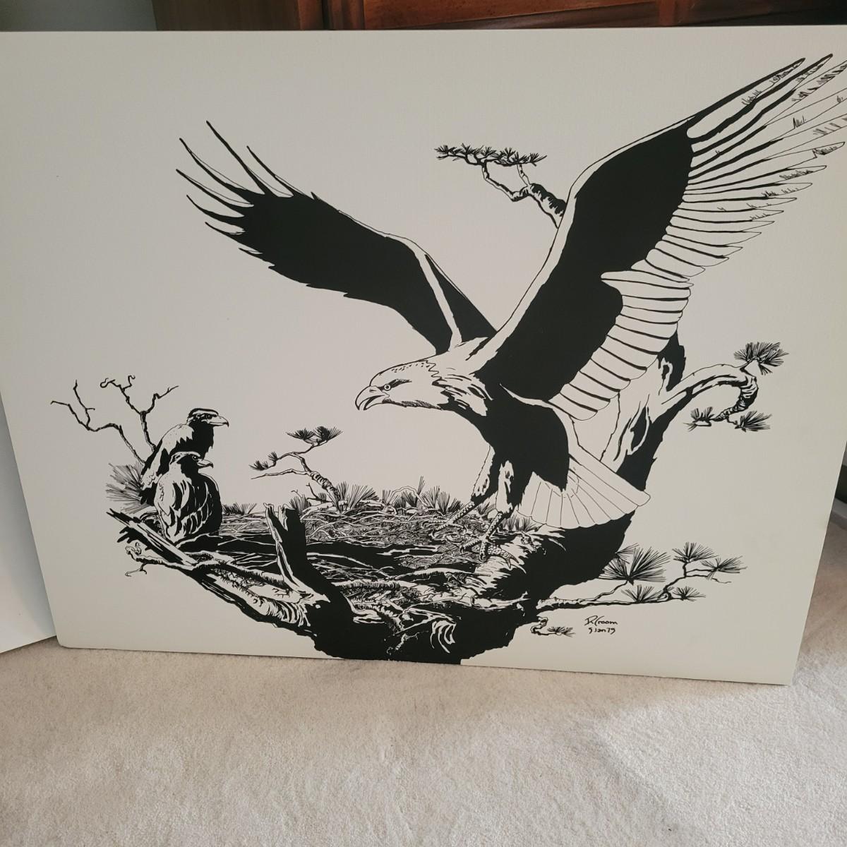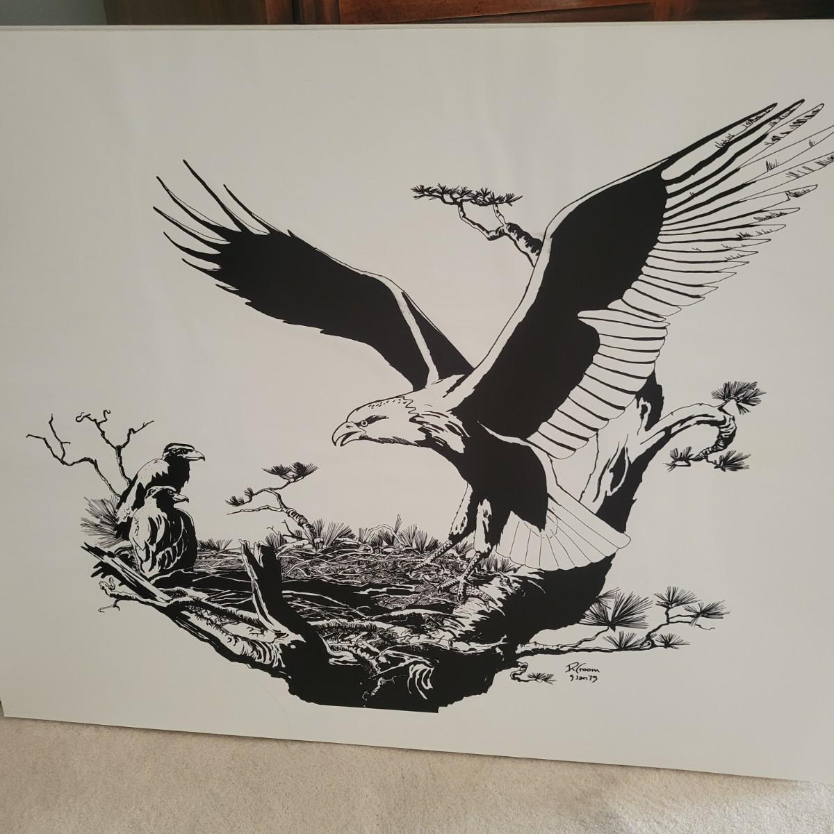 An assortment of four bird prints in good condition. Originally painted by Richard D Croom, these prints are black and white pieces of an eagle and owl. There are two copies of each print. Two are mounted to thin poster board and two are mounted on black foam core. Each piece measures approximately 28" x 22". Shipping available. Shipping can be costly. We suggest calling our local UPS with dimensions and getting an estimate before bidding: (828) 252-6930
