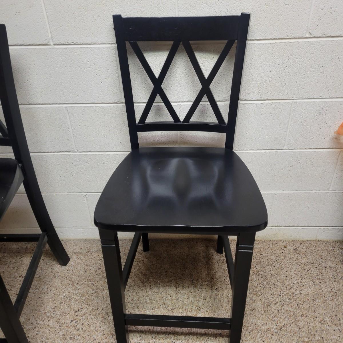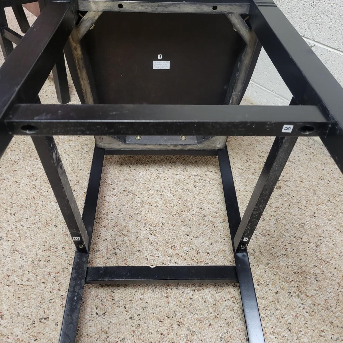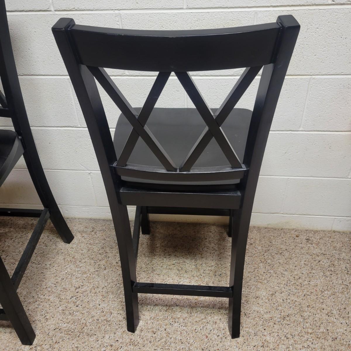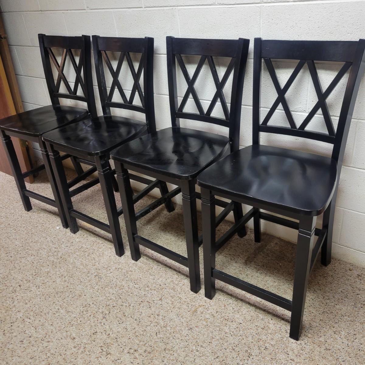 These four matching stools have a black enamel finish and measure approximately 18" x 18" x 39" with a seat height of 24". They are in good condition with some minor blemishes, as seen in the pictures. Local pickup only