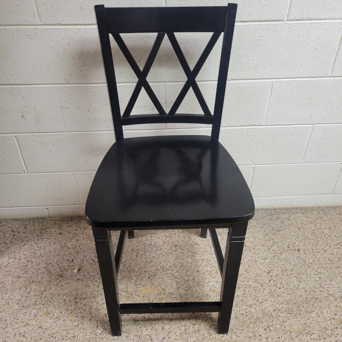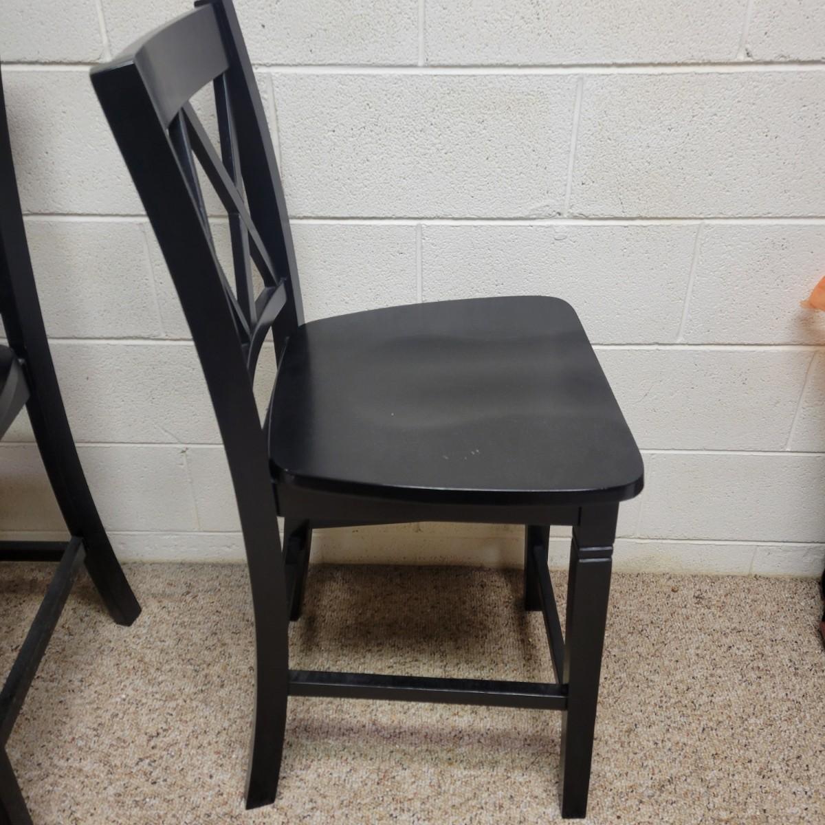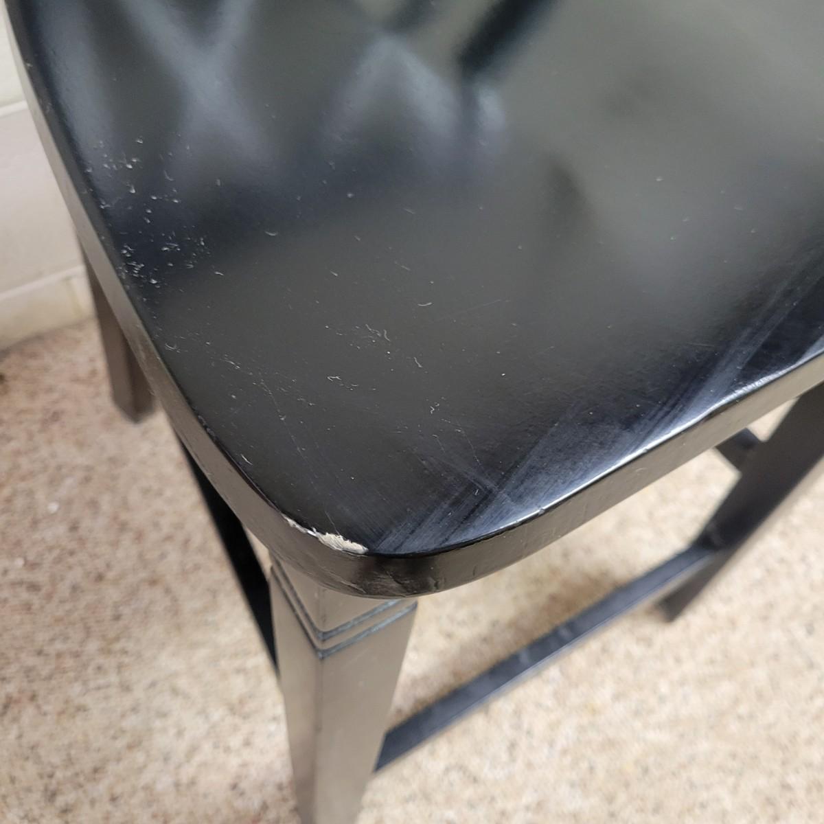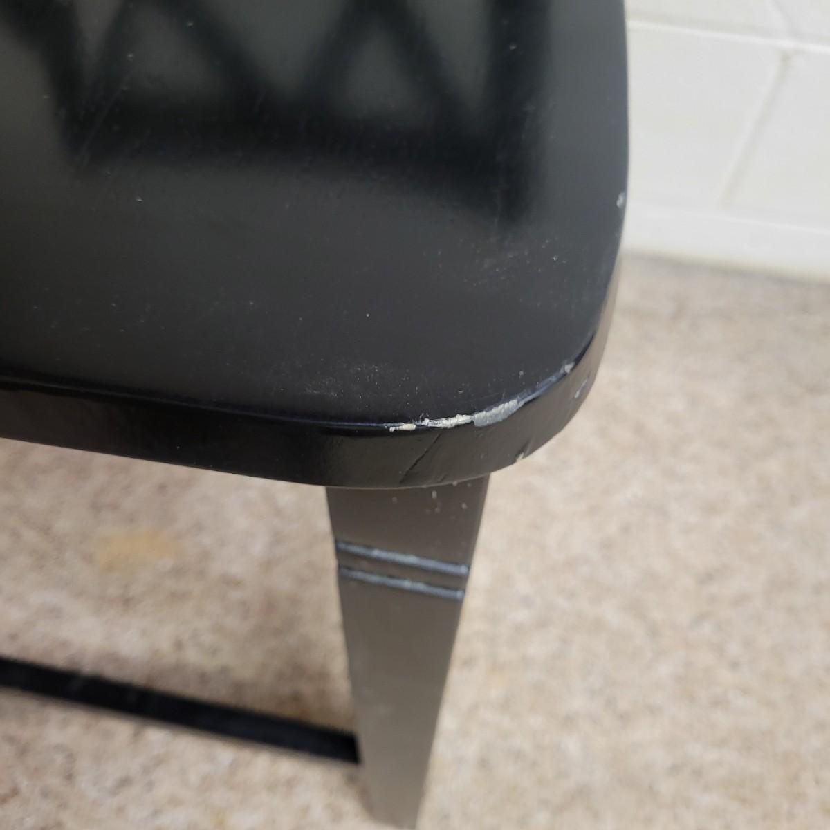 These four matching stools have a black enamel finish and measure approximately 18" x 18" x 39" with a seat height of 24". They are in good condition with some minor blemishes, as seen in the pictures. Local pickup only