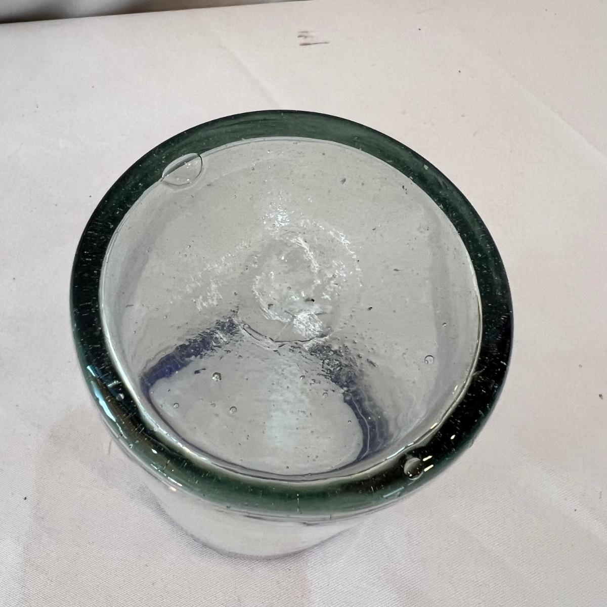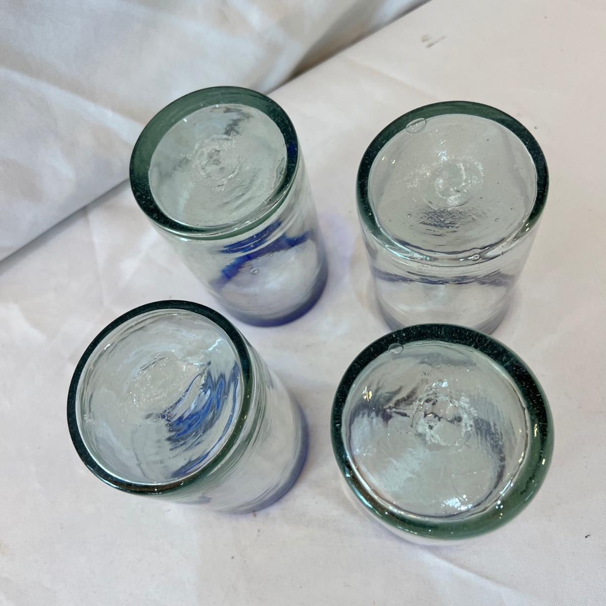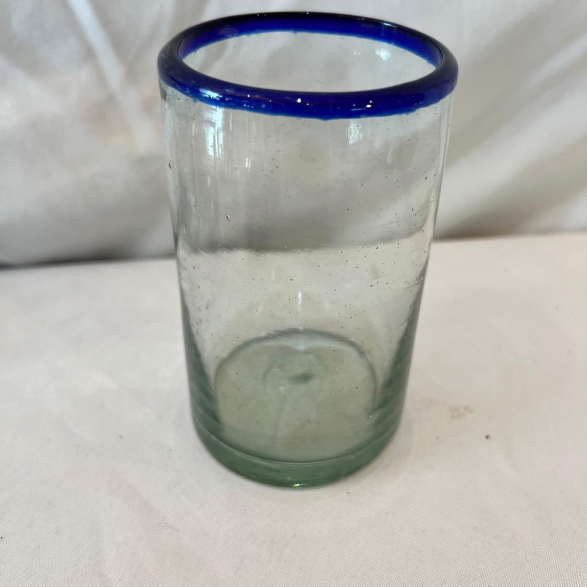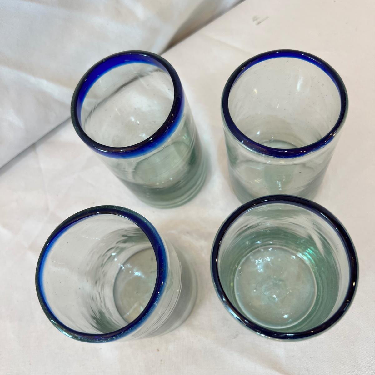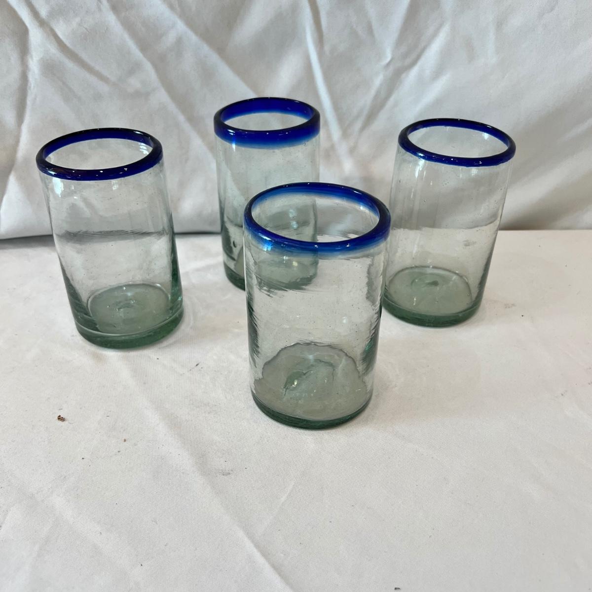 Four glasses with a dark blue lip rim. Each glass measures 3” x 5”H