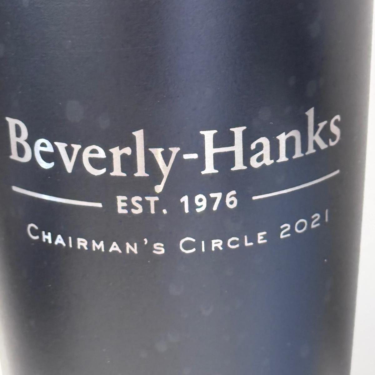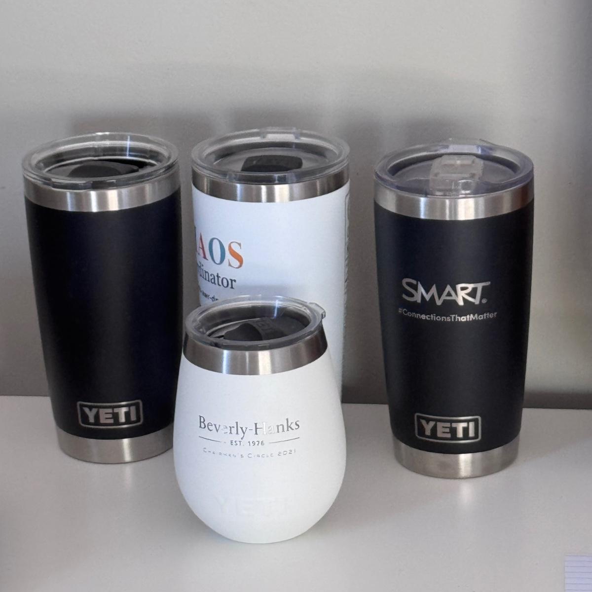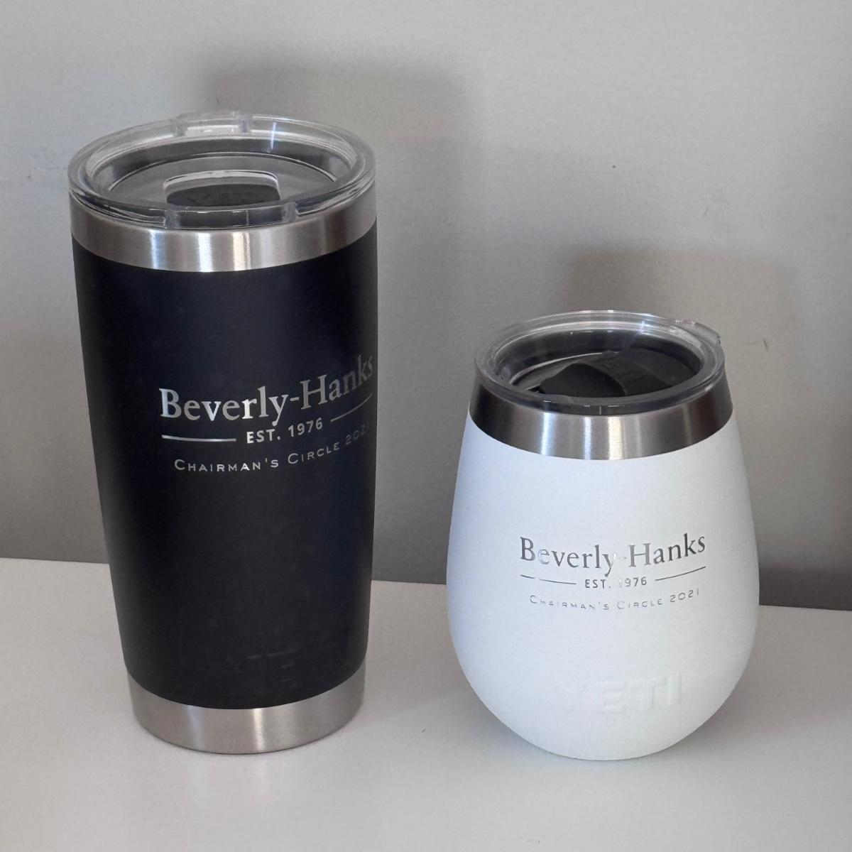 This lot includes four 10 oz Yeti tumblers that have been branded. Two of the tumblers are branded with Beverly-Hanks, one with “SMART - #connectionthatmatters,” and the last has a blurb about a “Chaos Coordinator.” One of the Beverly-Hanks tumblers is a wine tumbler. Shipping available.
