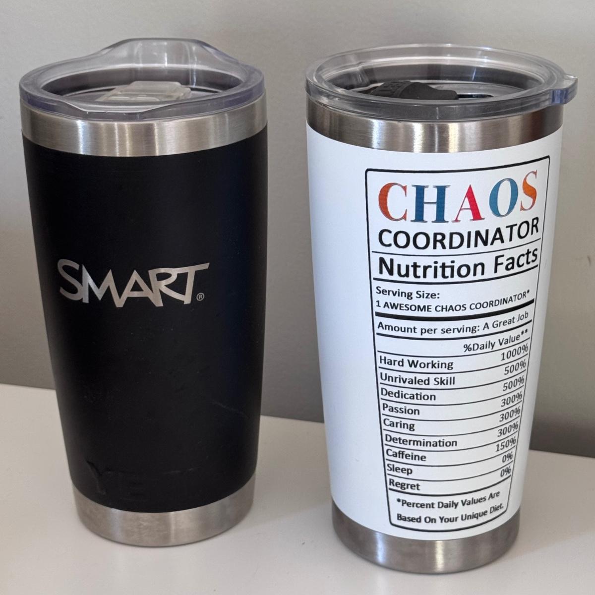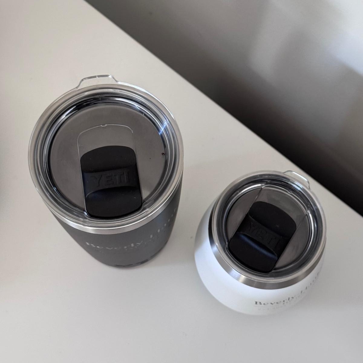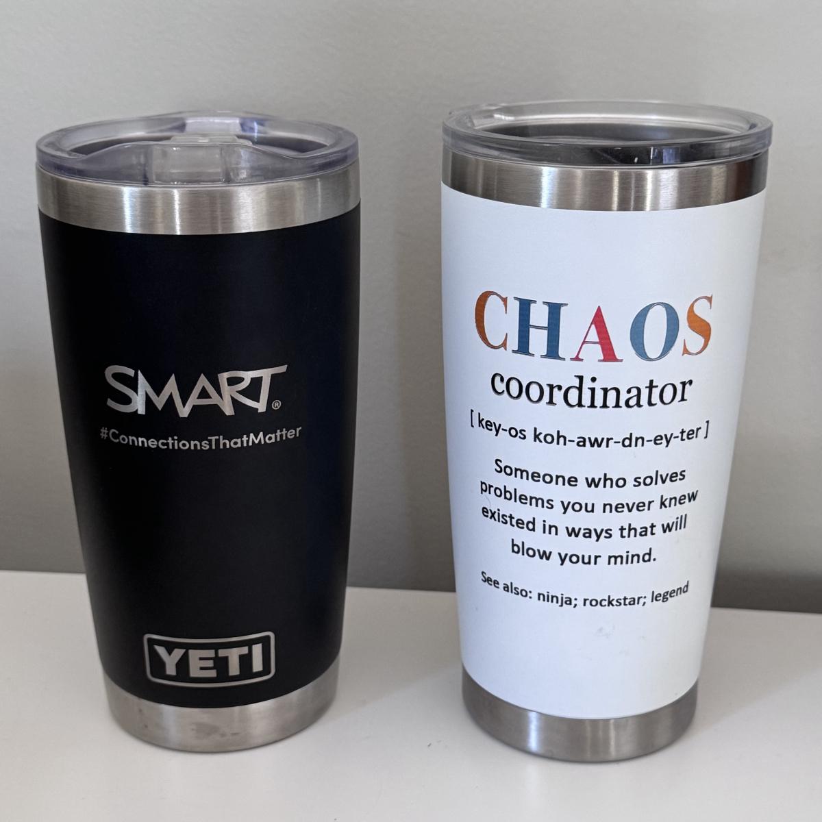 This lot includes four 10 oz Yeti tumblers that have been branded. Two of the tumblers are branded with Beverly-Hanks, one with “SMART - #connectionthatmatters,” and the last has a blurb about a “Chaos Coordinator.” One of the Beverly-Hanks tumblers is a wine tumbler. Shipping available.