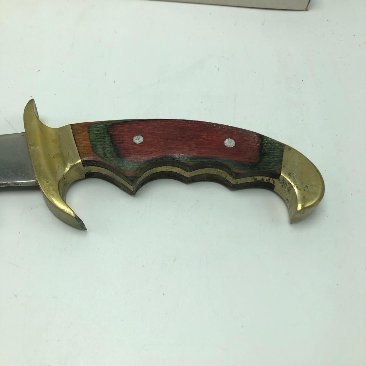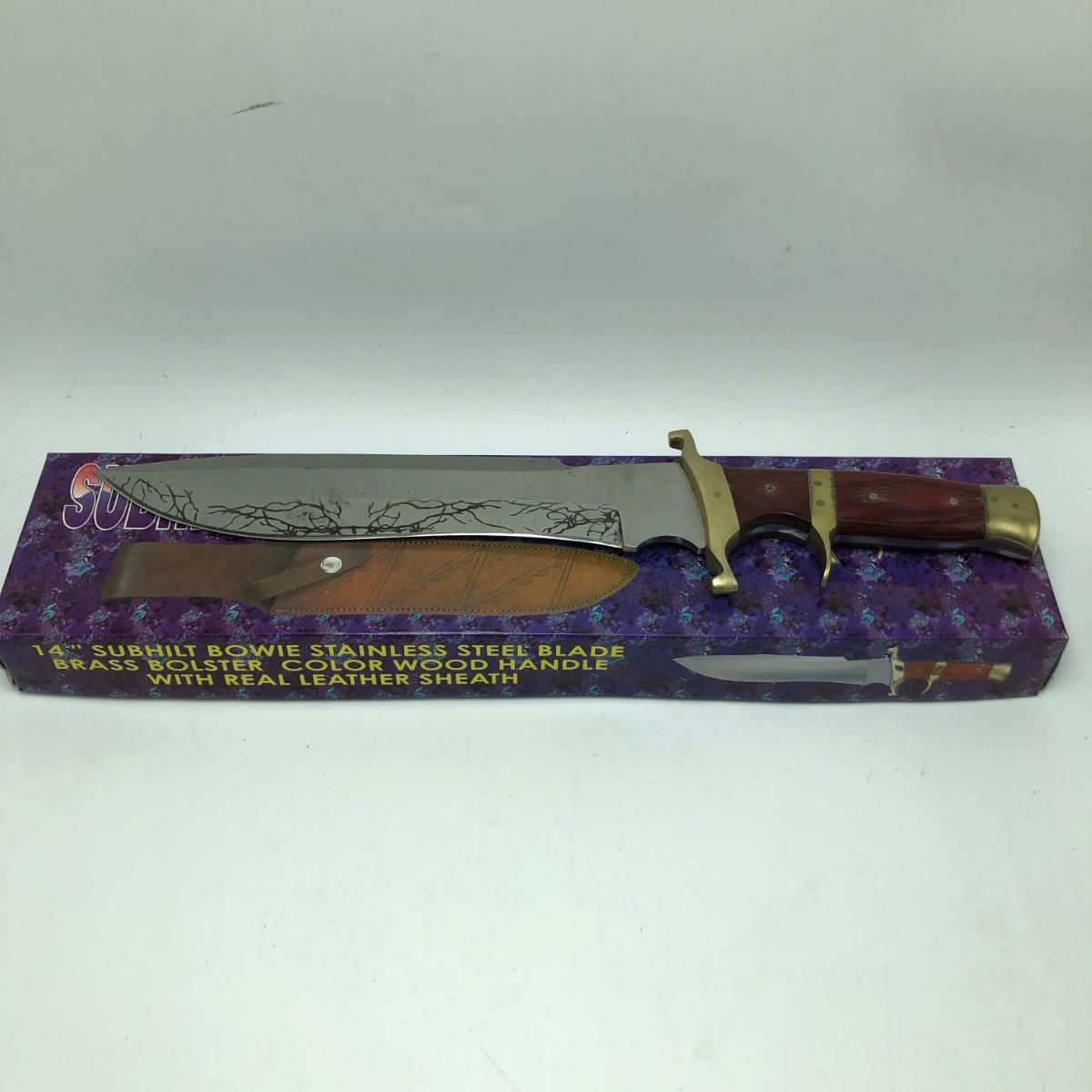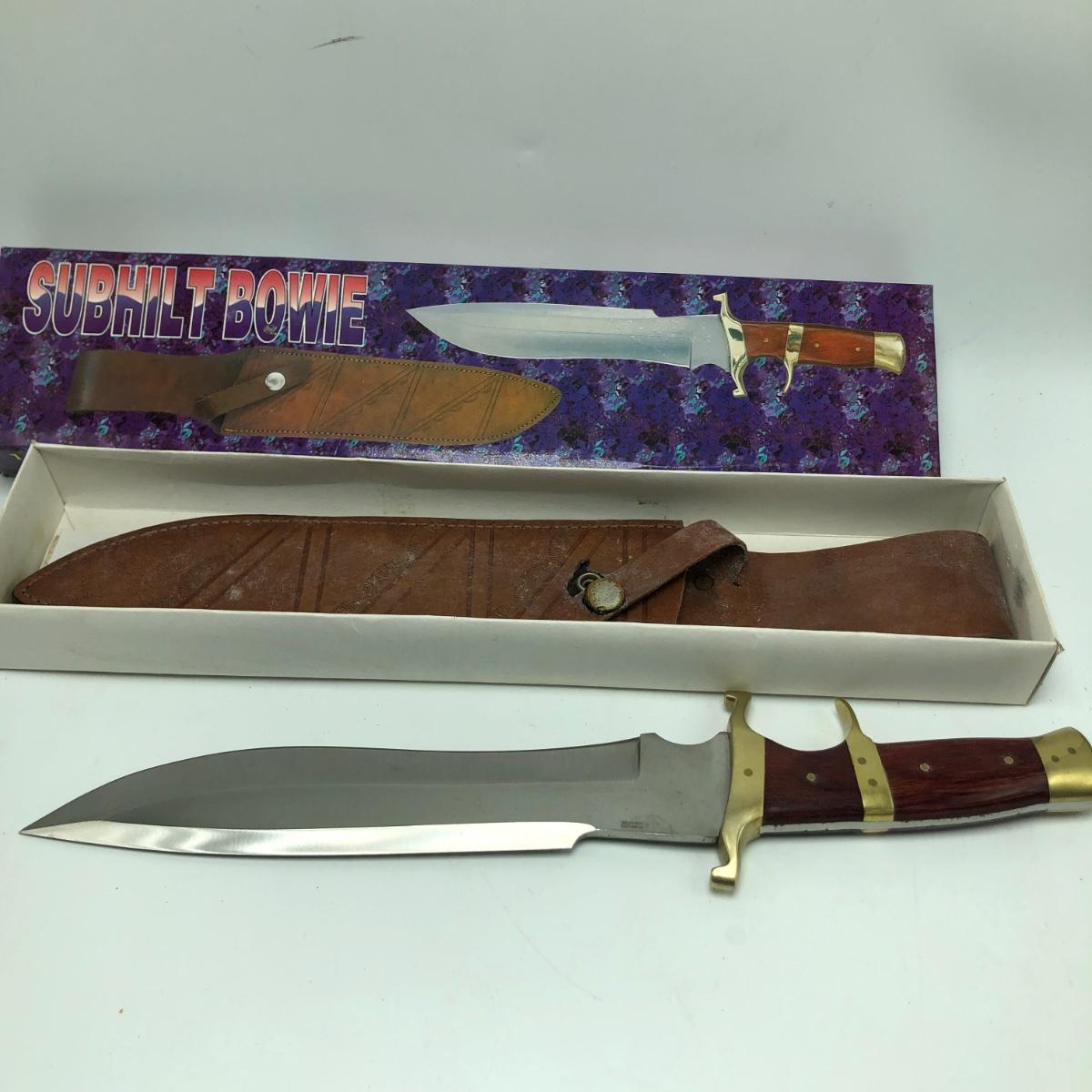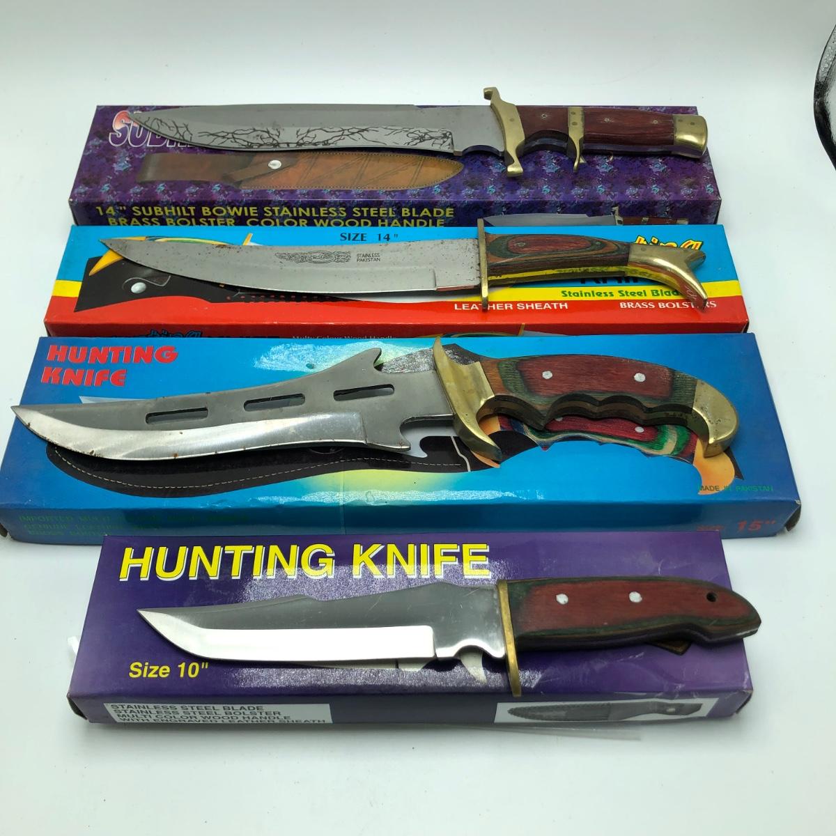 Lot includes four brass and wood handled Bowie knives in the original boxes with three having sheathes. Knives have rust and mildew, see pictures. Longest knife measures 14” long.