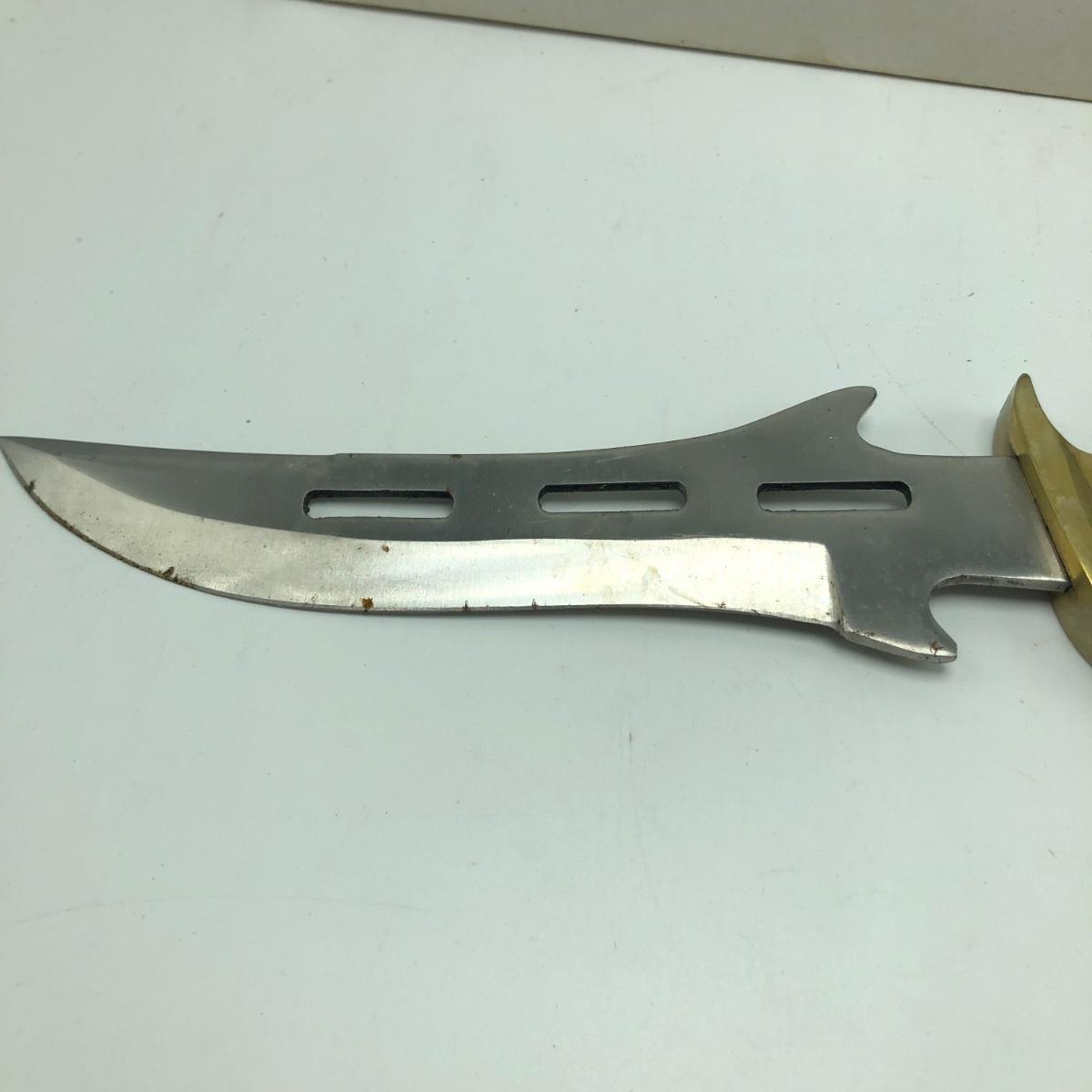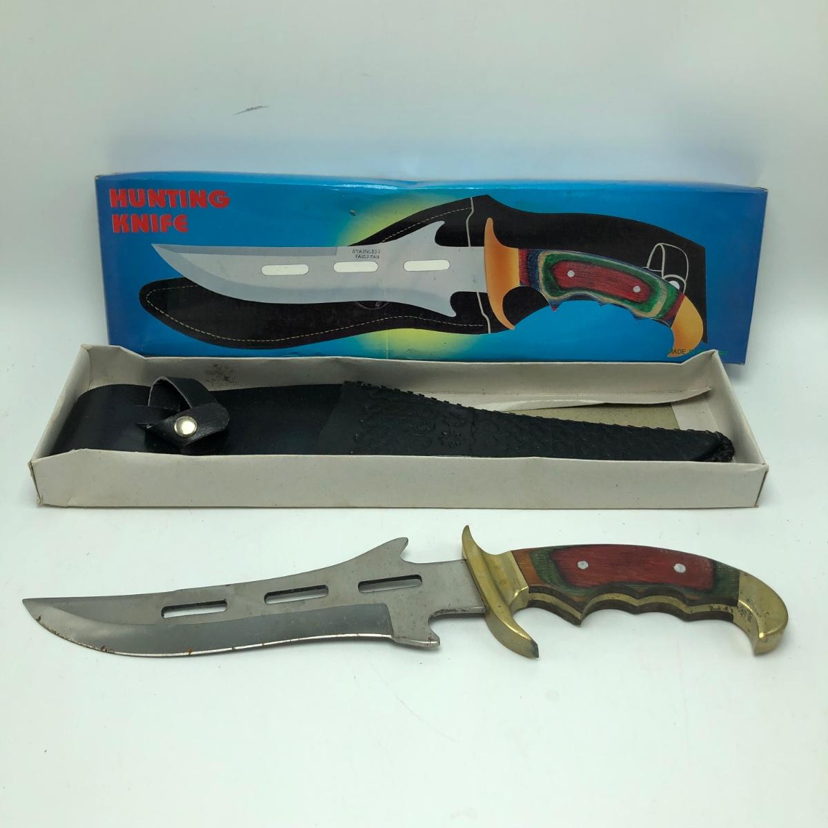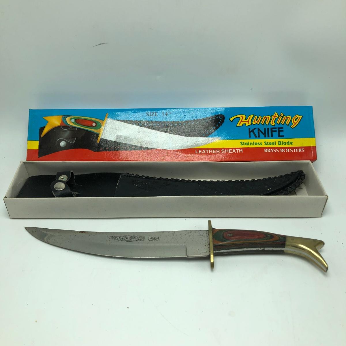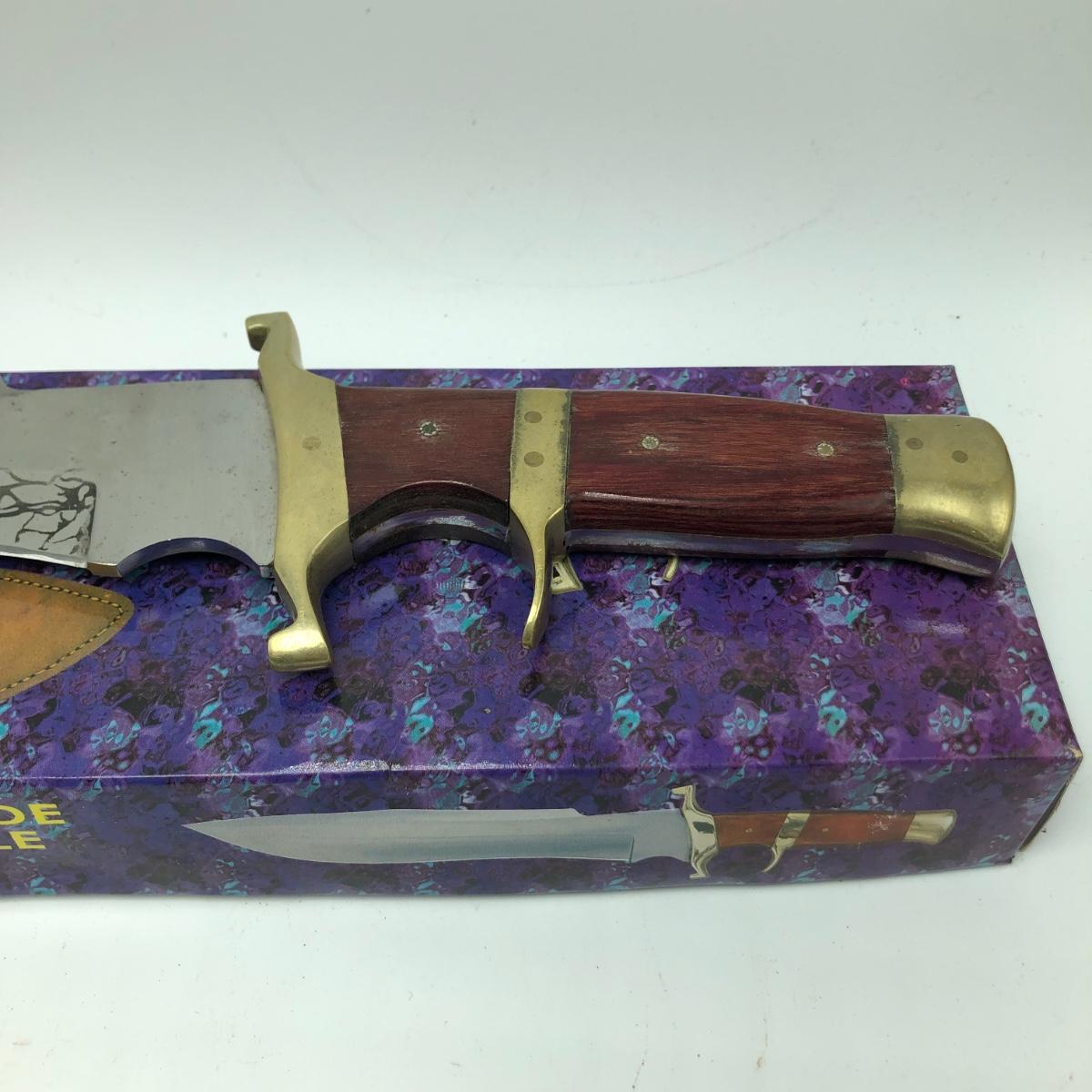 Lot includes four brass and wood handled Bowie knives in the original boxes with three having sheathes. Knives have rust and mildew, see pictures. Longest knife measures 14” long.