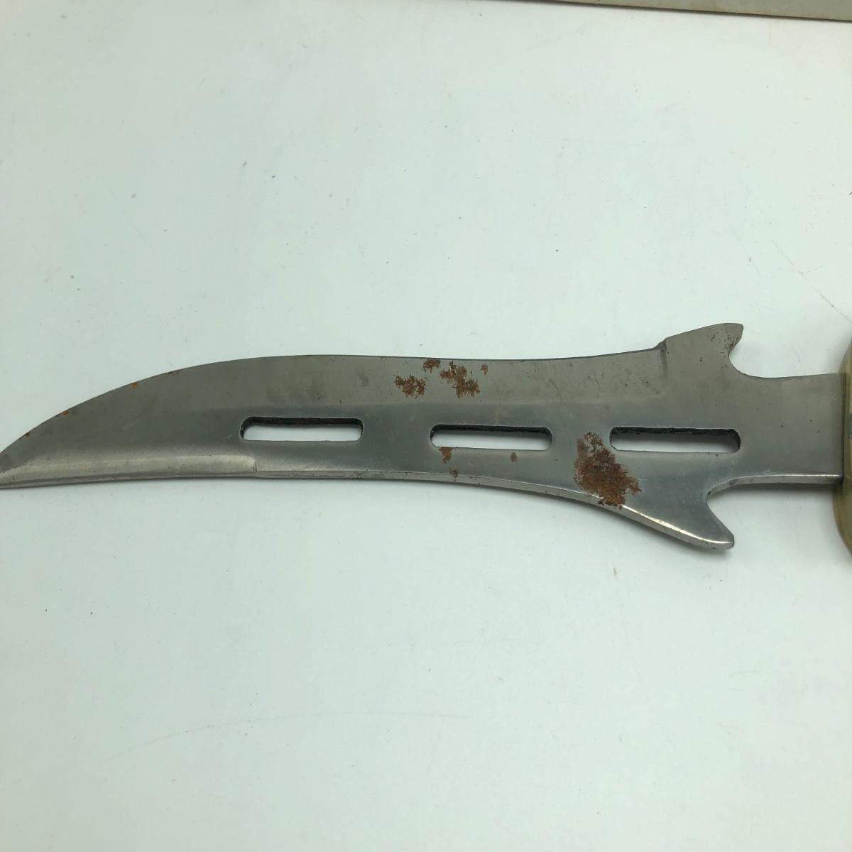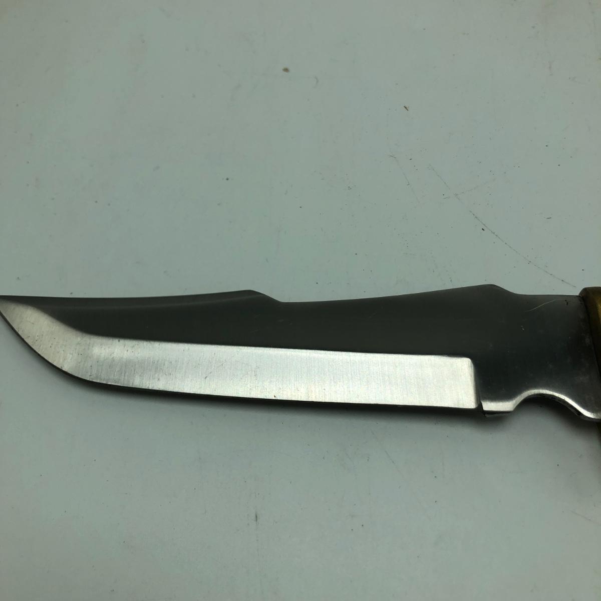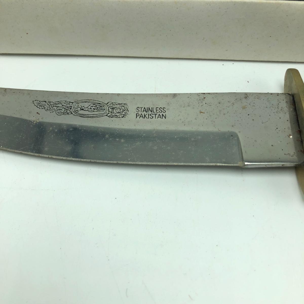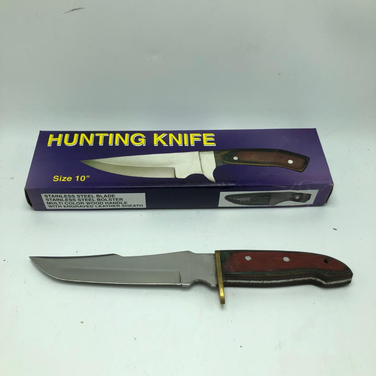 Lot includes four brass and wood handled Bowie knives in the original boxes with three having sheathes. Knives have rust and mildew, see pictures. Longest knife measures 14” long.