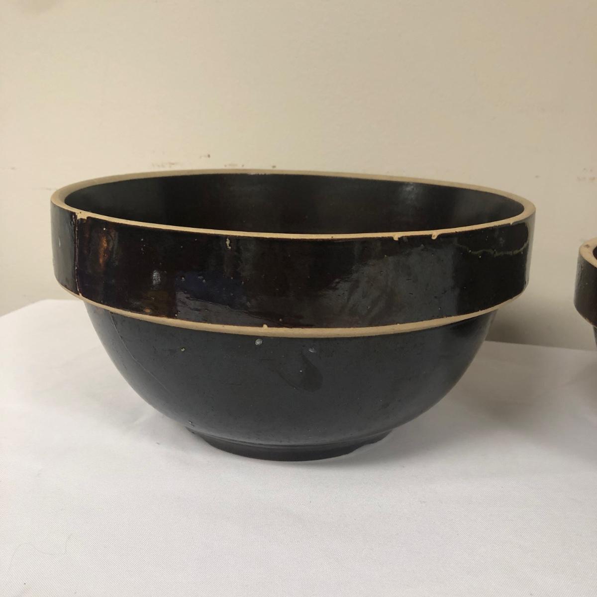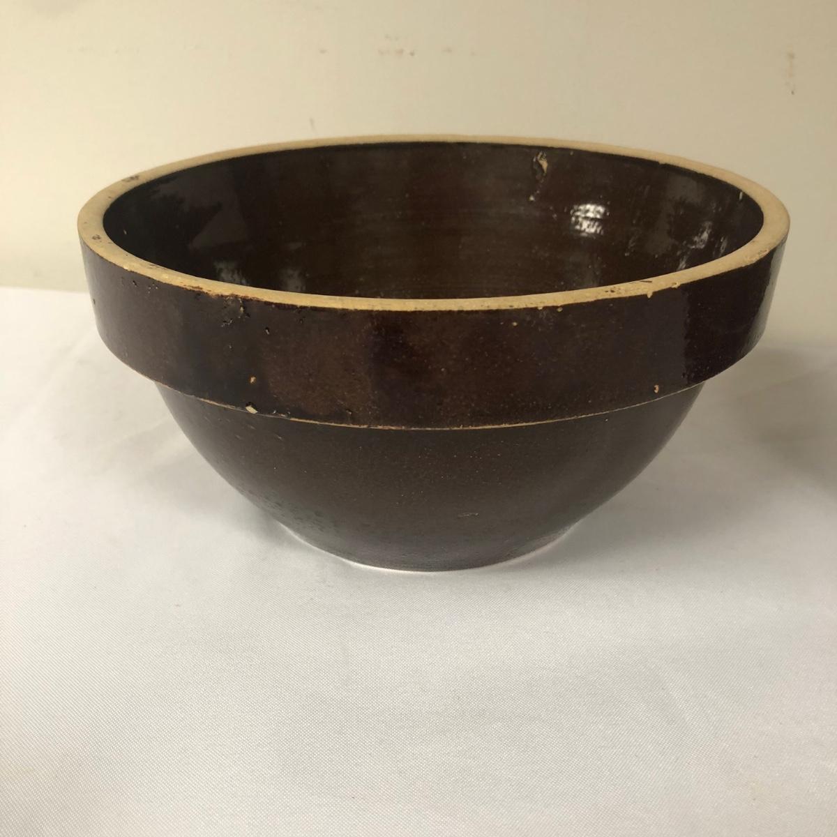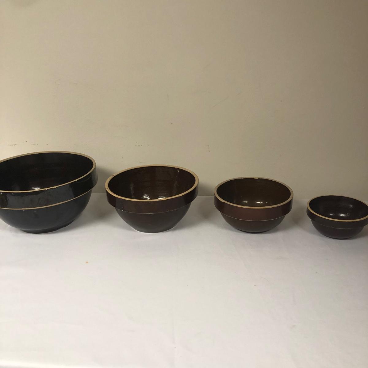 This lot includes four mason bowls. They measure 10.5”, 8.5”, 7” and 5.5”. The largest bowl has a crack from the top to the bottom and a chip in the edge. The 7” bowl also has three small chips on the edge. Shipping Available.