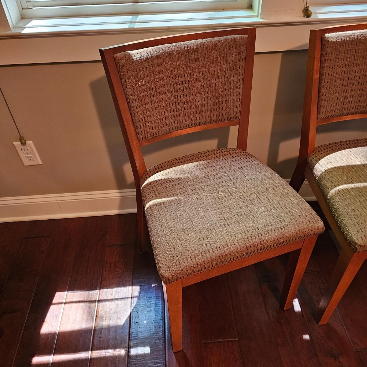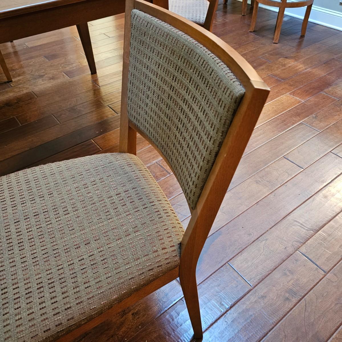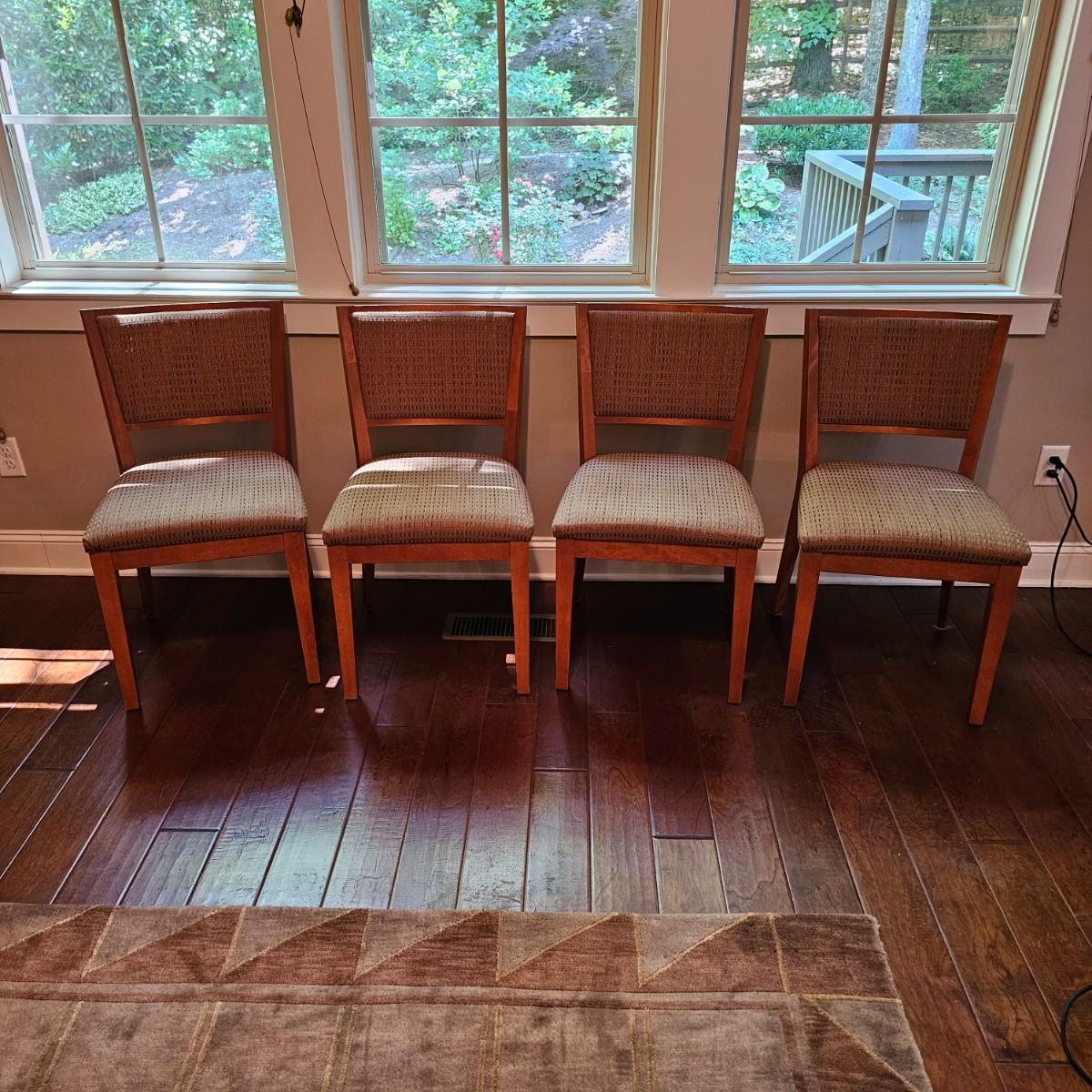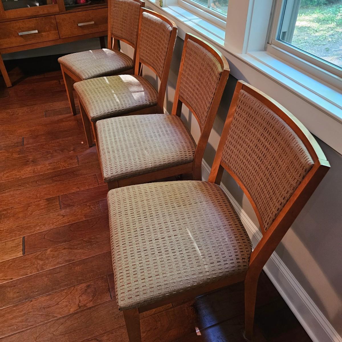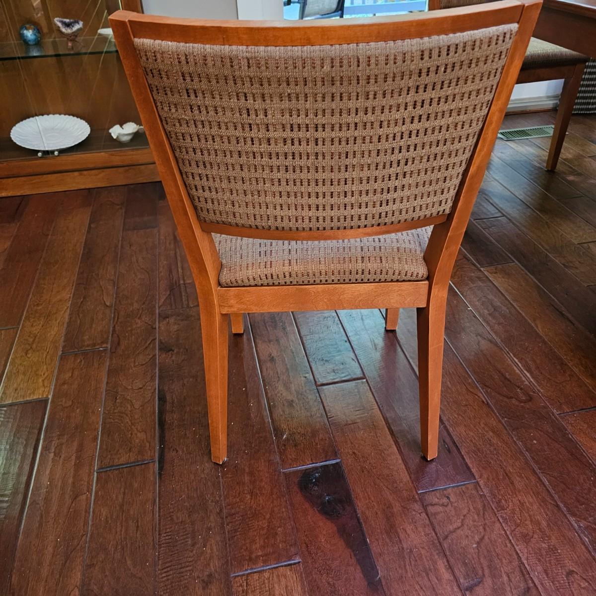 Set of four maple dining chairs by Canadel of Canada. Chairs have tan/brown patterned fabric seat and back. Each chair measures 19" x 22" x 30"H, has seat height of 20". Also see listing for dining table in this auction. See photos for details. Chairs match a pair of bar stools offered in another lot in this auction. Local pickup only.