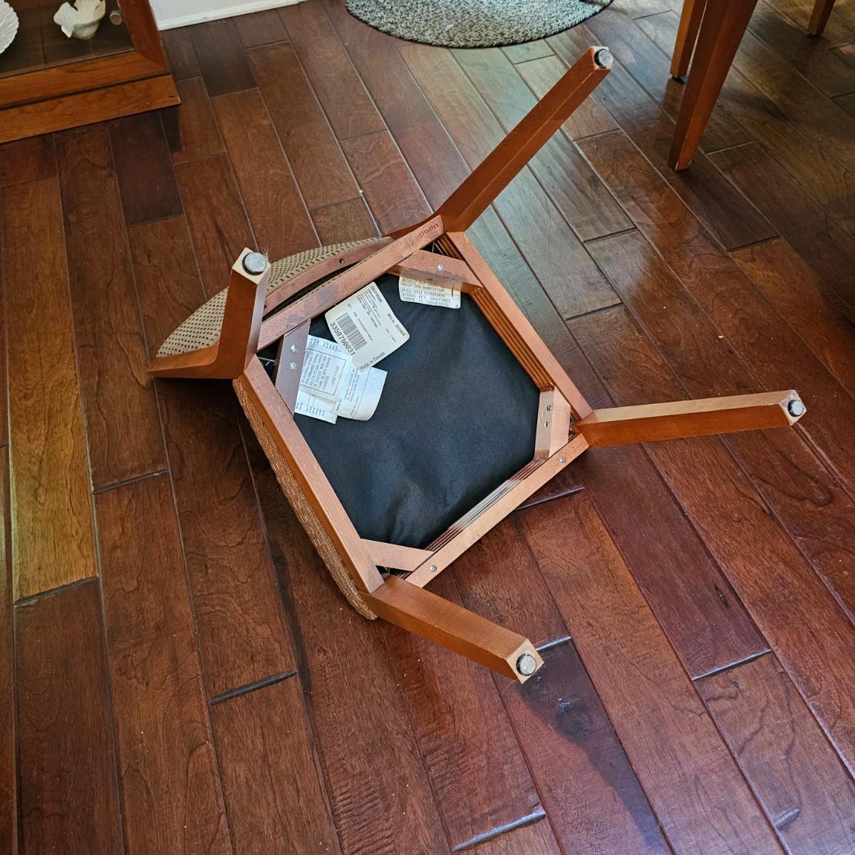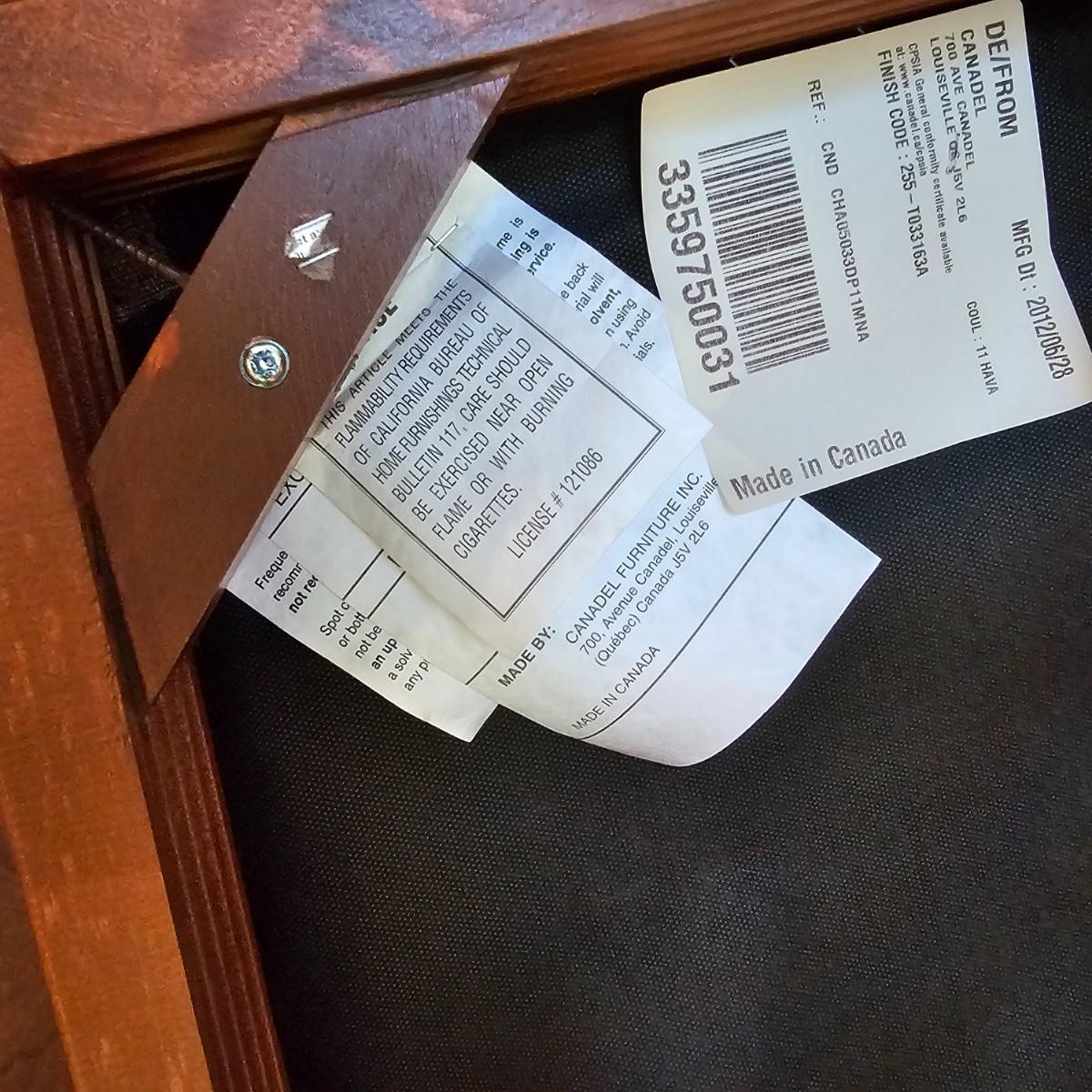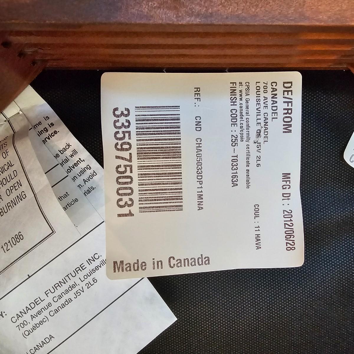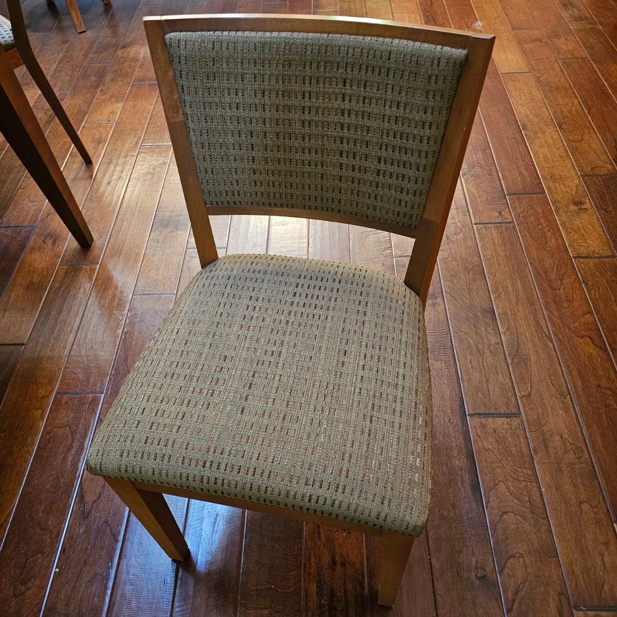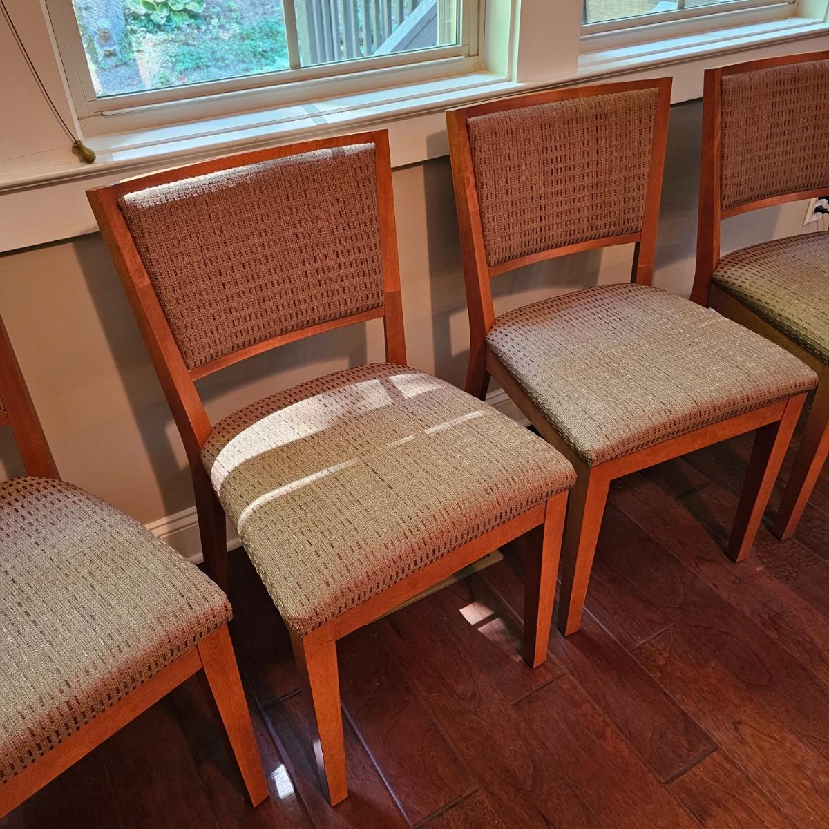 Set of four maple dining chairs by Canadel of Canada. Chairs have tan/brown patterned fabric seat and back. Each chair measures 19" x 22" x 30"H, has seat height of 20". Also see listing for dining table in this auction. See photos for details. Chairs match a pair of bar stools offered in another lot in this auction. Local pickup only.