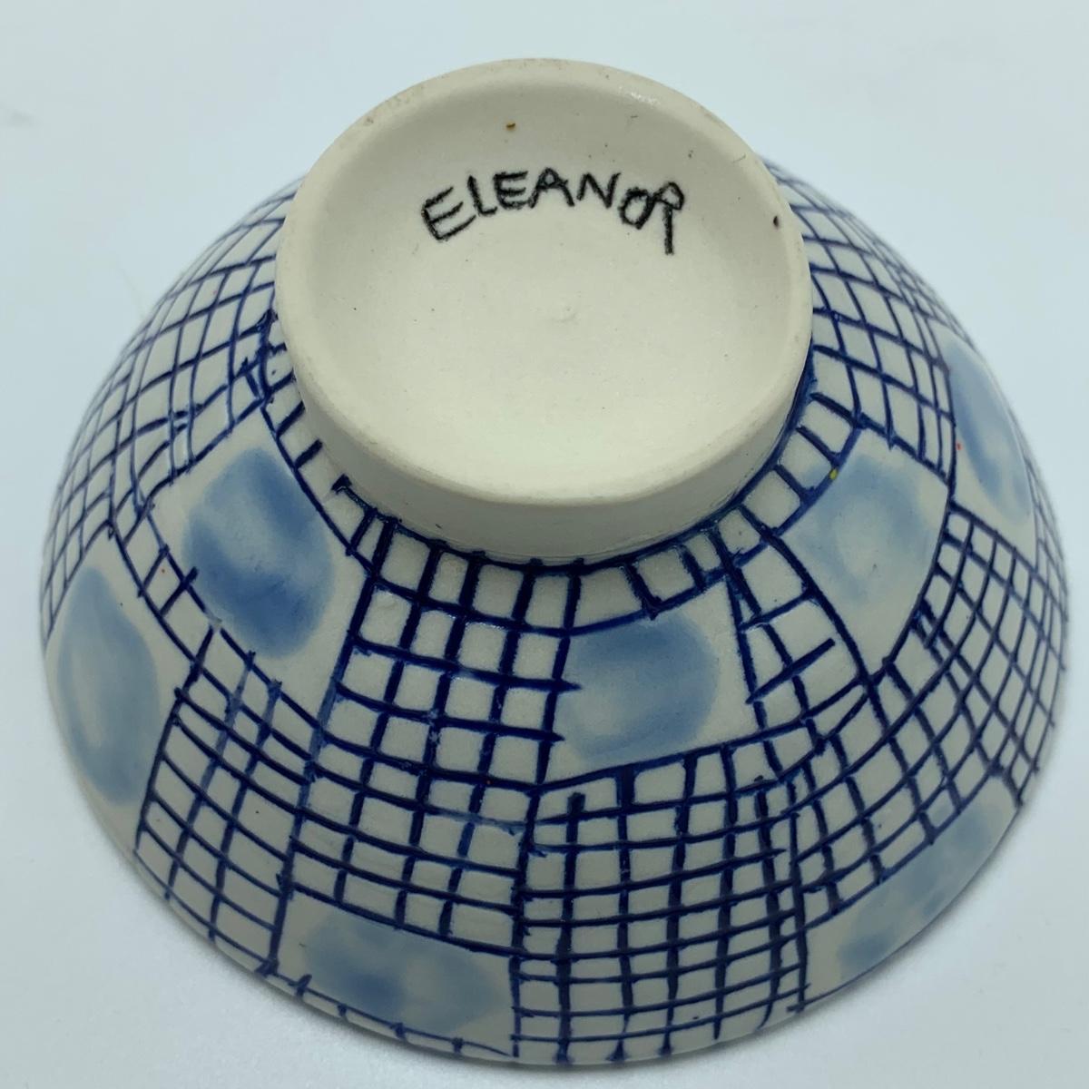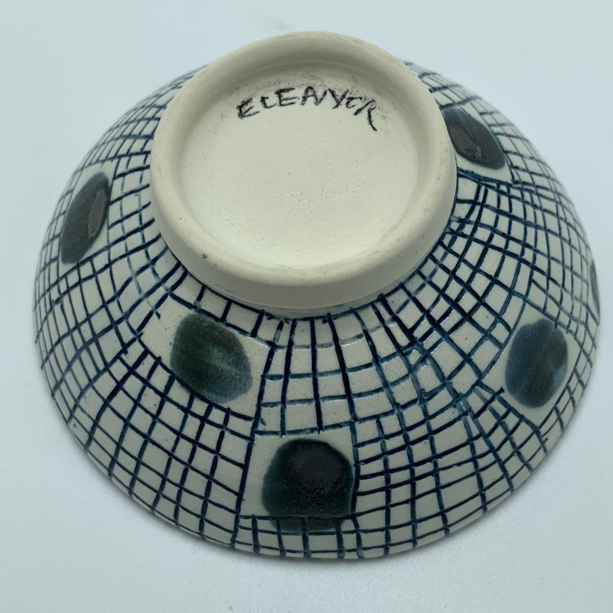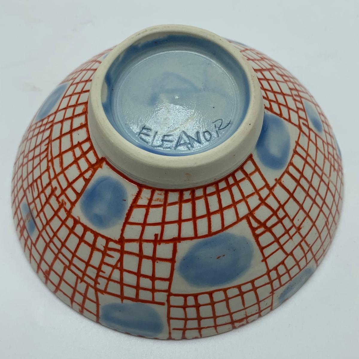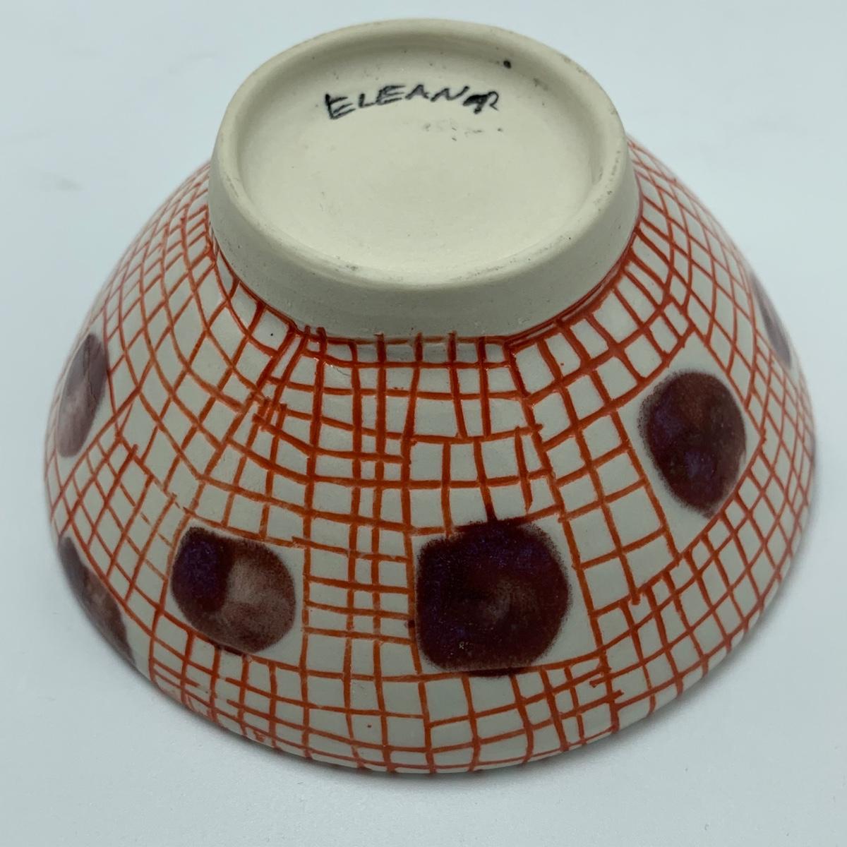 There are four little bowls in this lot, all signed by “Eleanor”. Three of them are about the same size with a top diameter of 4.5” and are about 2” tall. The larger bowl with the red and blue has a top diameter of 5.25” and is 2.25” tall. They all appear to be in excellent condition. Shipping Available.