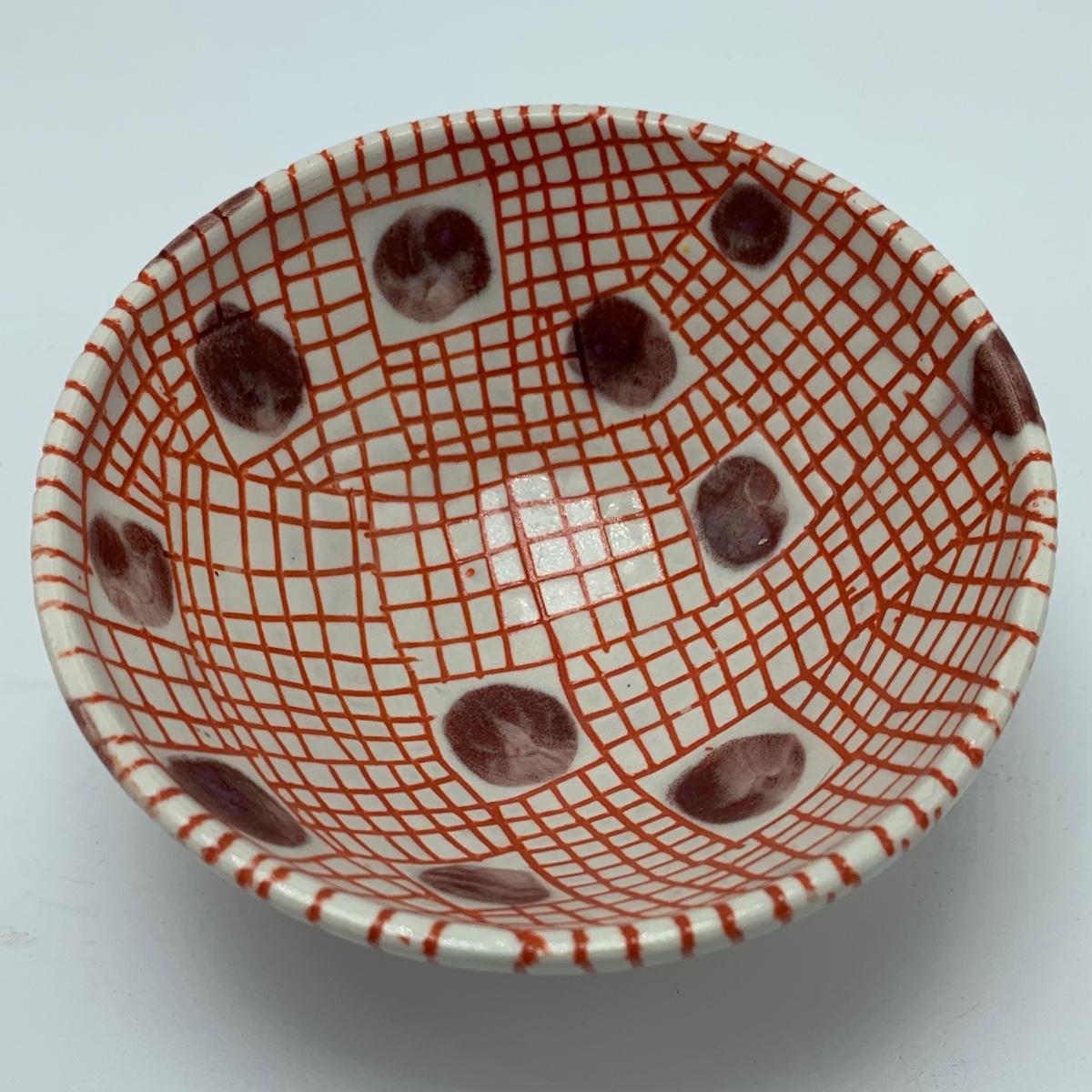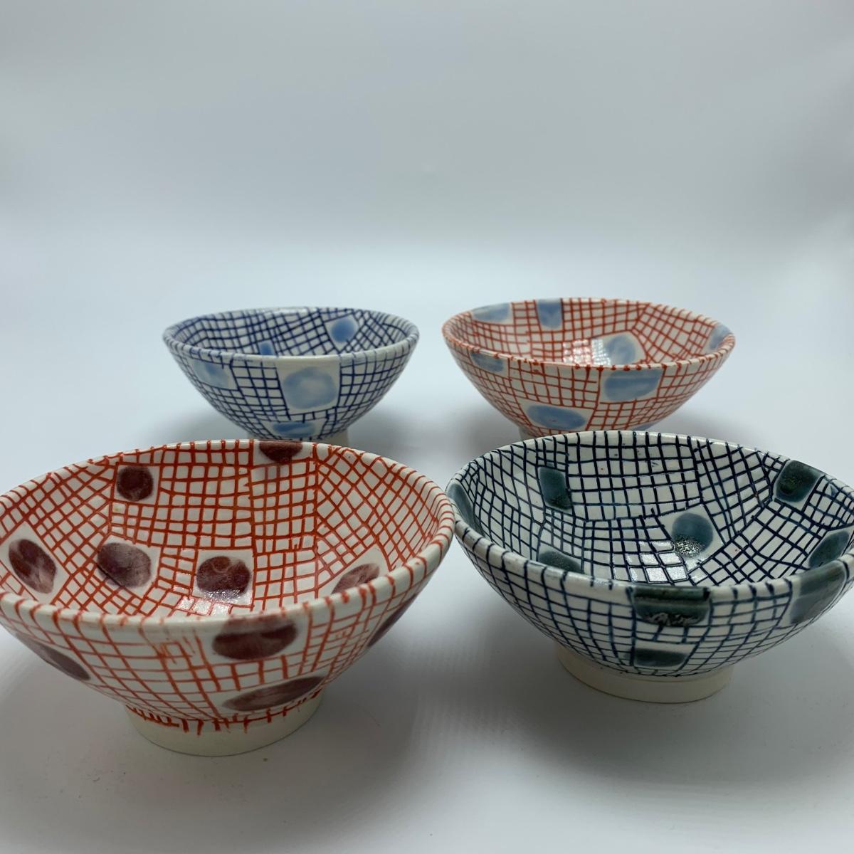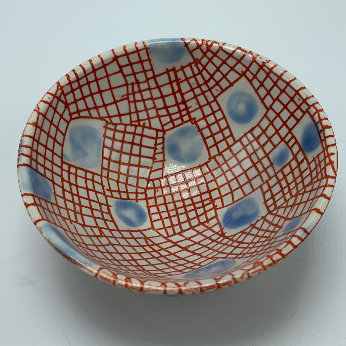 There are four little bowls in this lot, all signed by “Eleanor”. Three of them are about the same size with a top diameter of 4.5” and are about 2” tall. The larger bowl with the red and blue has a top diameter of 5.25” and is 2.25” tall. They all appear to be in excellent condition. Shipping Available.