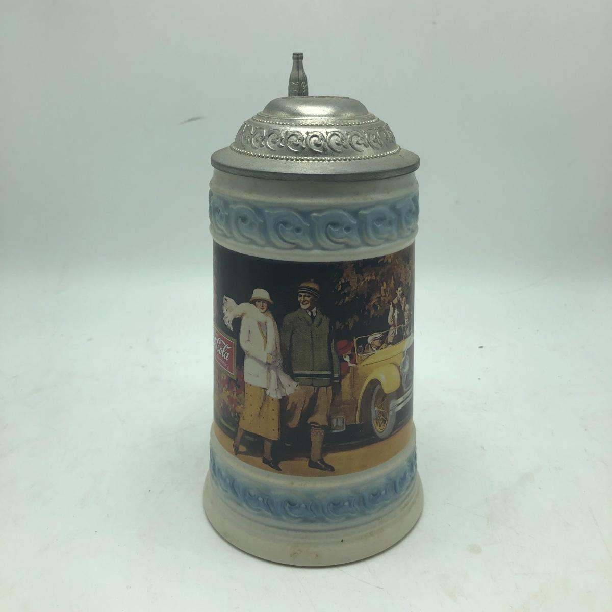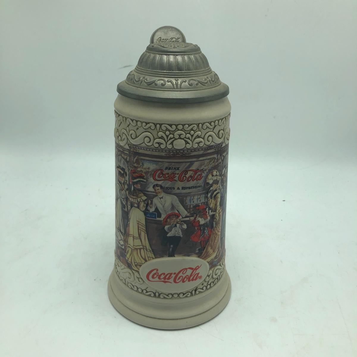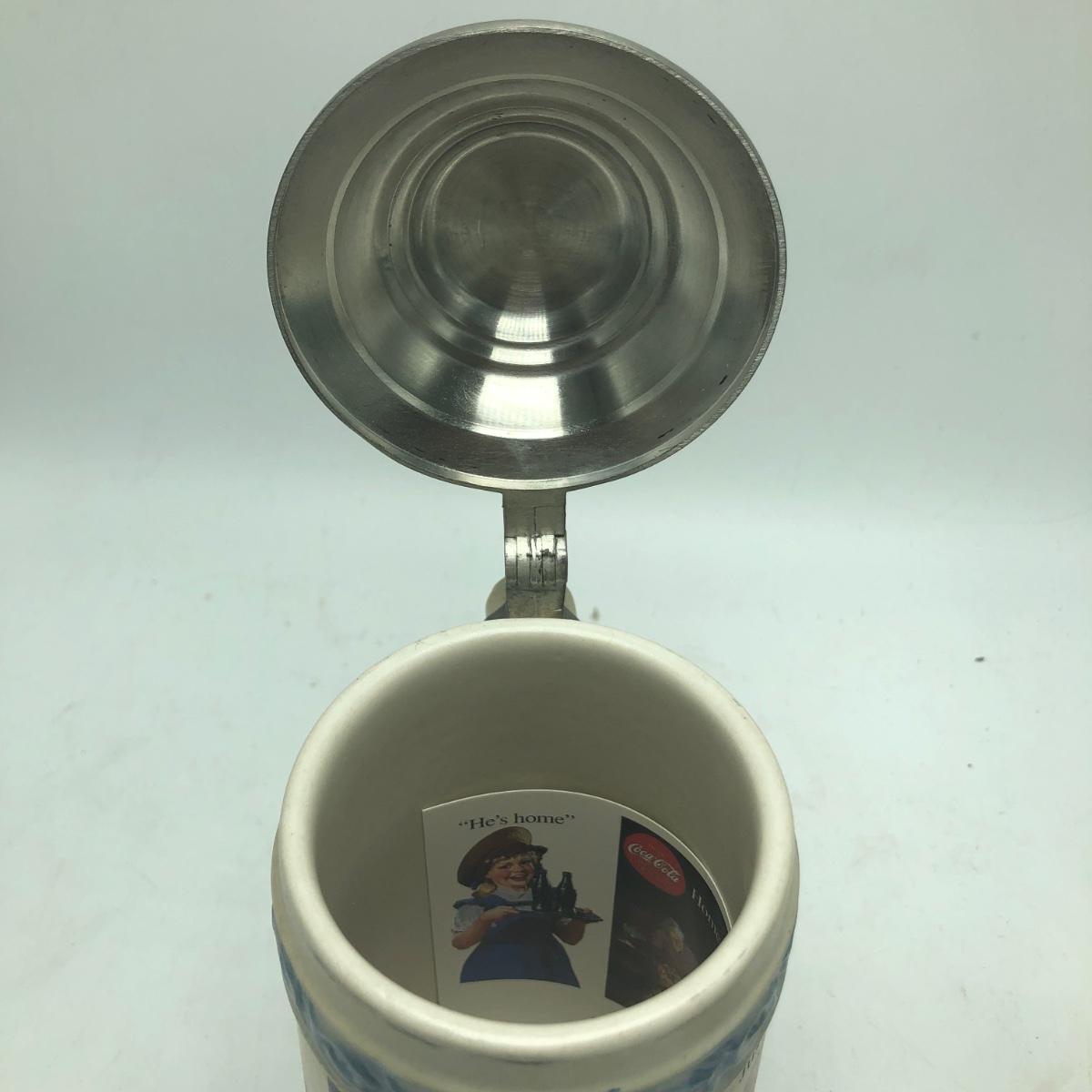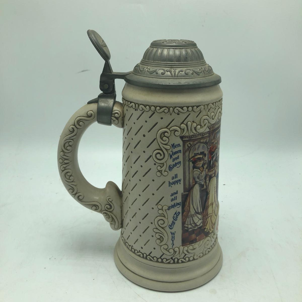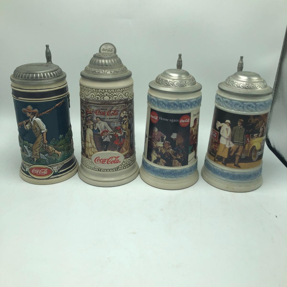 Lot includes four Coca Cola beer steins with pewter lids and COAs. Three steins are by the Gerz Co and one is by Ceramarte. Tallest stein measures 4.25” x 6” x 9”.