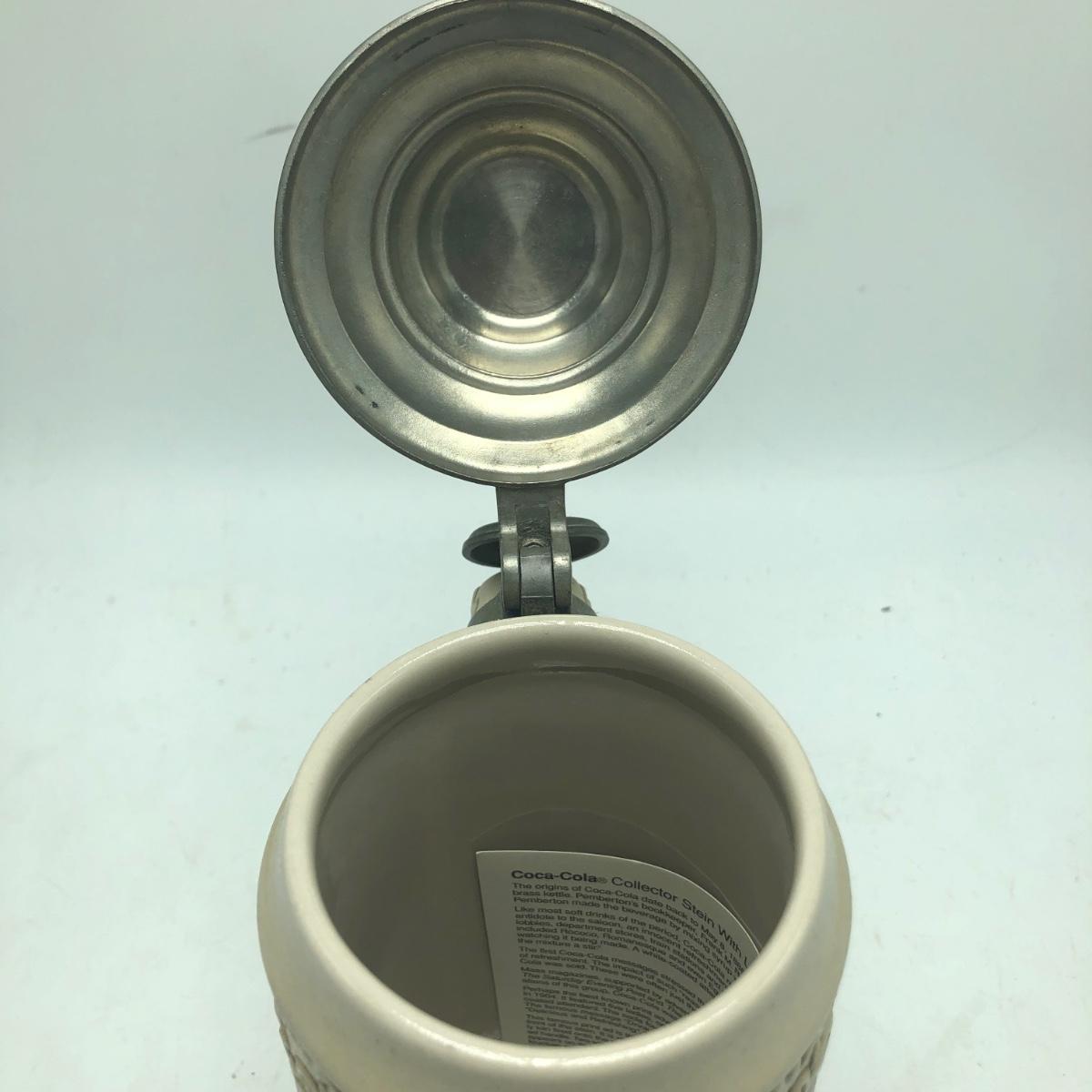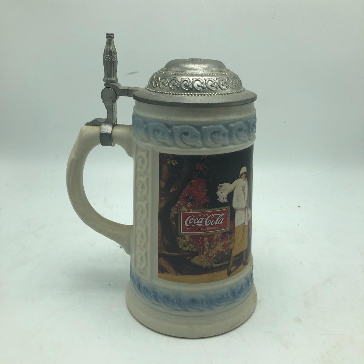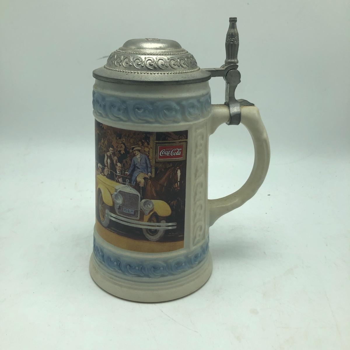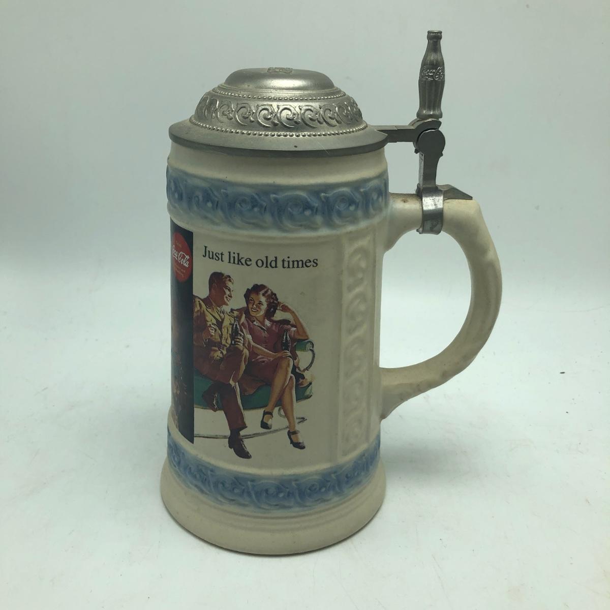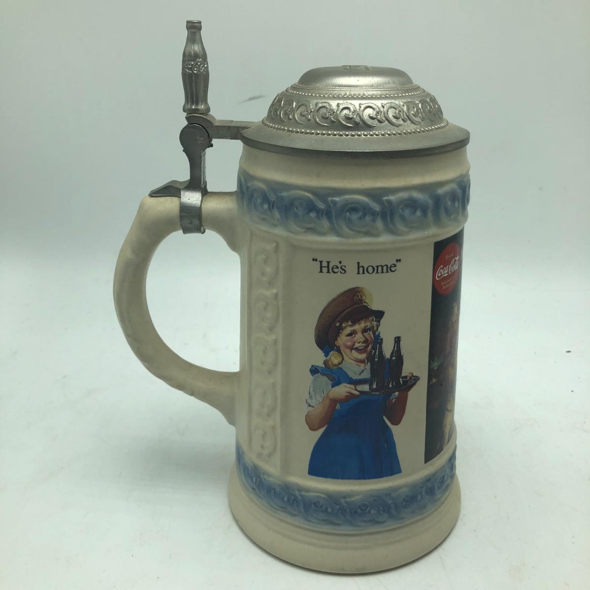 Lot includes four Coca Cola beer steins with pewter lids and COAs. Three steins are by the Gerz Co and one is by Ceramarte. Tallest stein measures 4.25” x 6” x 9”.