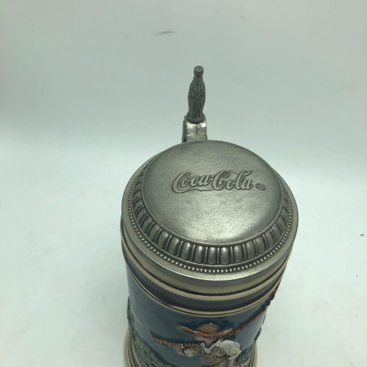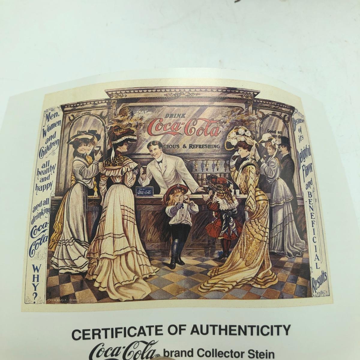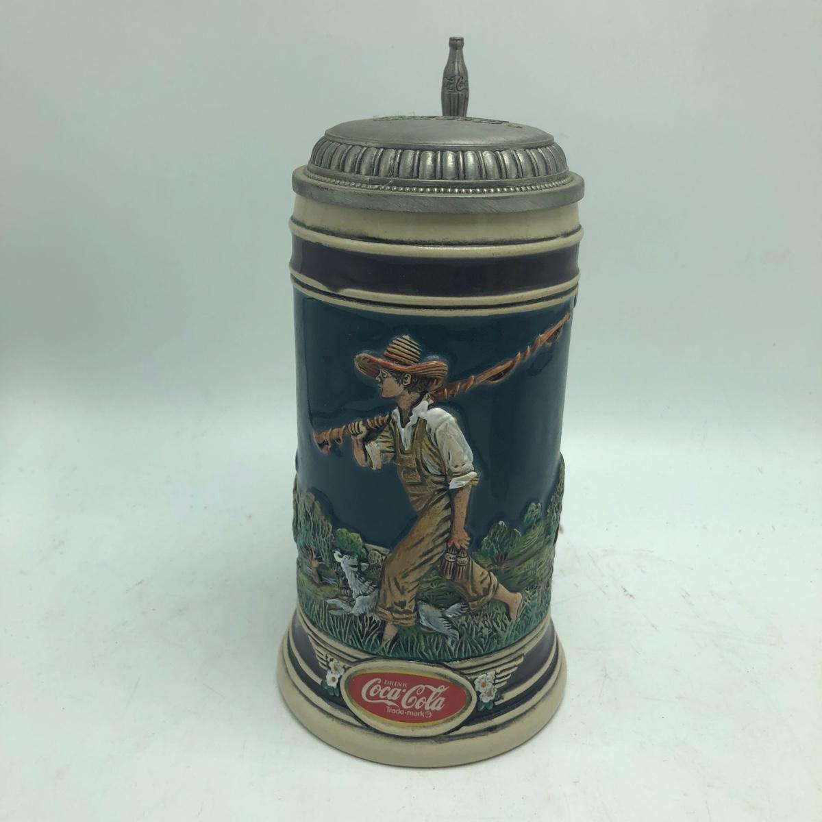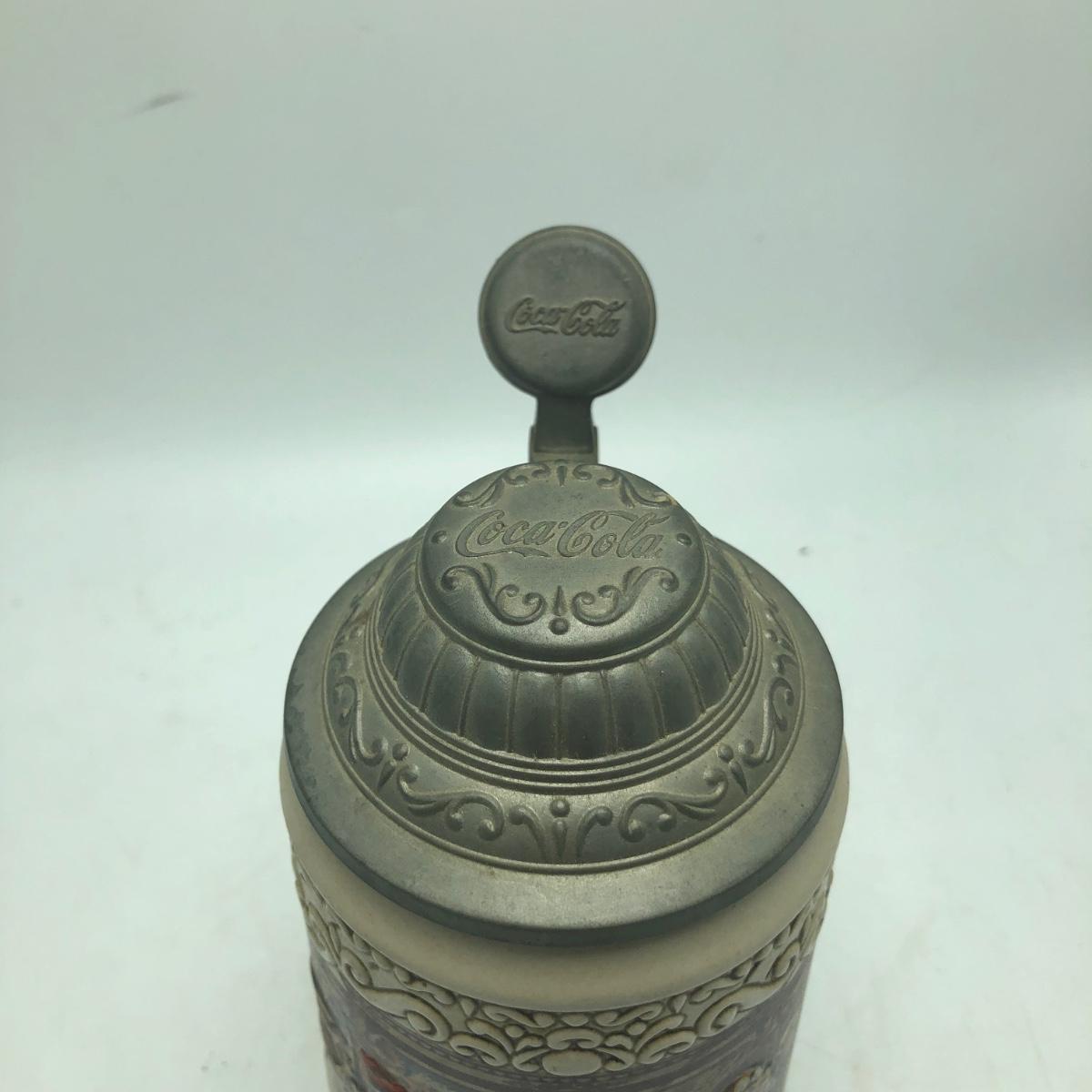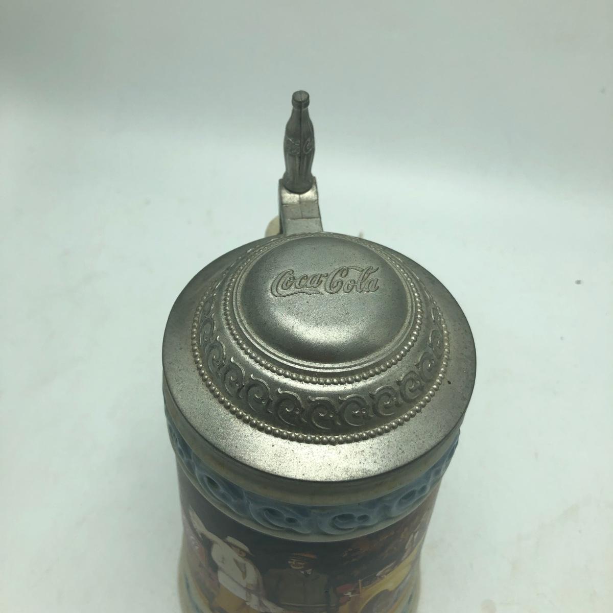 Lot includes four Coca Cola beer steins with pewter lids and COAs. Three steins are by the Gerz Co and one is by Ceramarte. Tallest stein measures 4.25” x 6” x 9”.