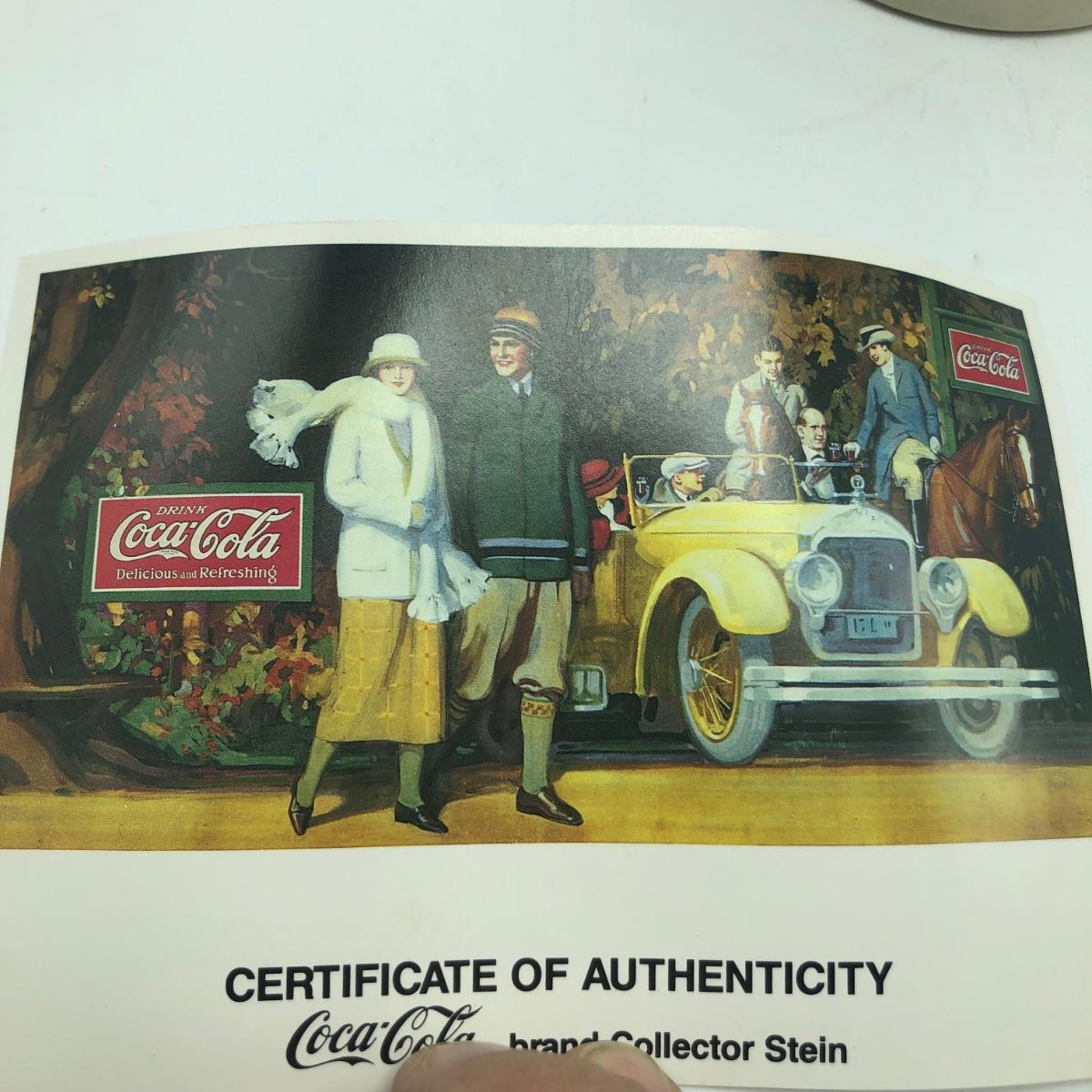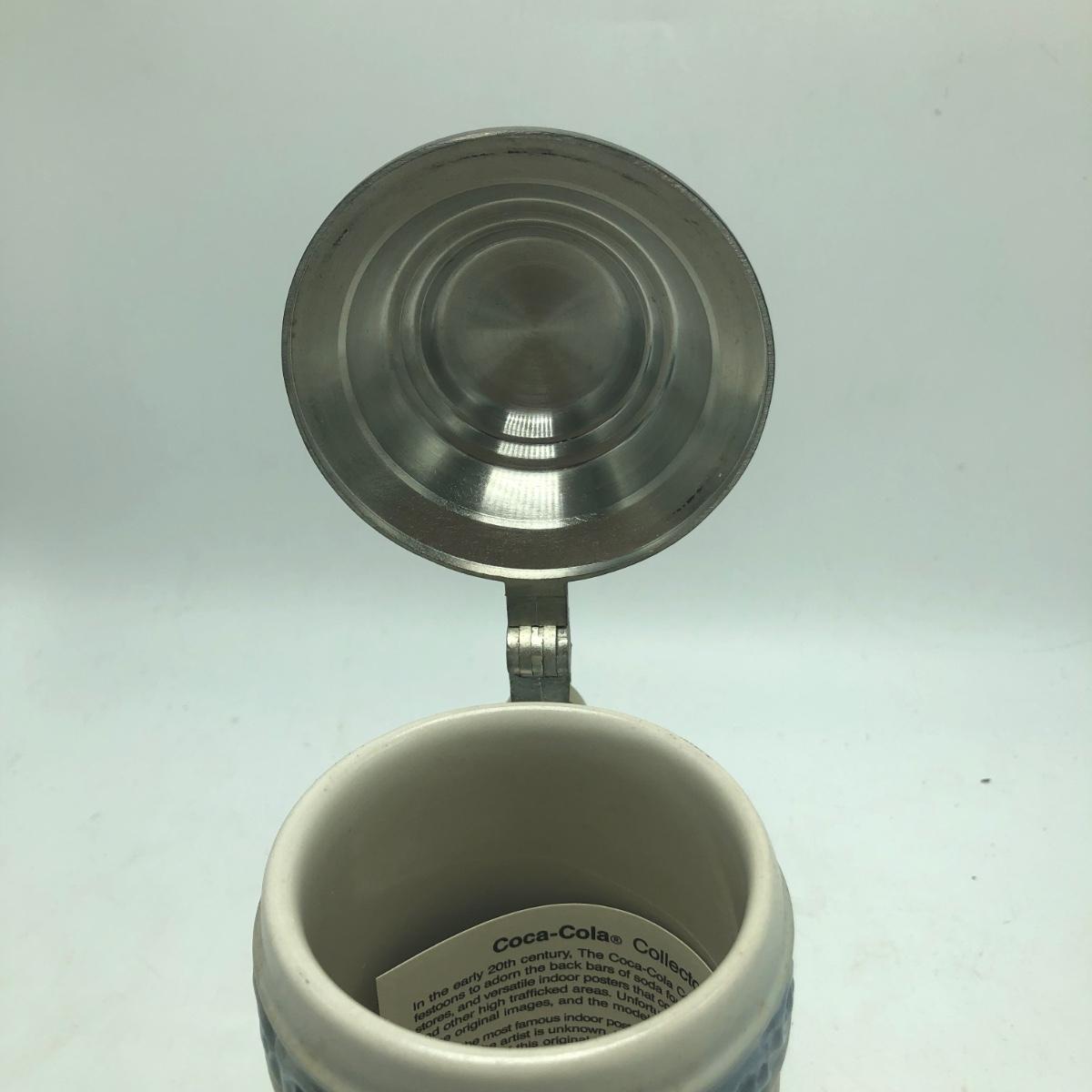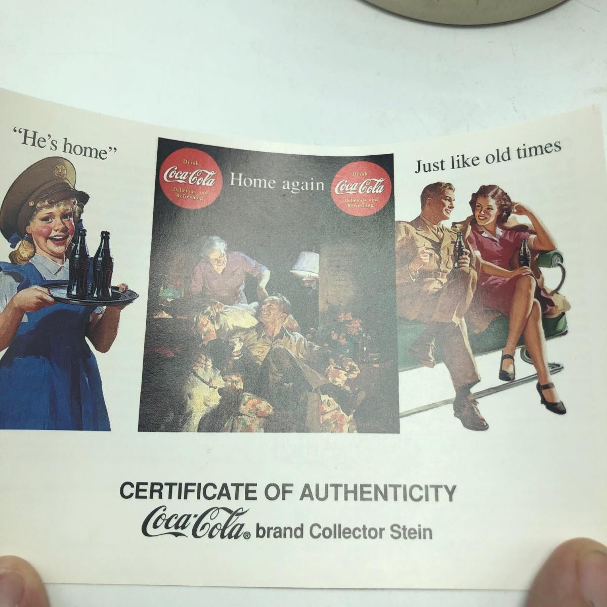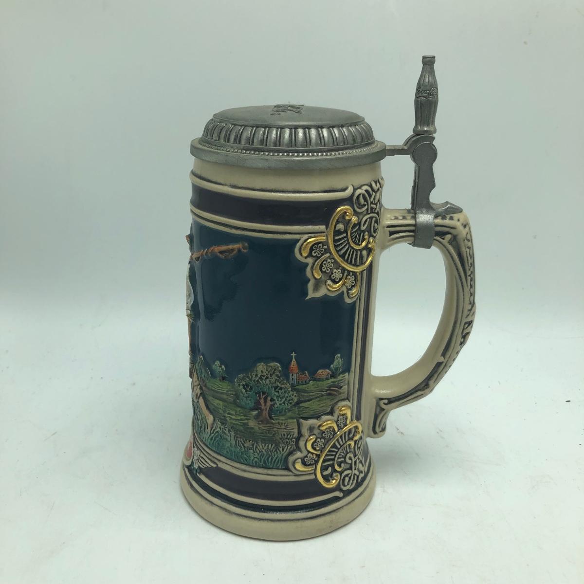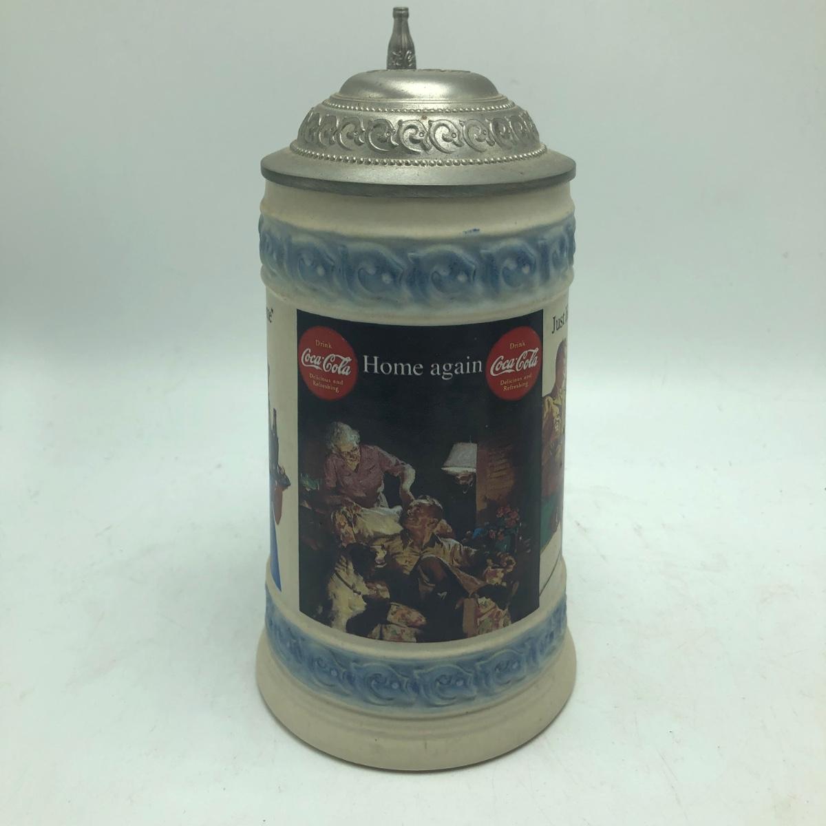 Lot includes four Coca Cola beer steins with pewter lids and COAs. Three steins are by the Gerz Co and one is by Ceramarte. Tallest stein measures 4.25” x 6” x 9”.