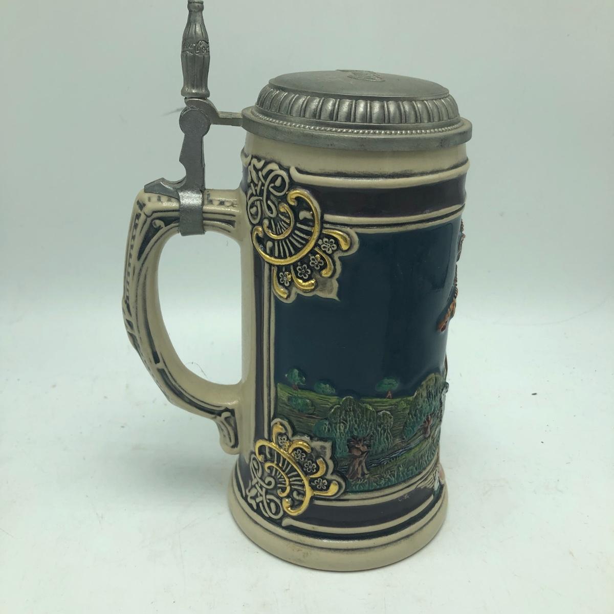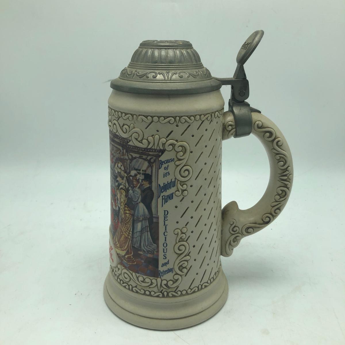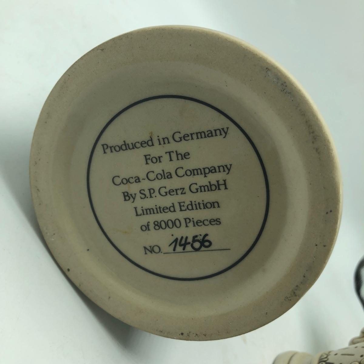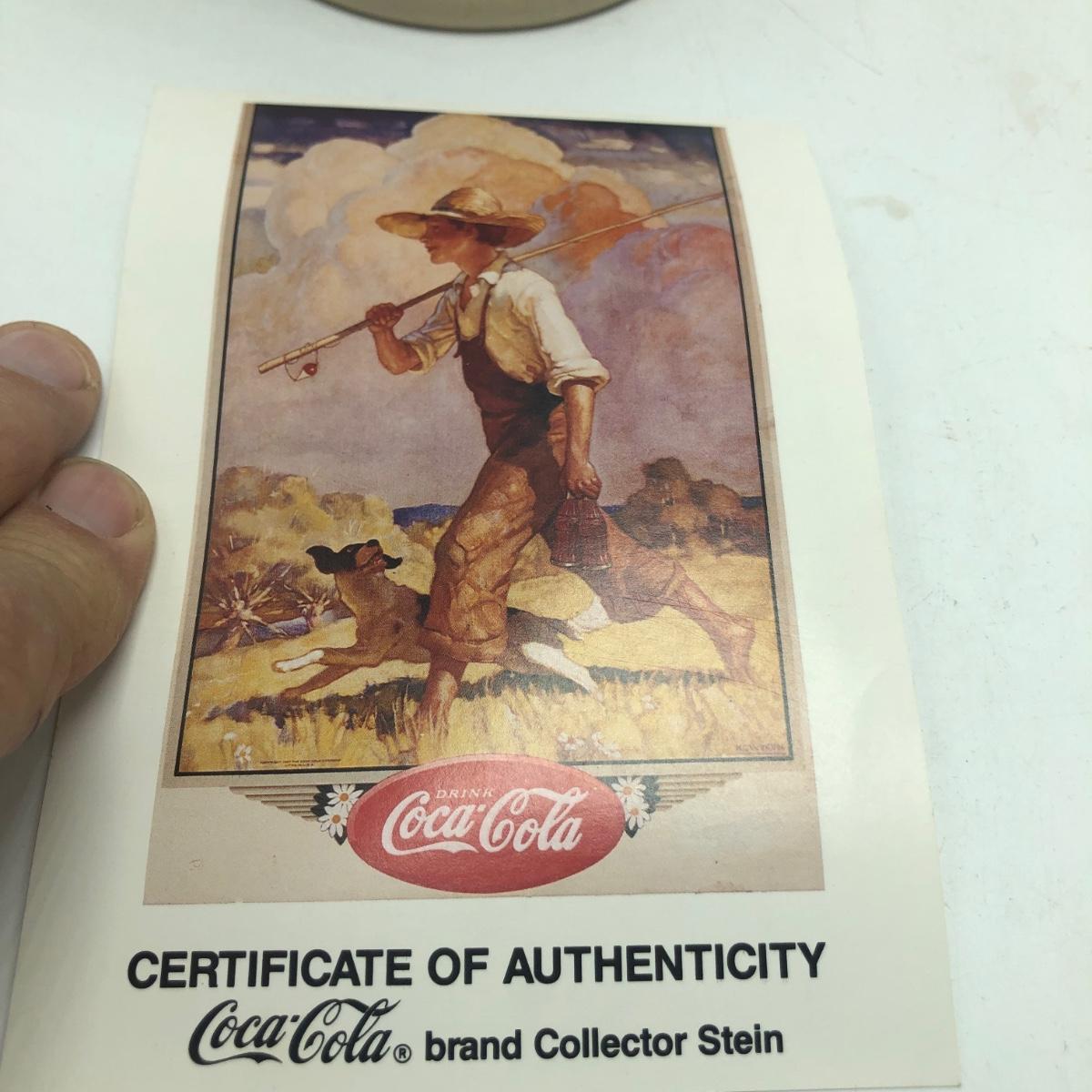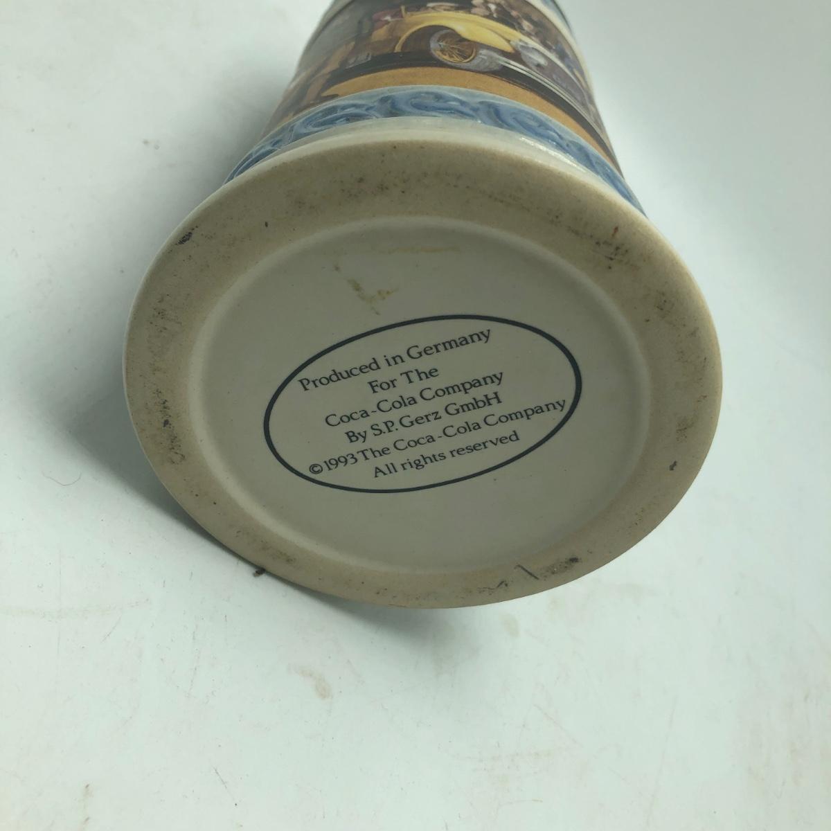 Lot includes four Coca Cola beer steins with pewter lids and COAs. Three steins are by the Gerz Co and one is by Ceramarte. Tallest stein measures 4.25” x 6” x 9”.
