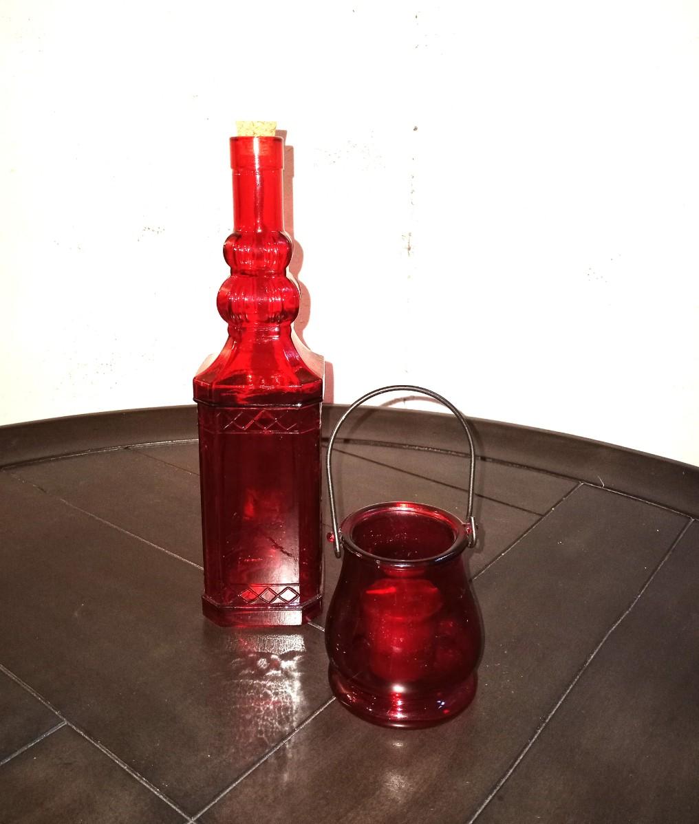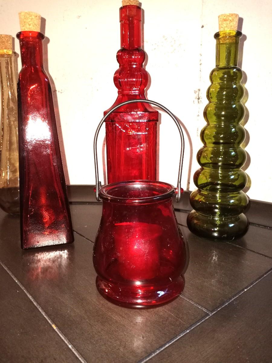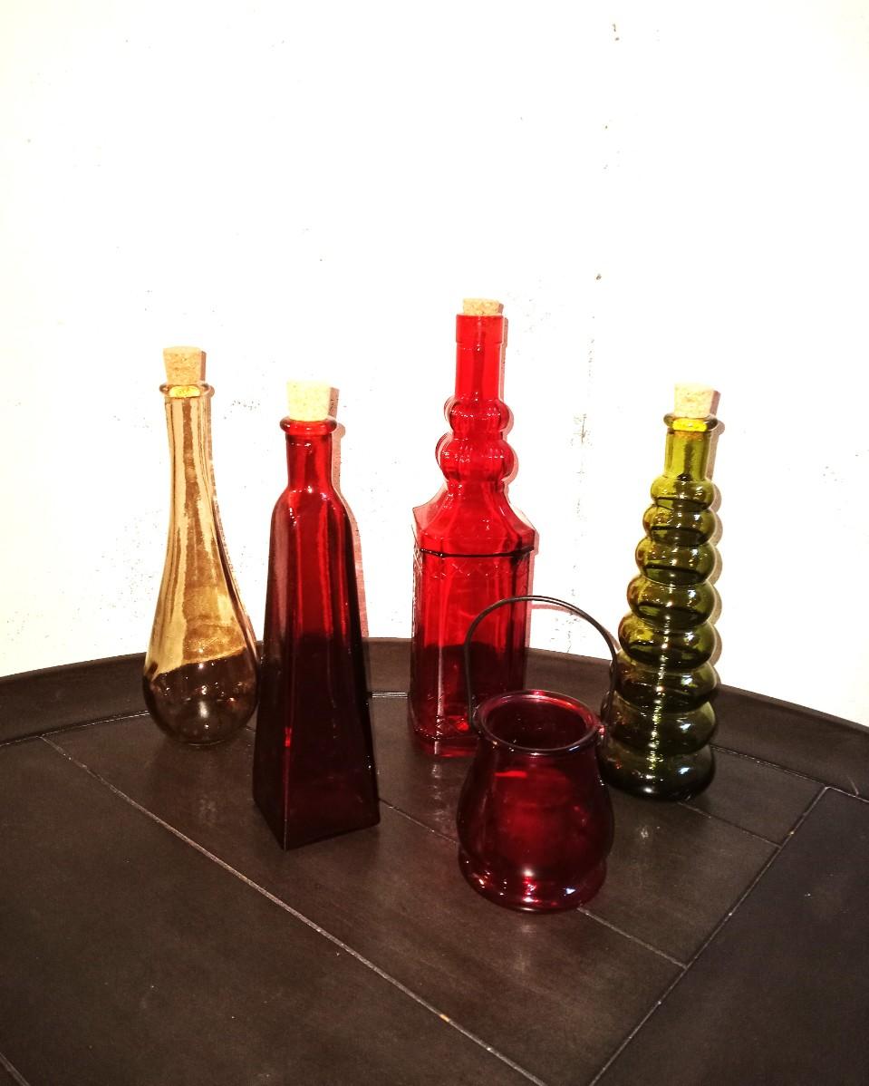 FOUR COLORED GLASS BOTTLES AND GLASS CANDLE HOLDER TALLEST IS 12"