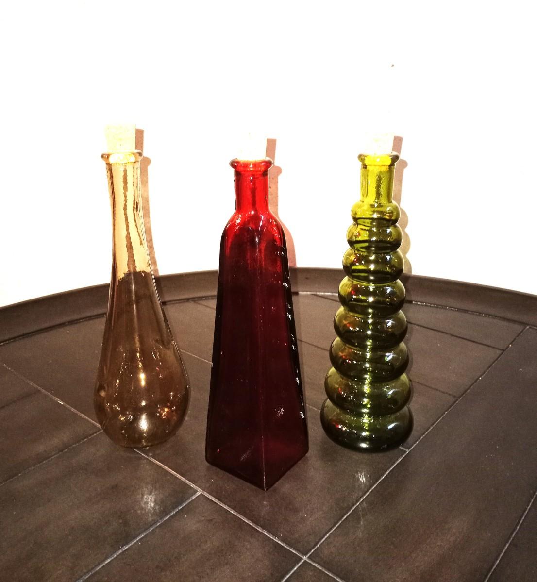 FOUR COLORED GLASS BOTTLES AND GLASS CANDLE HOLDER