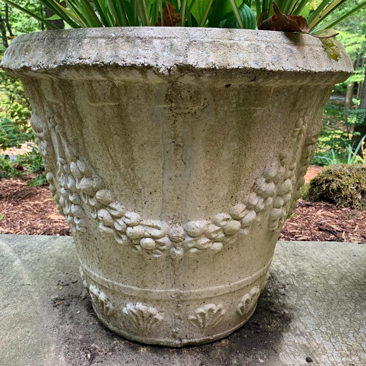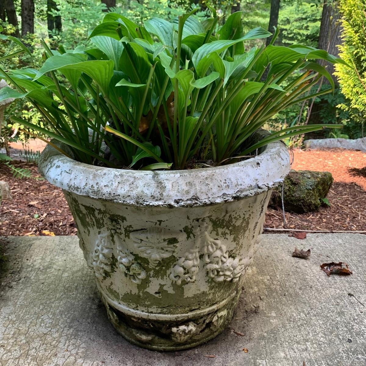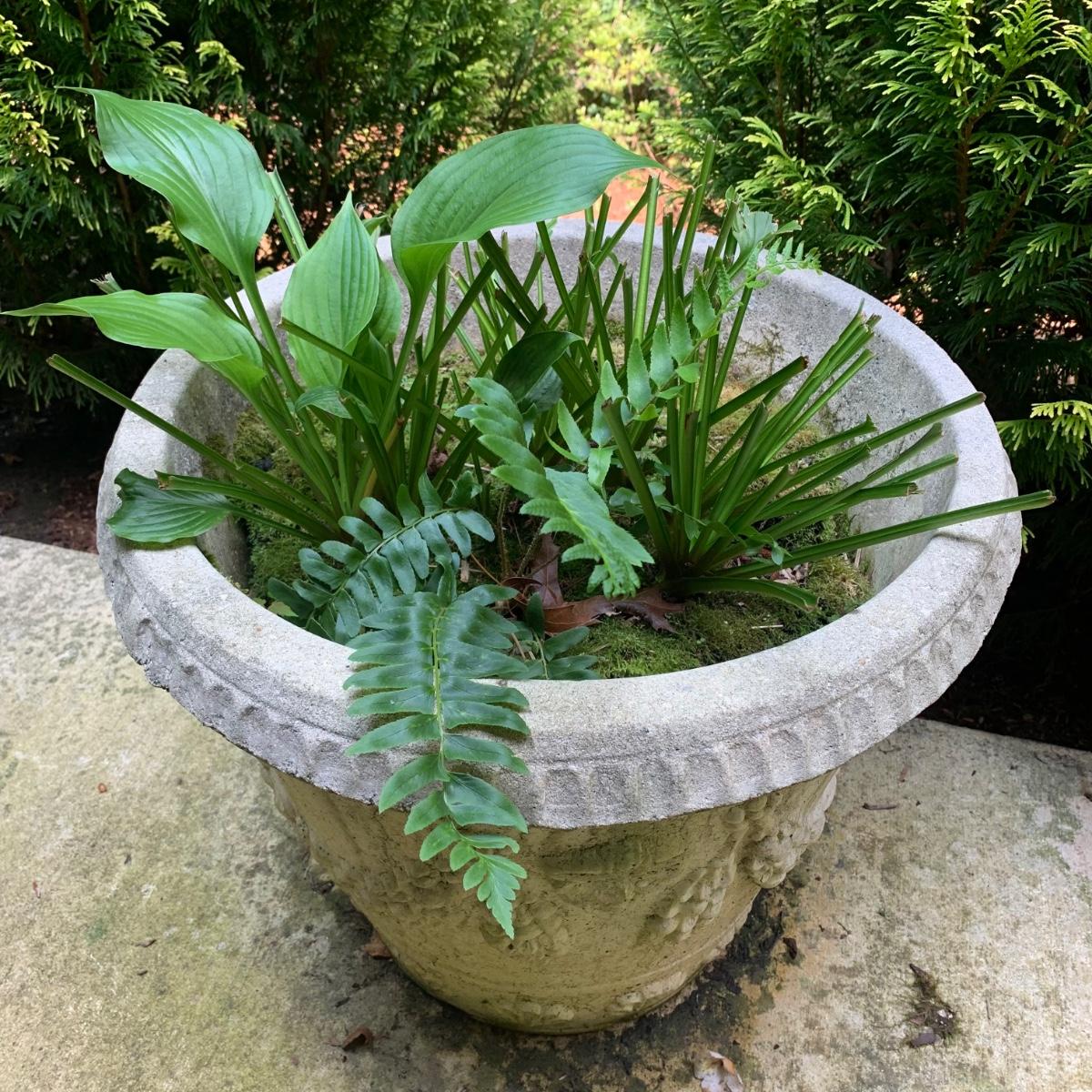 Four concrete planters. Largest measures approximately, 24.5”D x 23.5”H. Planters feature hostas, ferns, lily of the valley, and a variety of mosses. Local pickup only. Winning bidder must bring assistance to help move and load this item due to its weight and/or size.