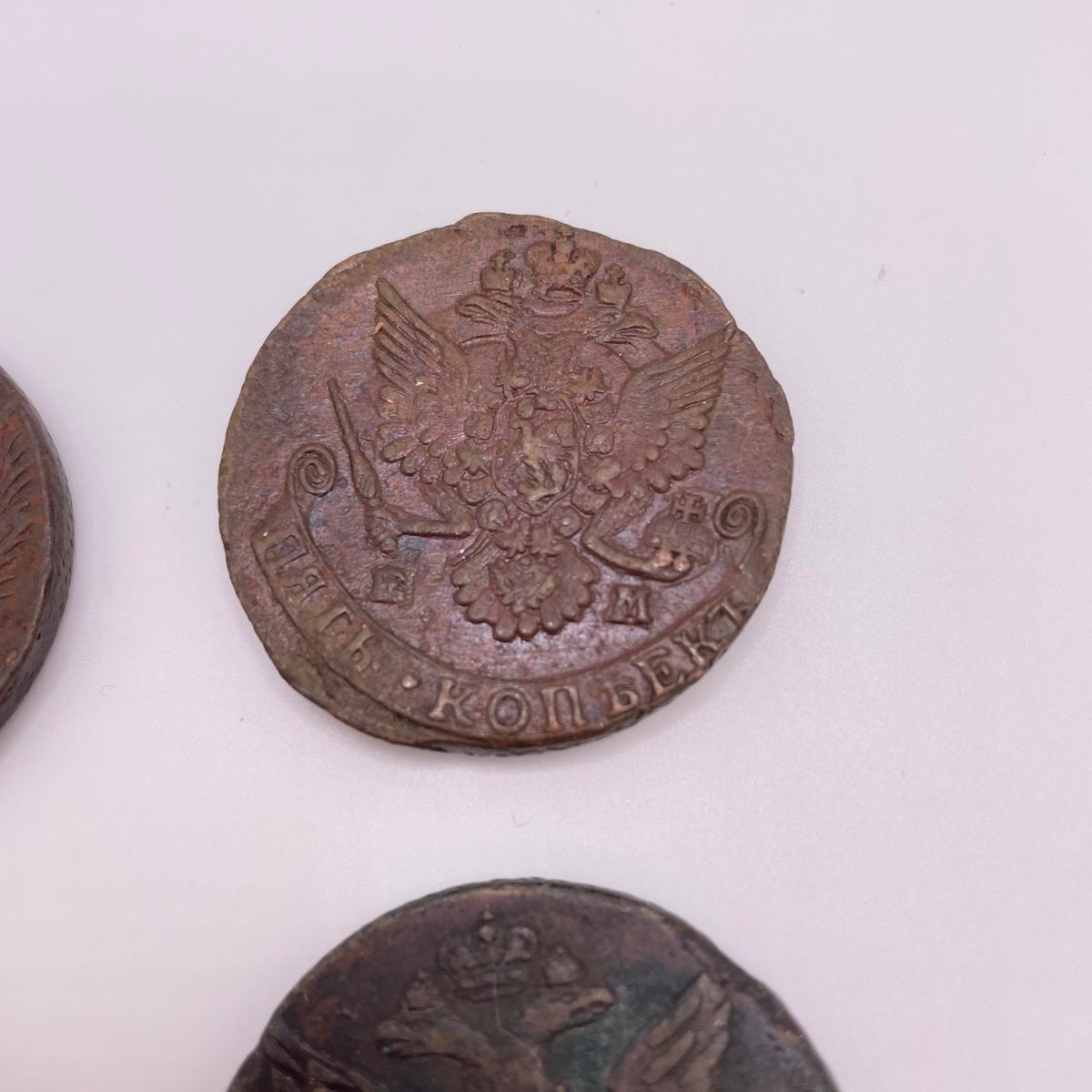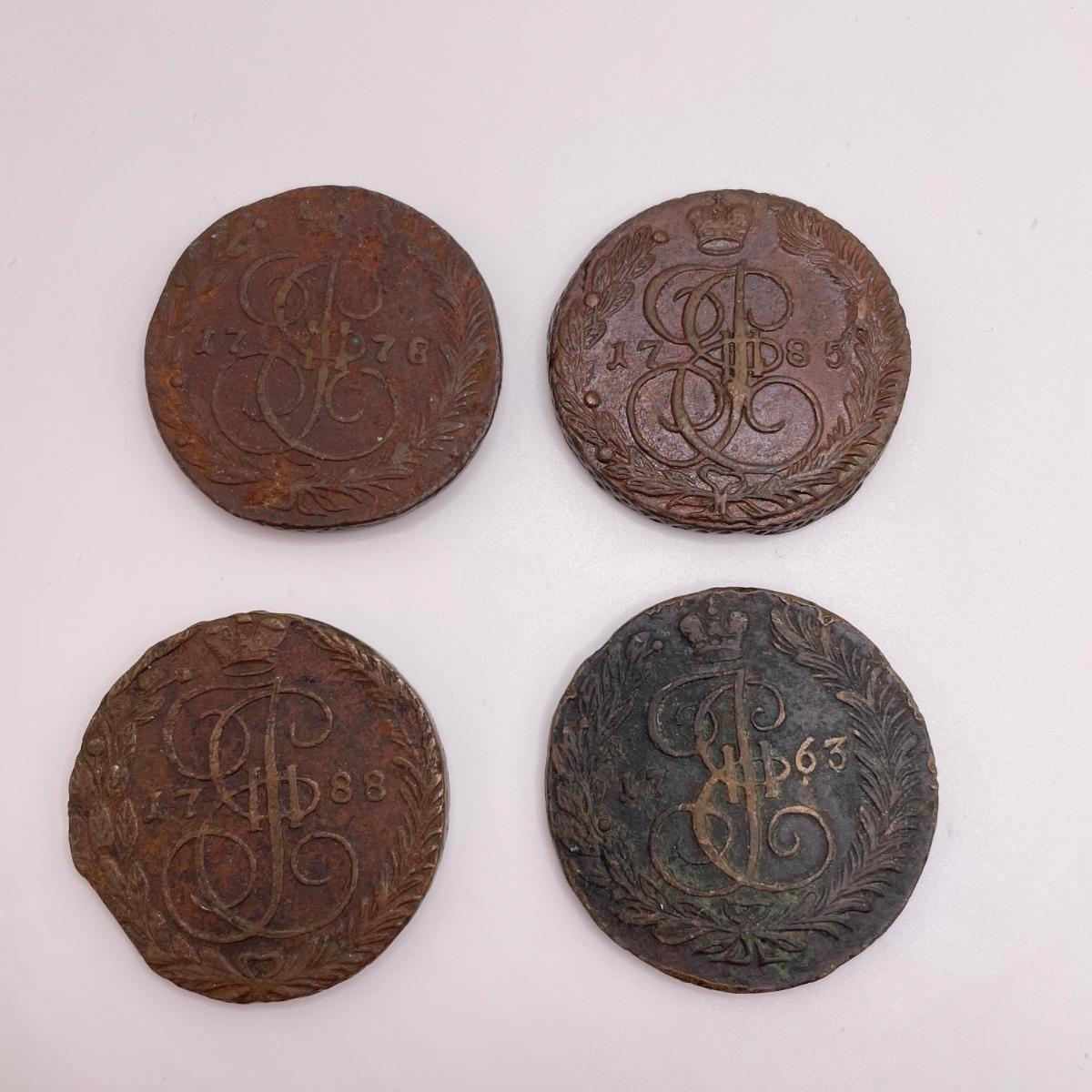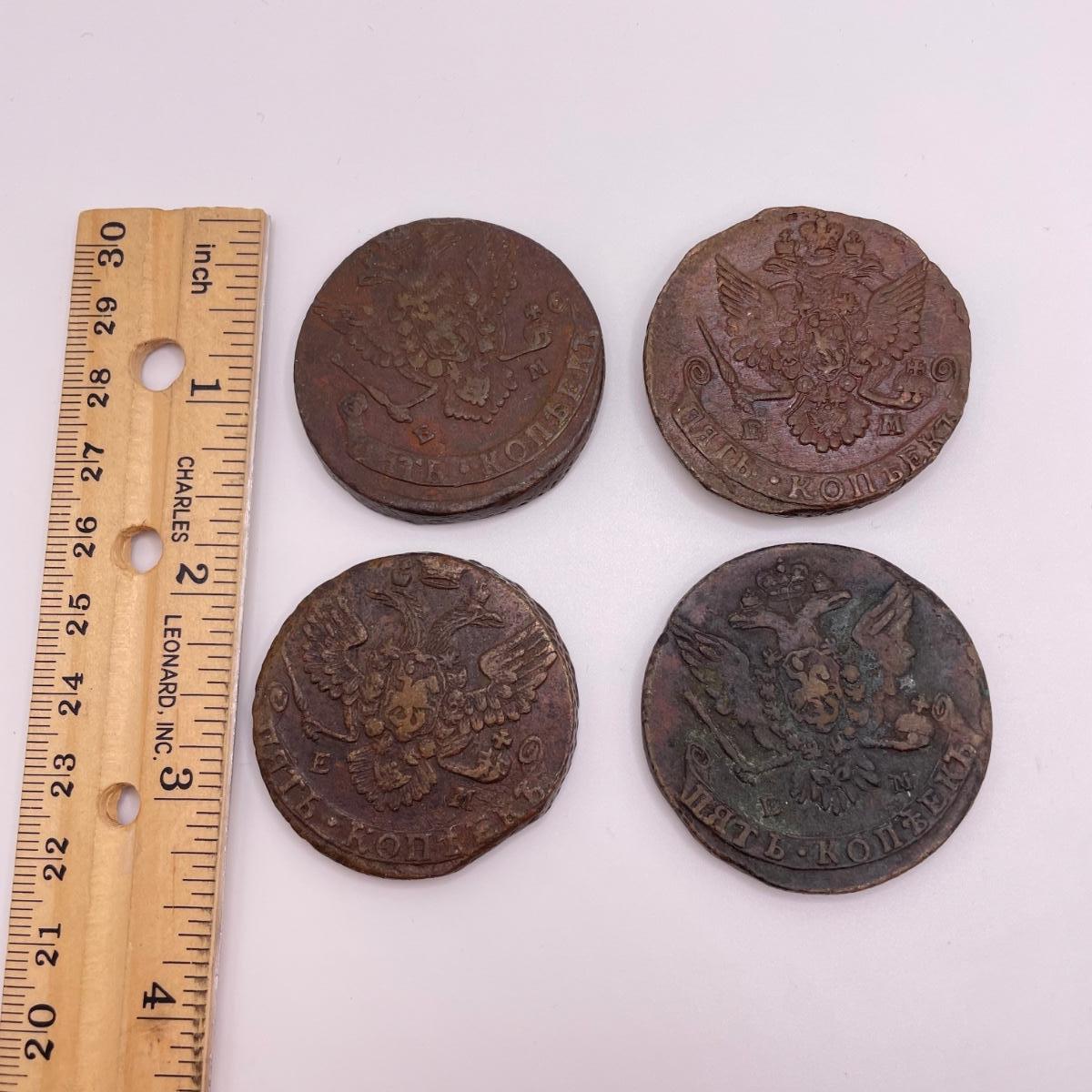 Four heavy coins that appear to be Russian; Catherine the Great era 5 Kopeks. All sales are final. No returns or refunds. Please bid accordingly. Shipping available.