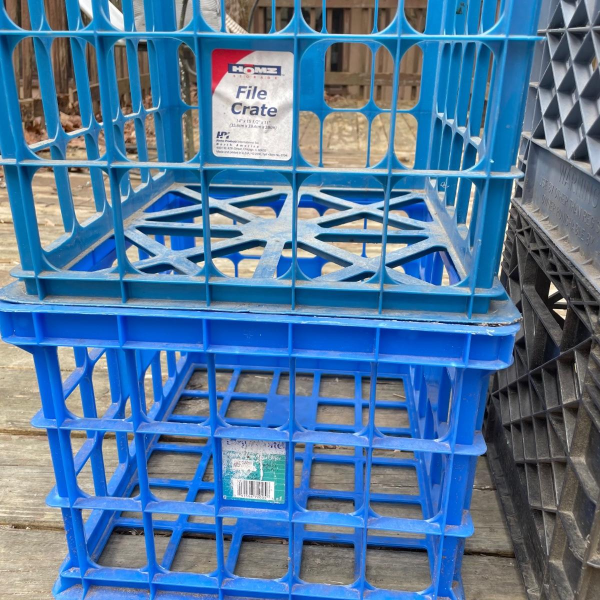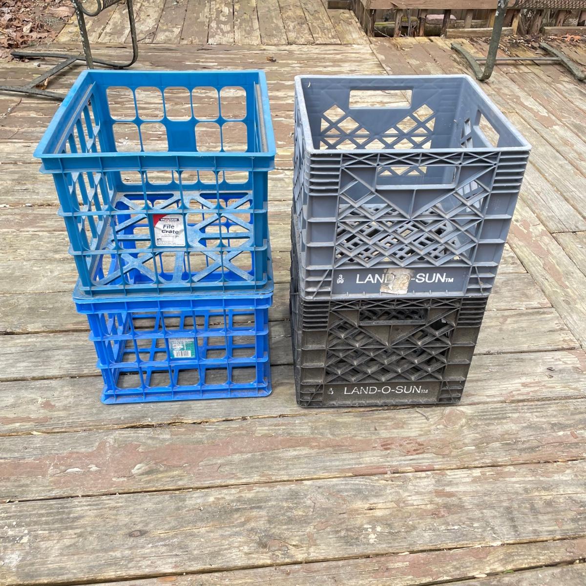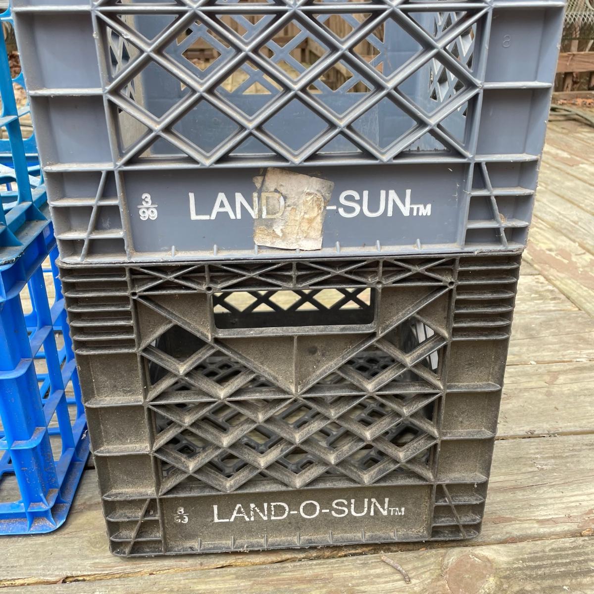 Two Land O Sun heavy duty crates plus two blue file crates. The sizes of the blue crates vary just slightly. The Land O Sun crates measure about 13”sq x 10.5”. See images. Local pick up only.