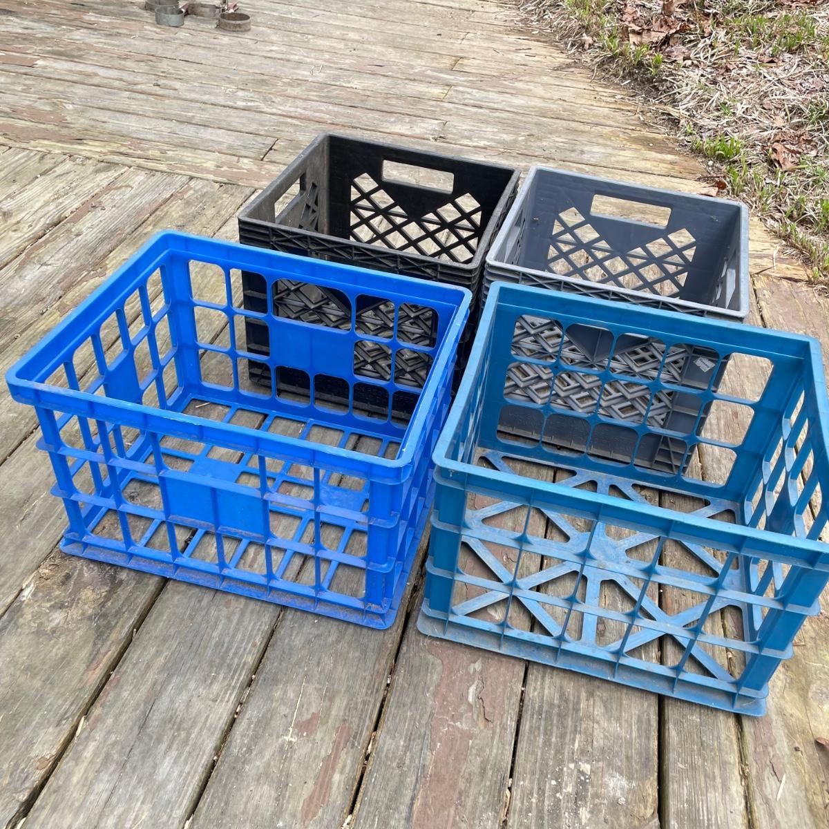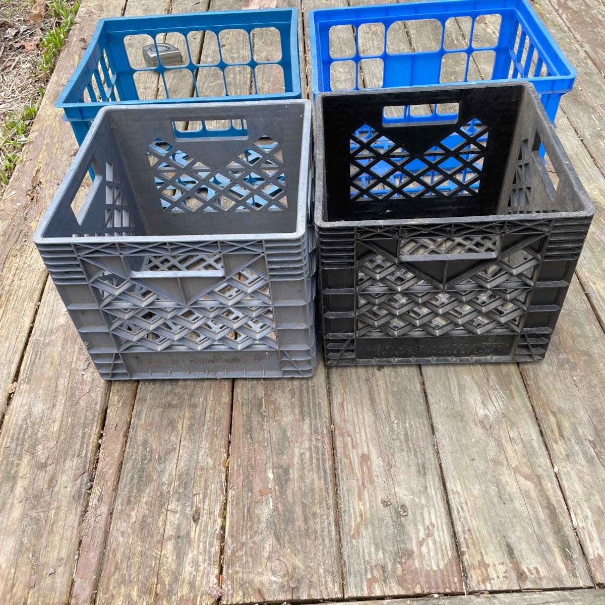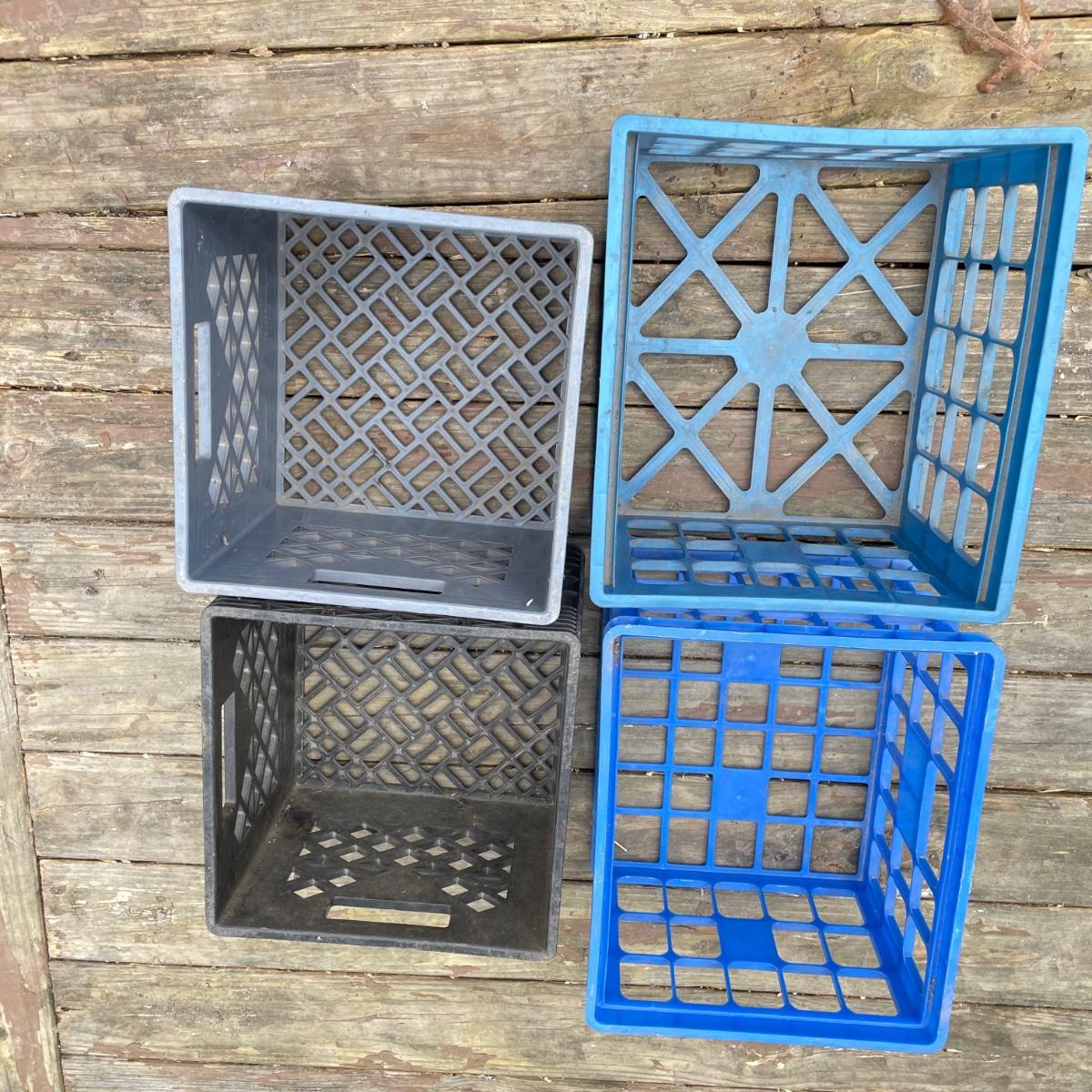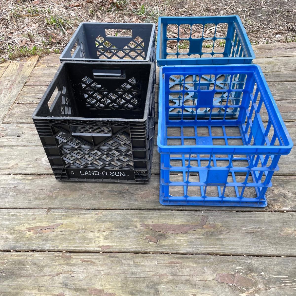 Two Land O Sun heavy duty crates plus two blue file crates. The sizes of the blue crates vary just slightly. The Land O Sun crates measure about 13”sq x 10.5”. See images. Local pick up only.